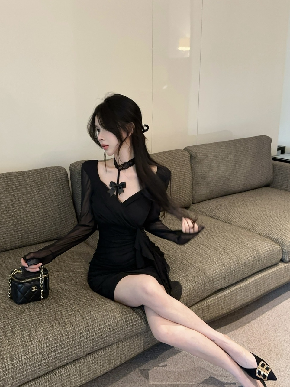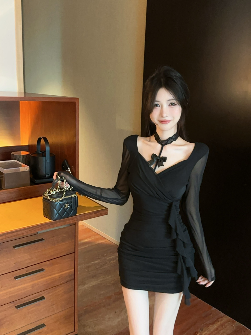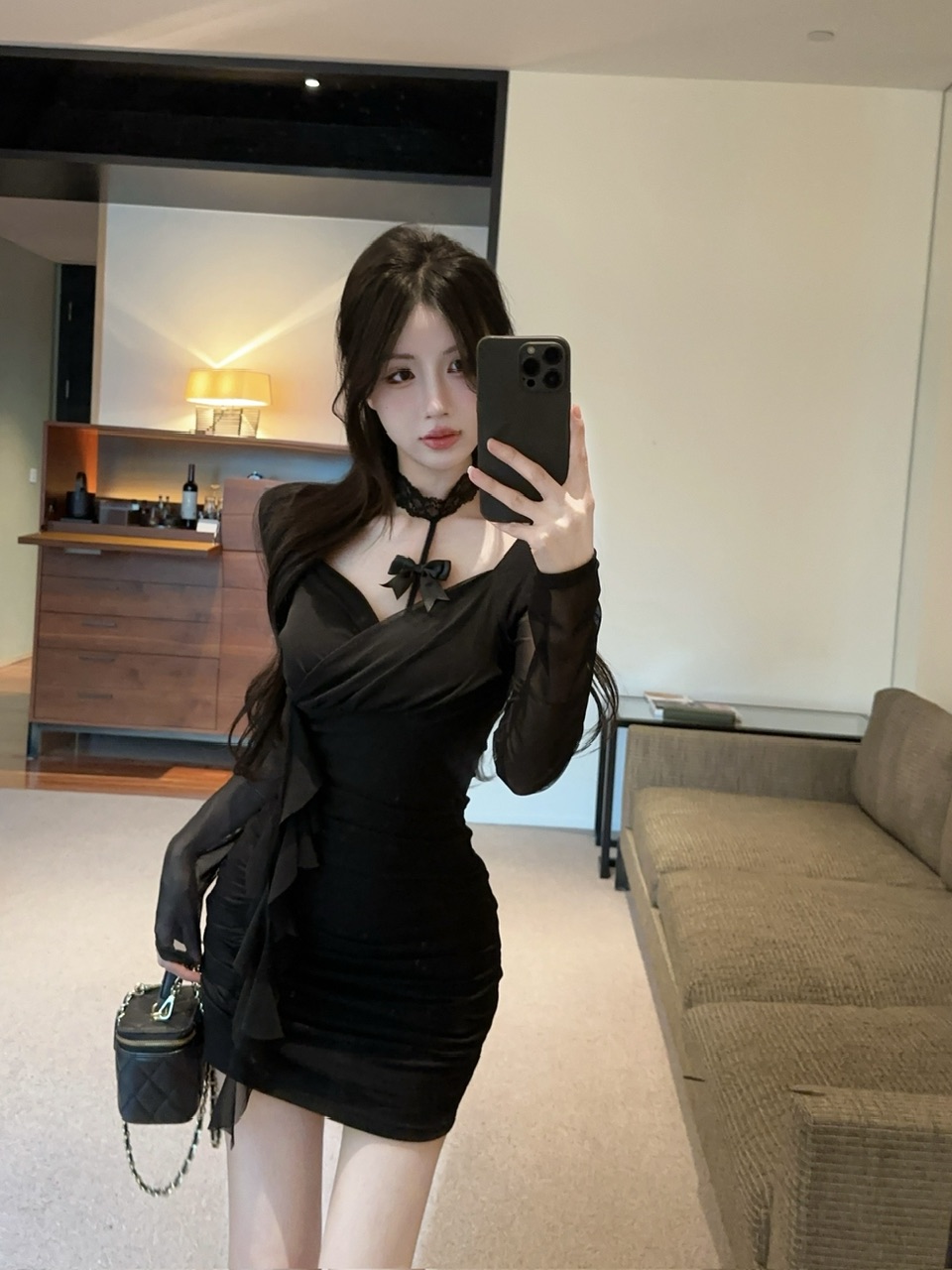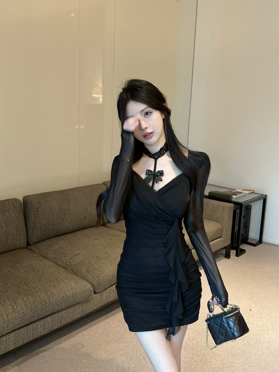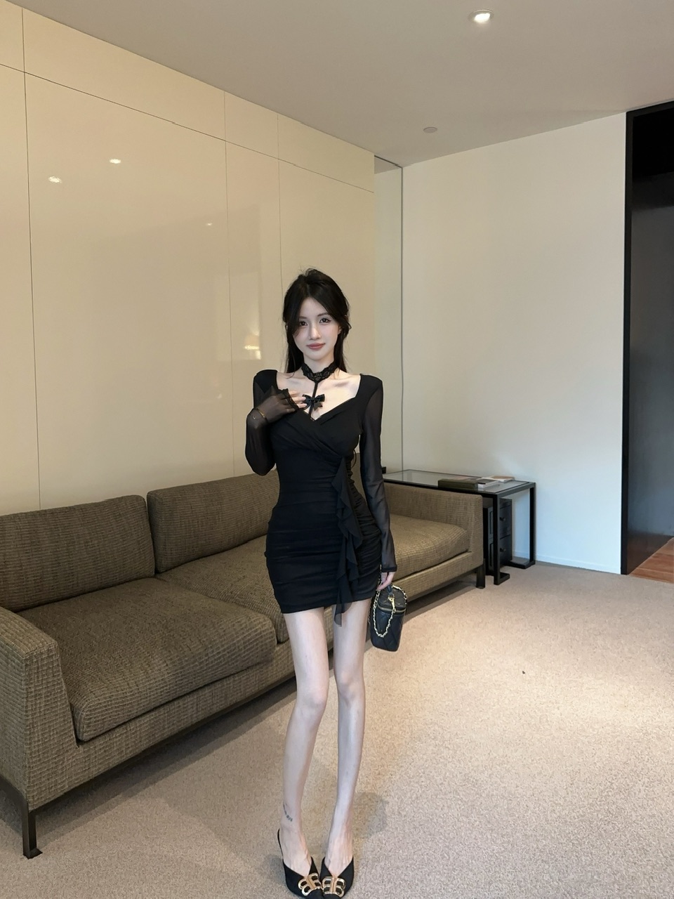 纯欲风辣妹露锁骨黑色长袖网纱性感连衣裙秋季收腰显瘦气质包臀裙