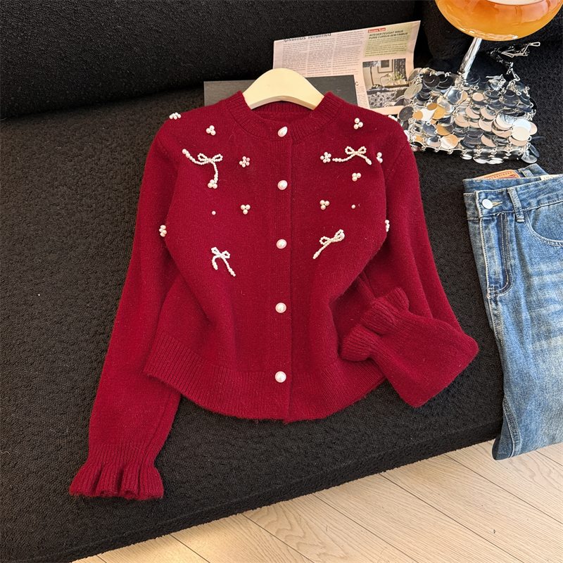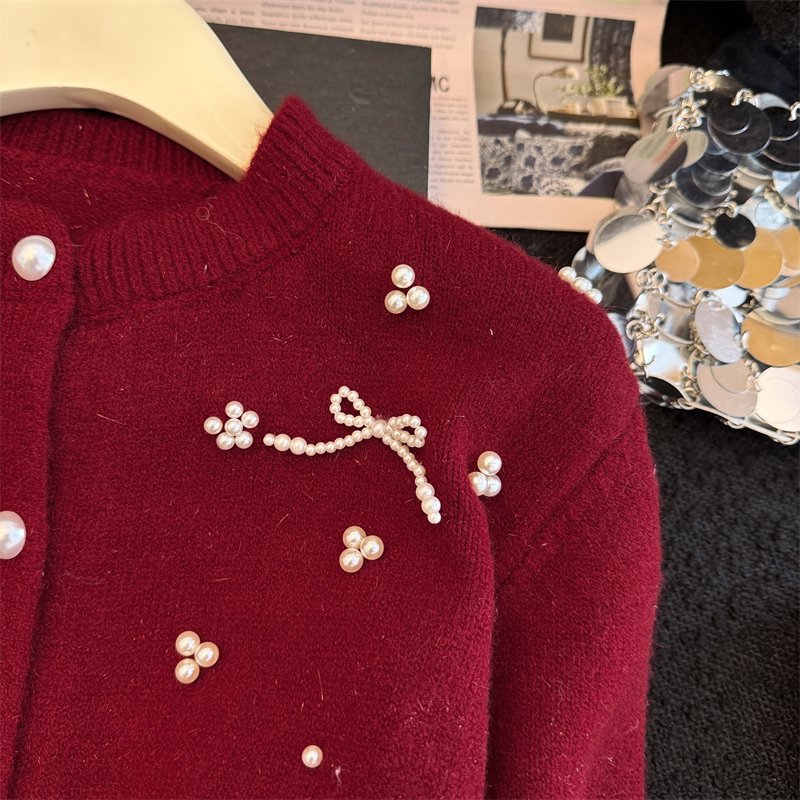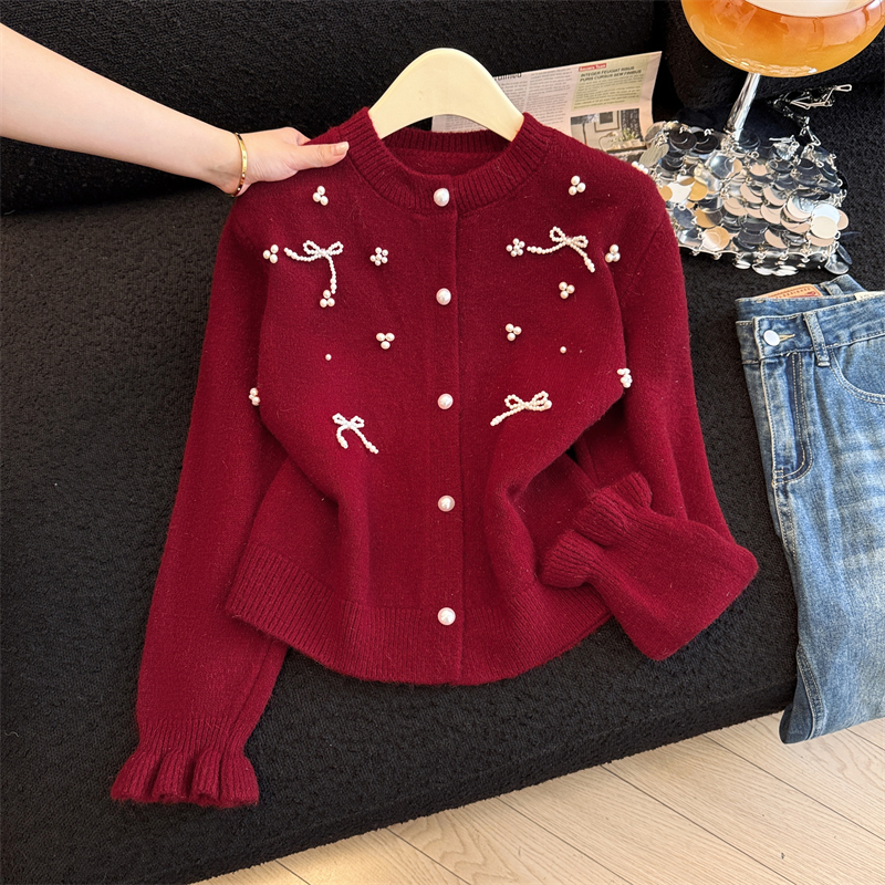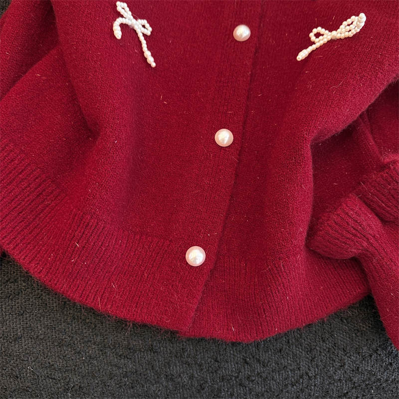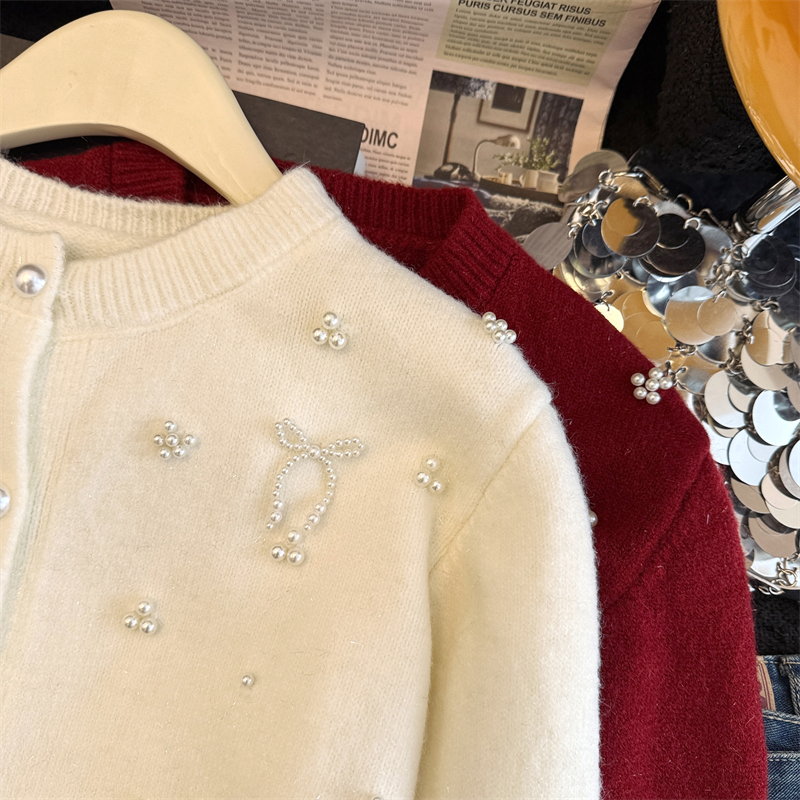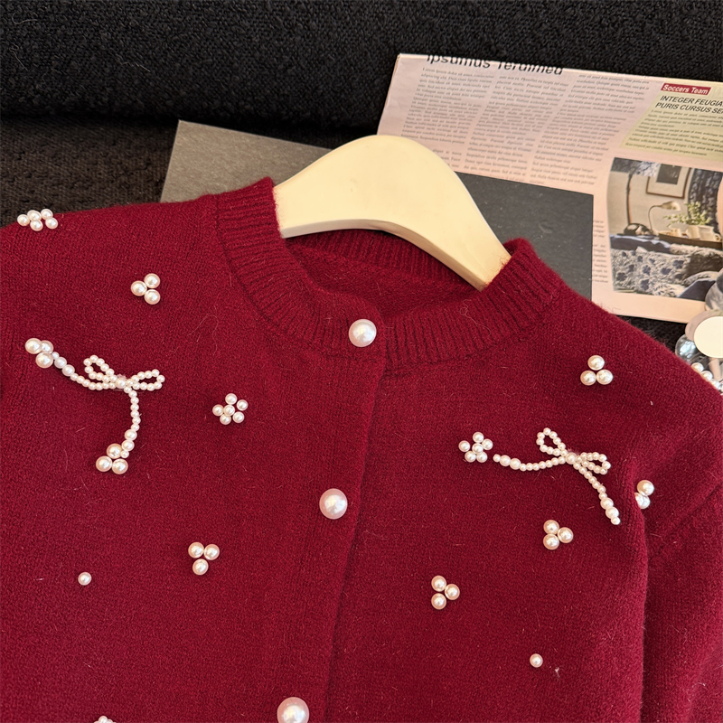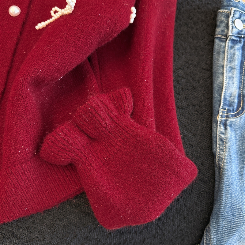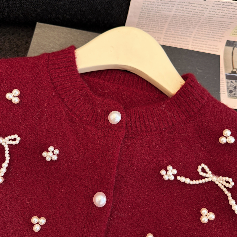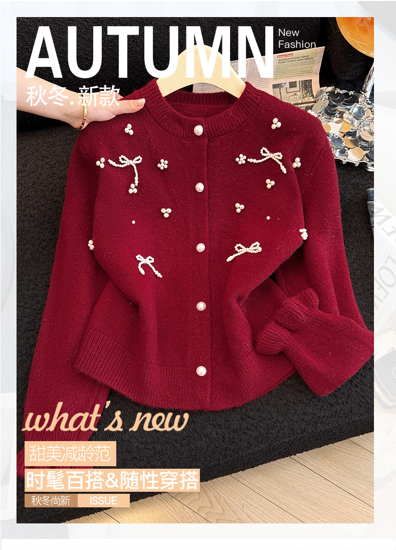 세련된 디자인의 2026년 신상 레드 비즈 장식 리본 스웨터 가디건의 실제 사진입니다.