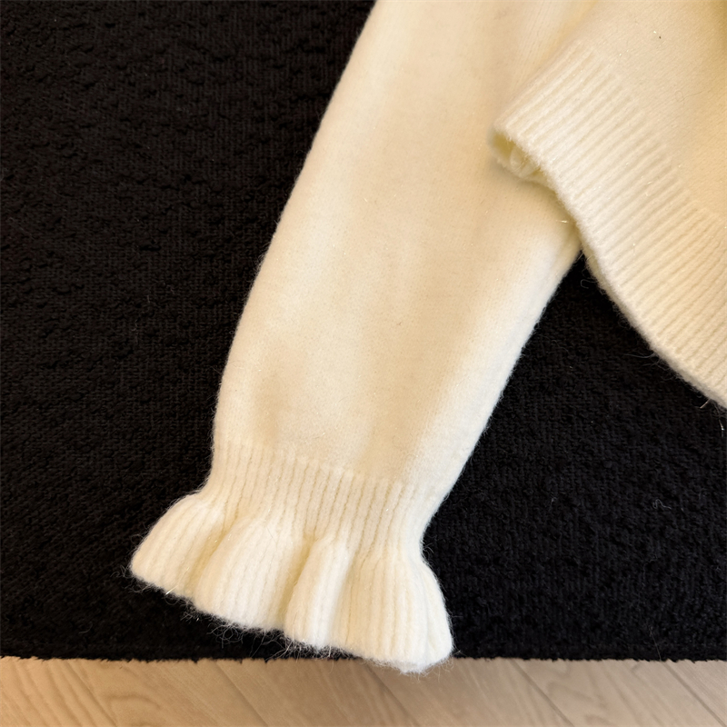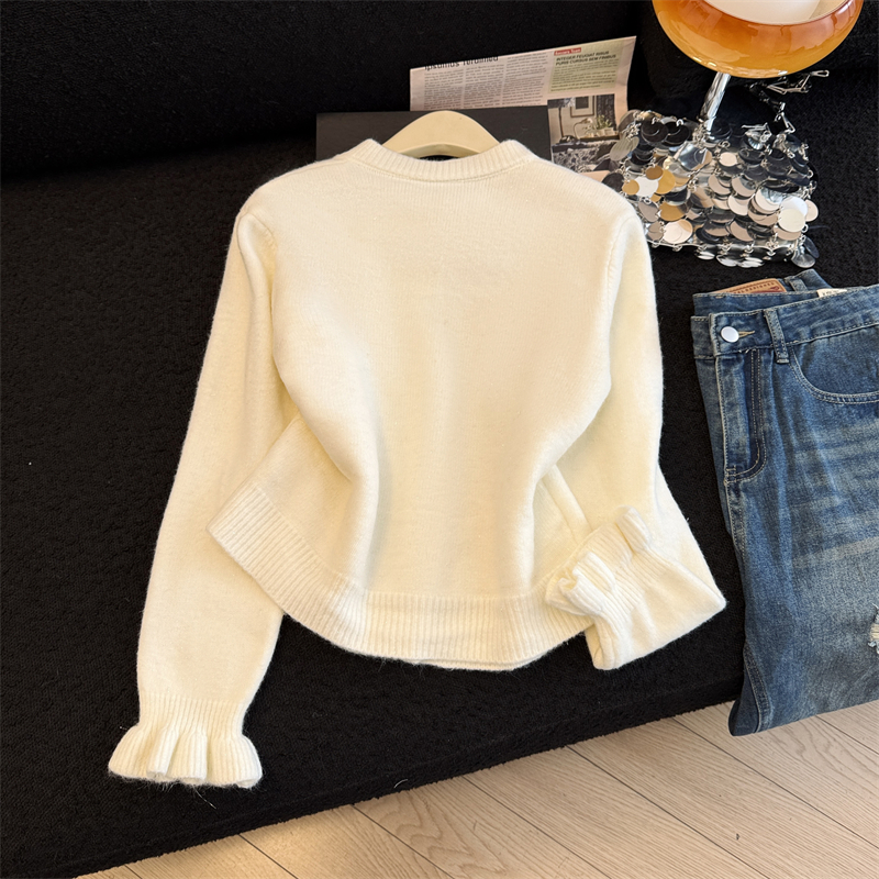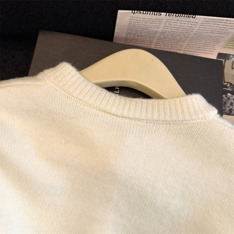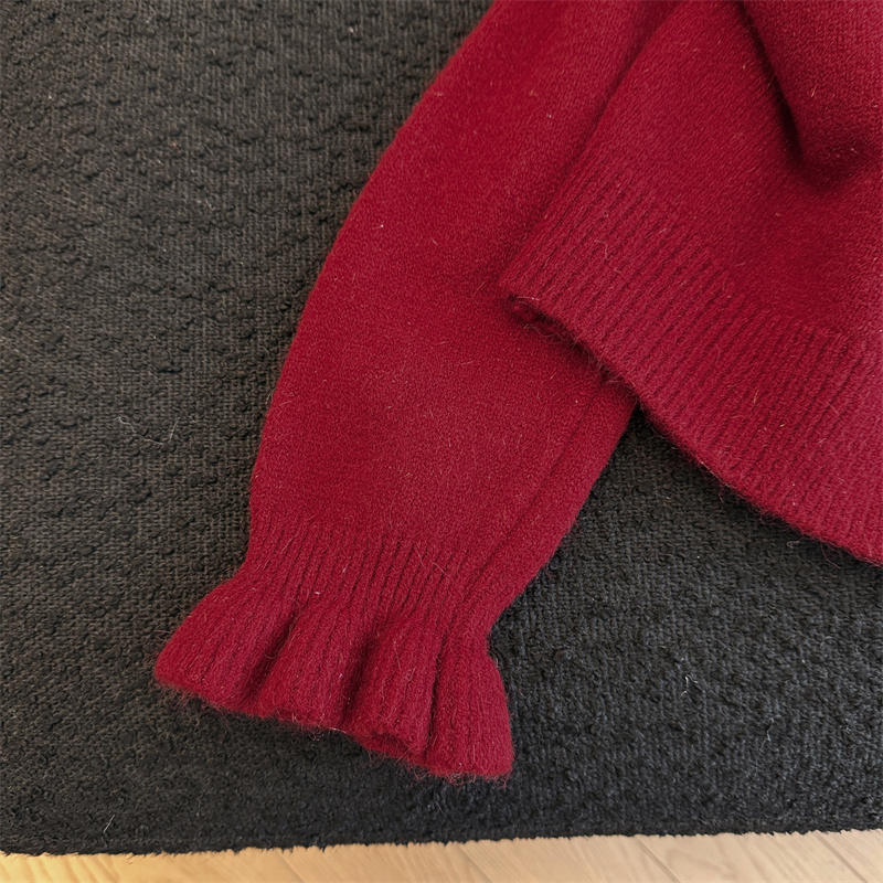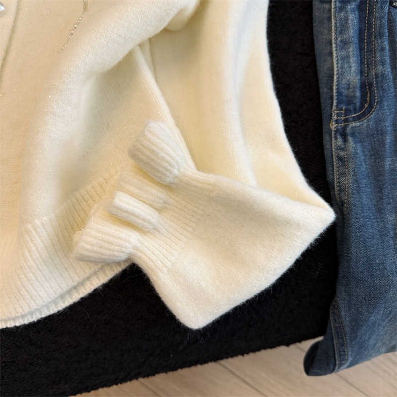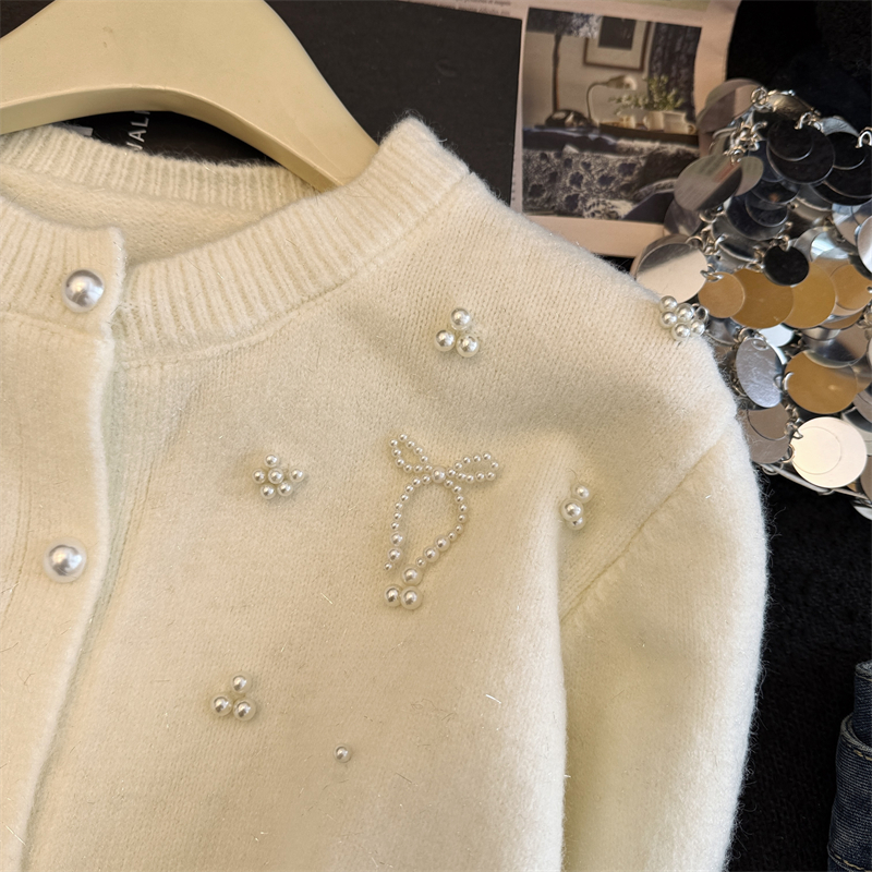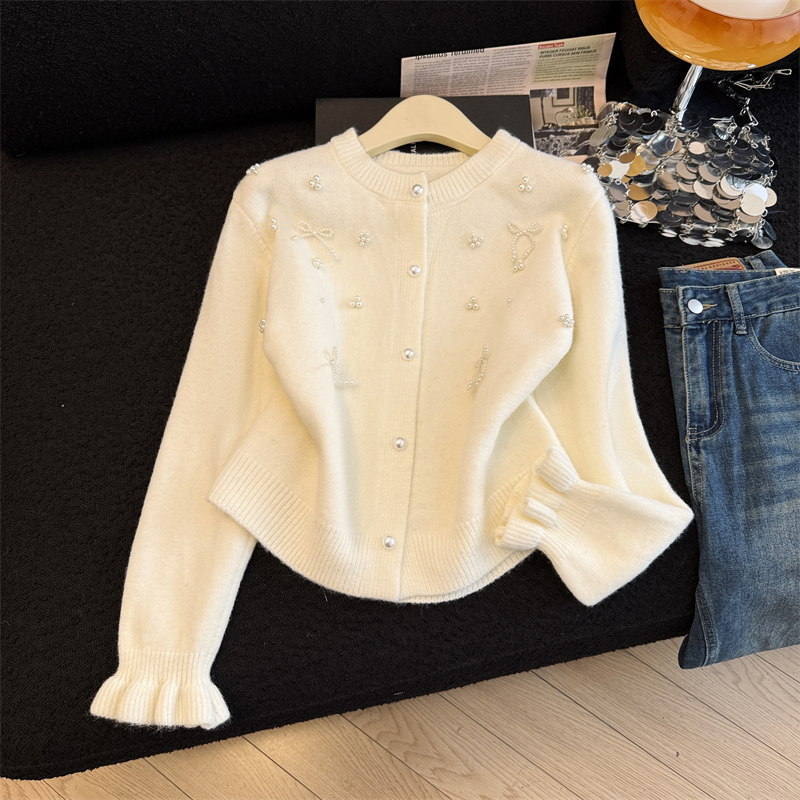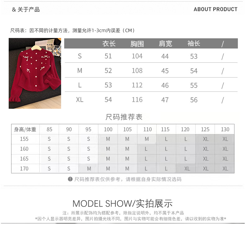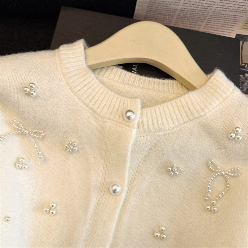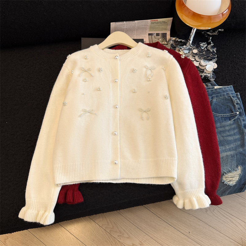 세련된 디자인의 2026년 신상 레드 비즈 장식 리본 스웨터 가디건의 실제 사진입니다.