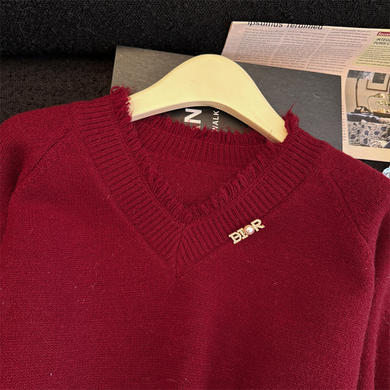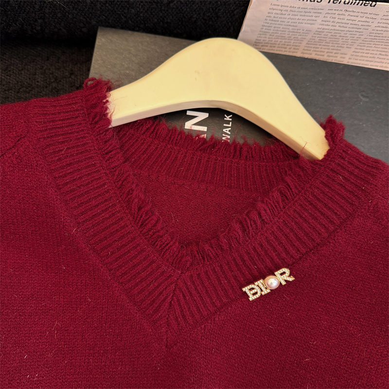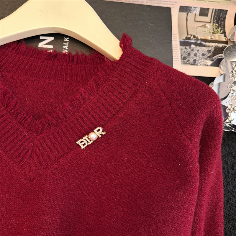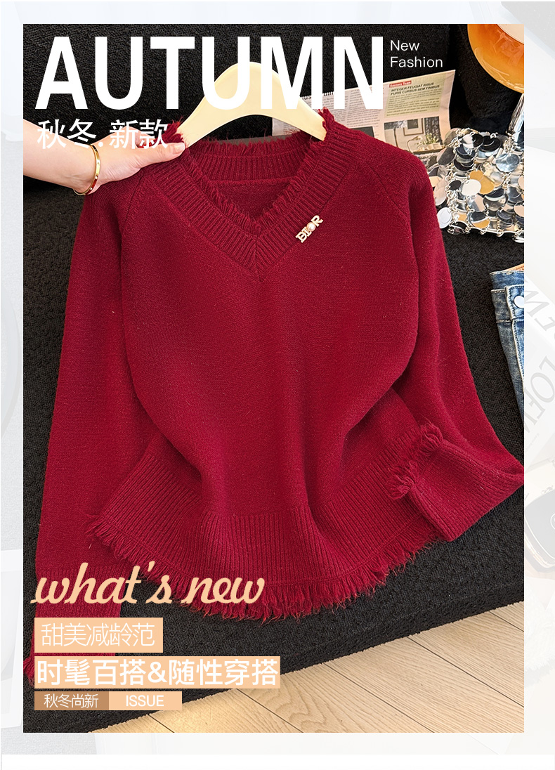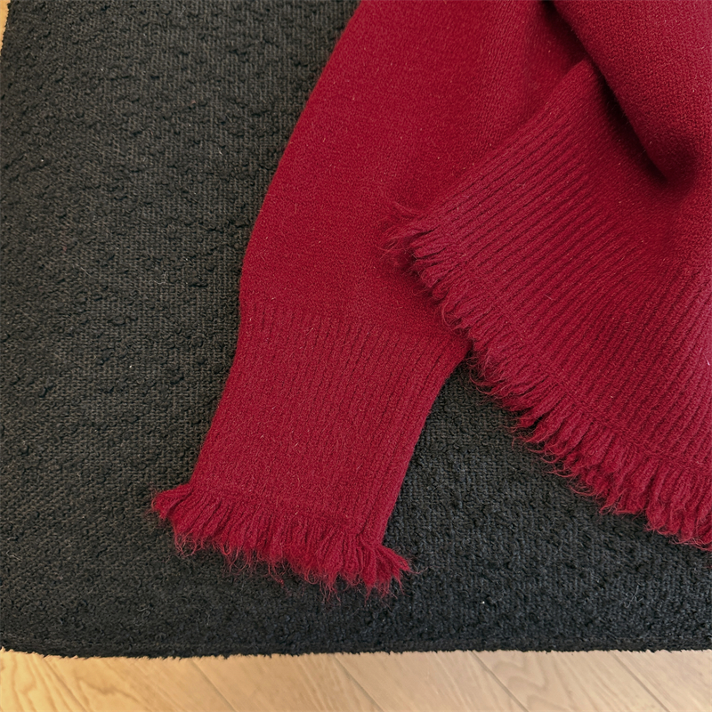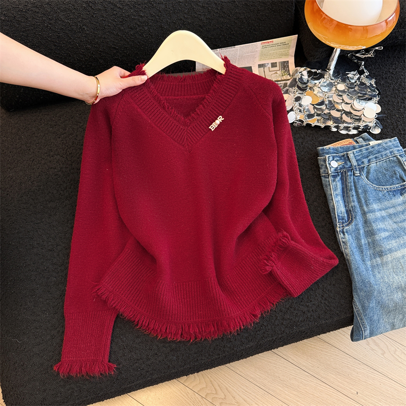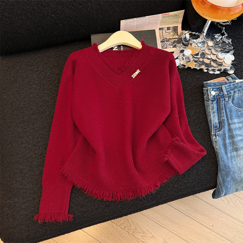 实拍新年红亮丝流苏设计感V领毛衣2026新款高级甜美加厚针织上衣