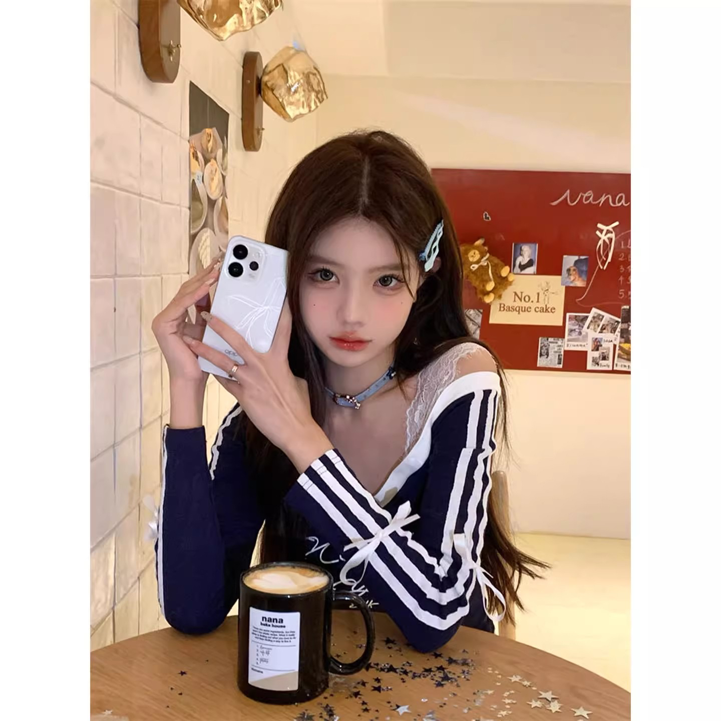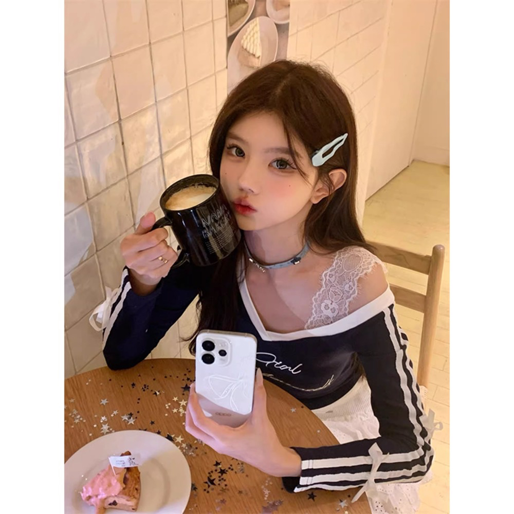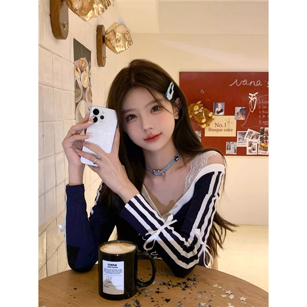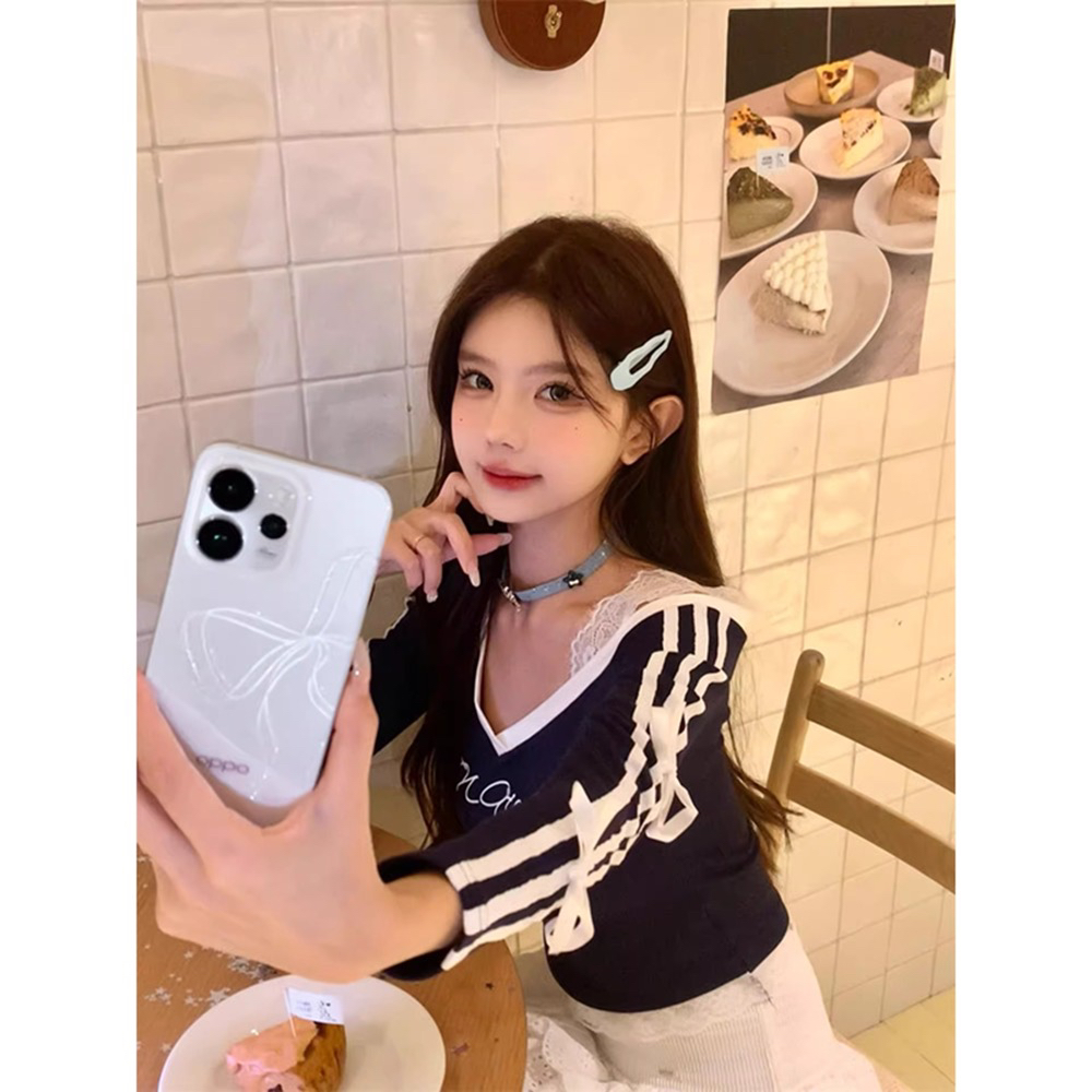 官图法式气质三条杠蝴蝶结v领长袖T恤上衣