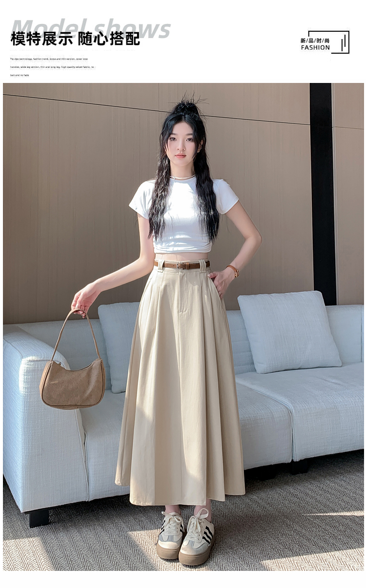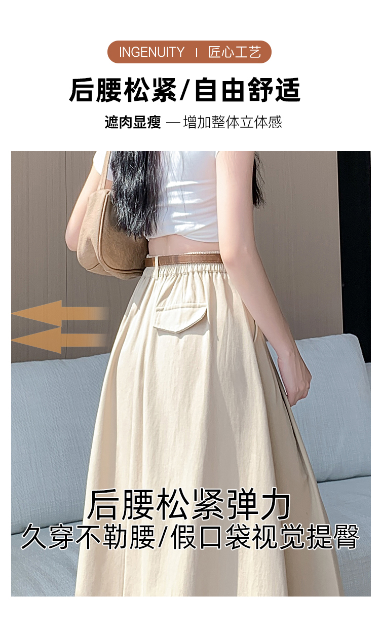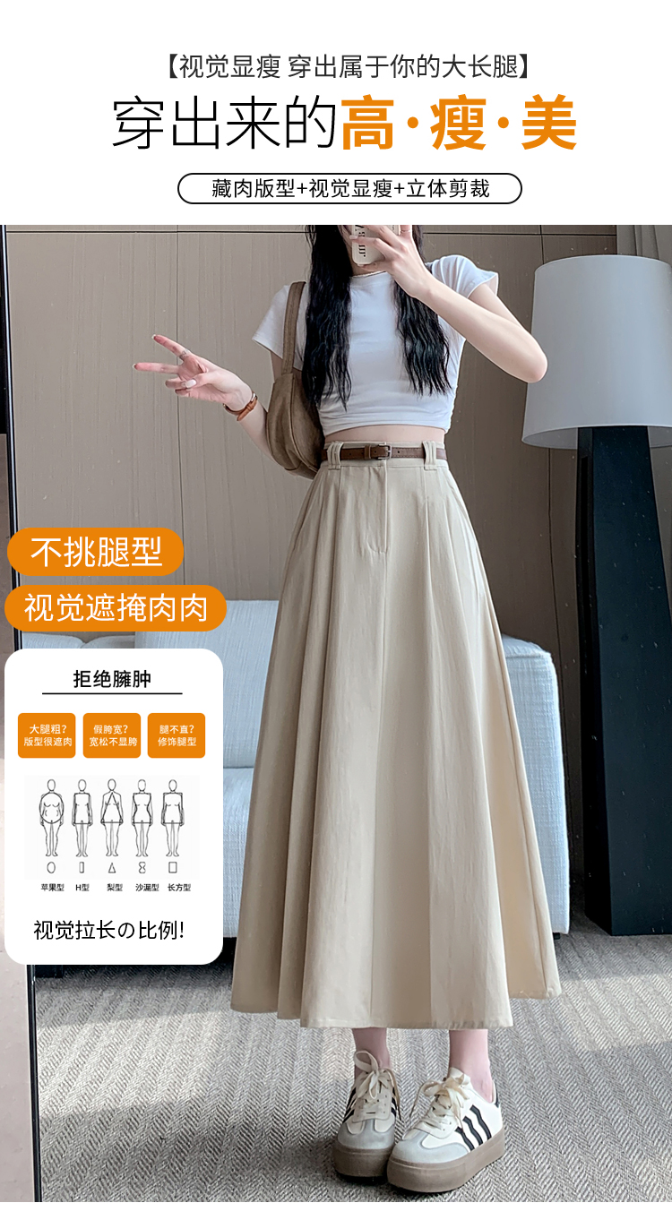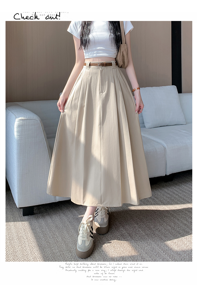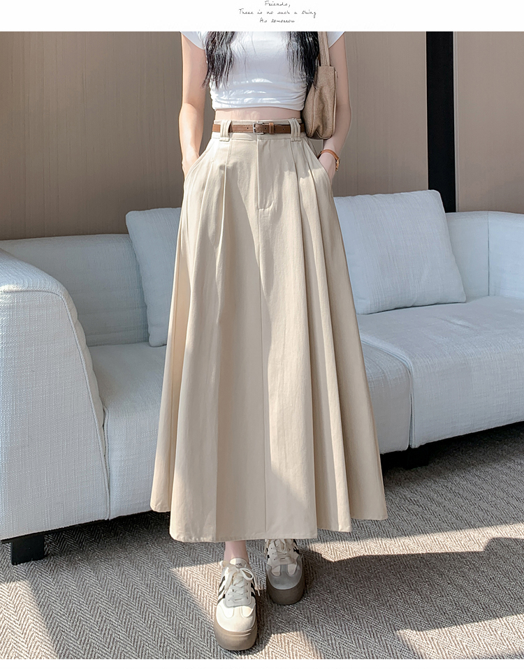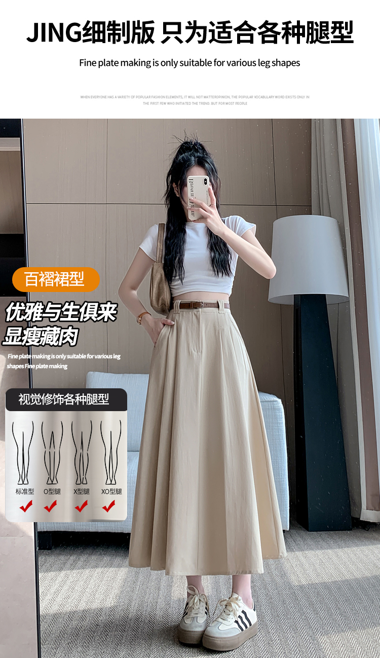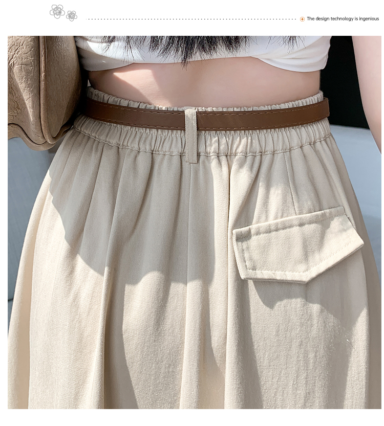 여성용 살구색 워싱 코튼 플리츠 미디 스커트, 2026년 봄/여름 신상, 엉덩이를 커버해주는 슬림한 A라인 미디 스커트로, 전체적으로 넓게 퍼지는 디자인입니다.