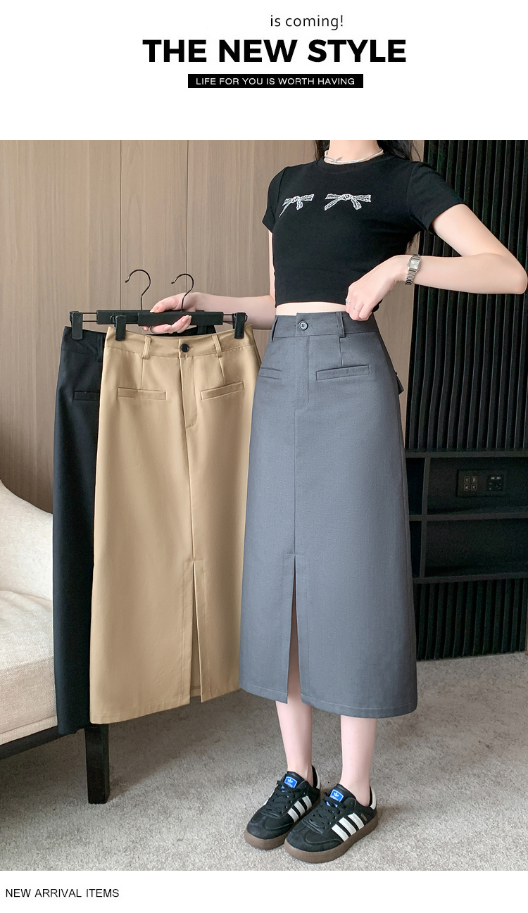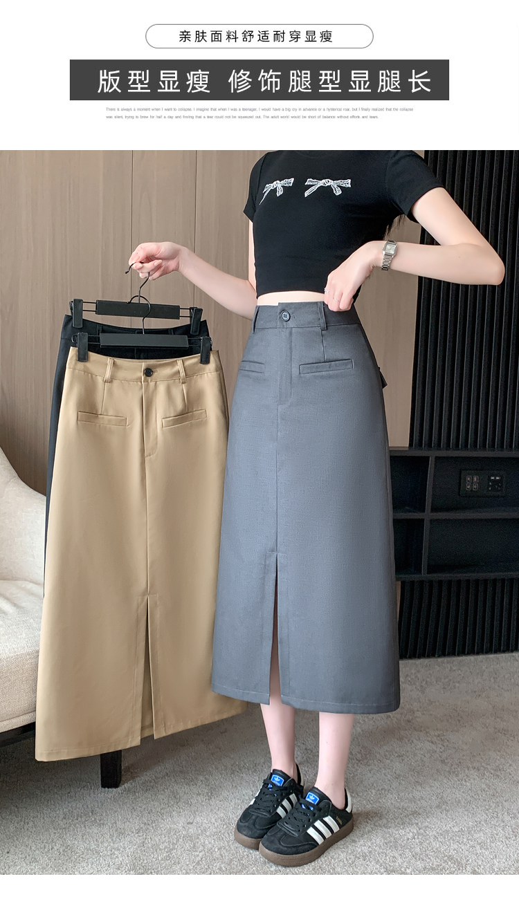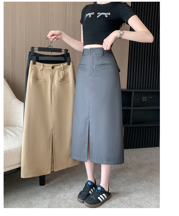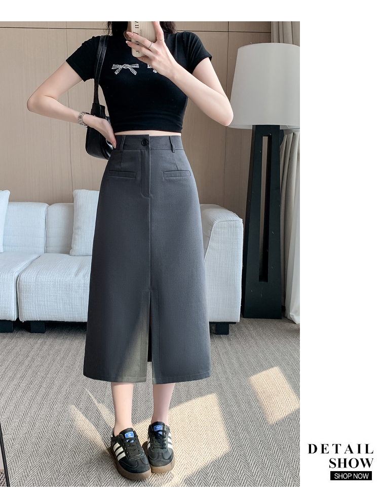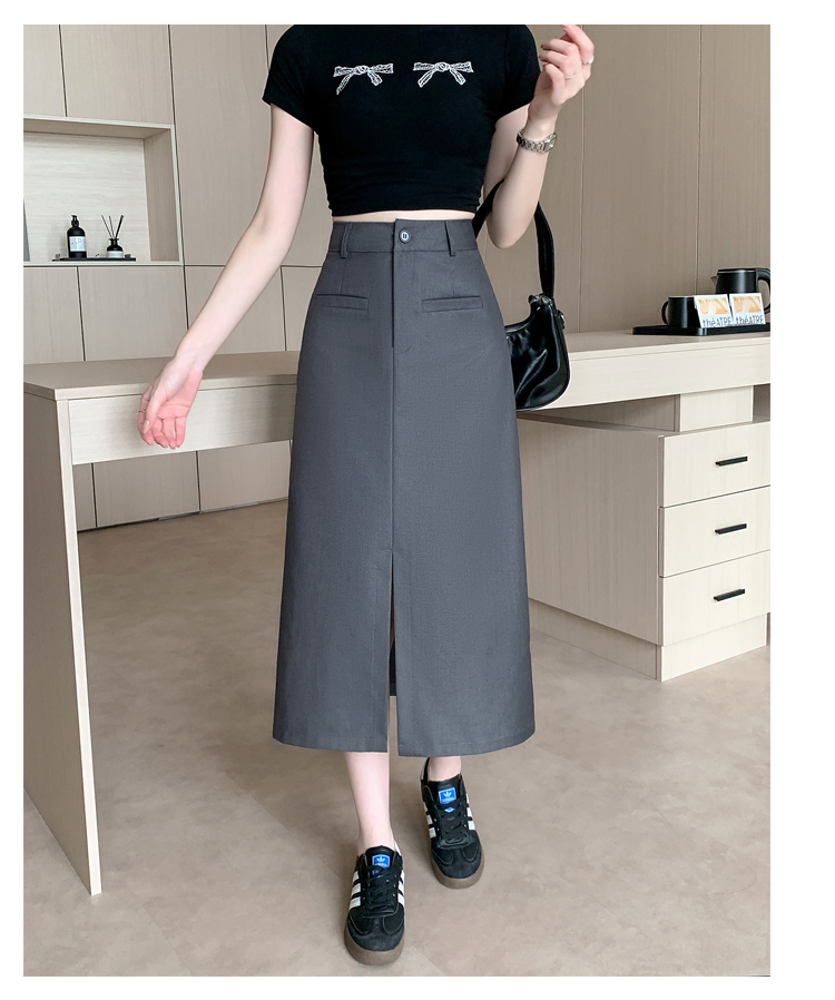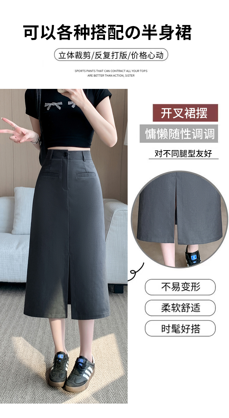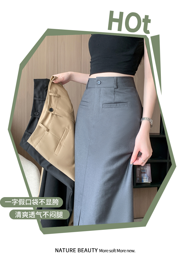 여성용 회색 슬림핏 정장 스커트, 봄 스타일, 슬릿 디자인, 독특하고 세련된 미디 길이 스커트, 우아하고 날씬해 보이는 효과.