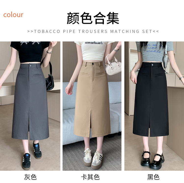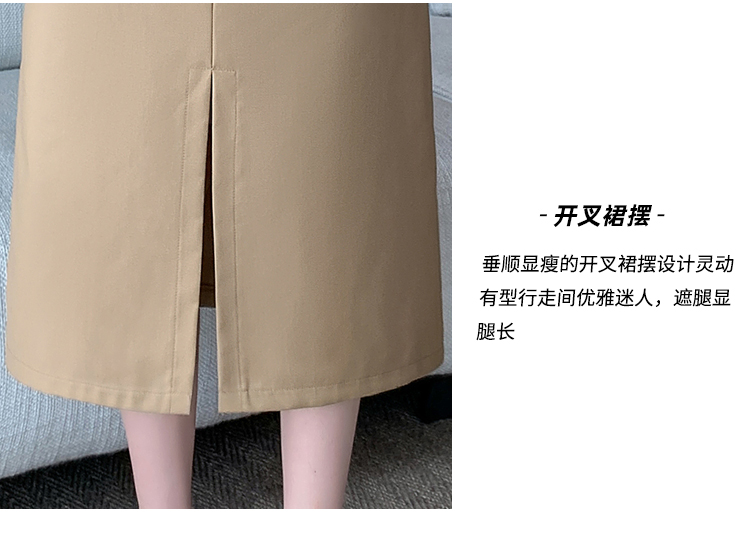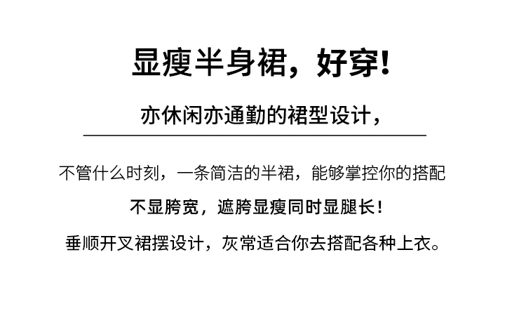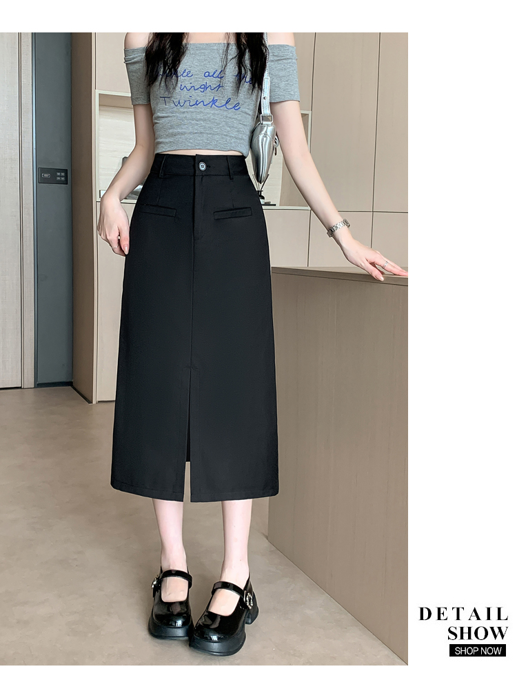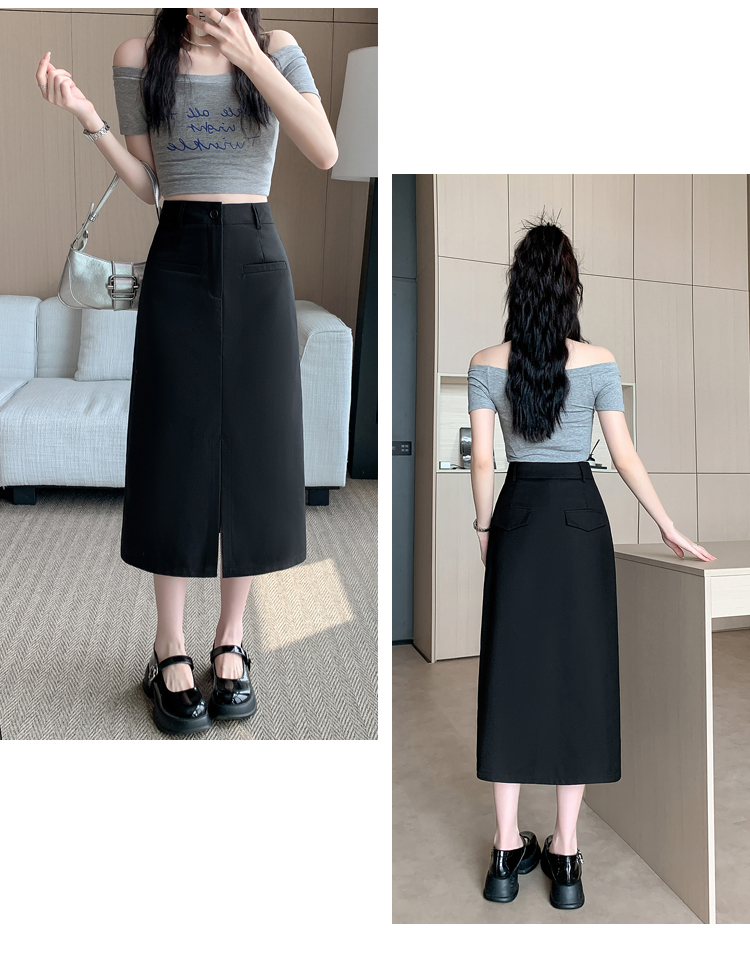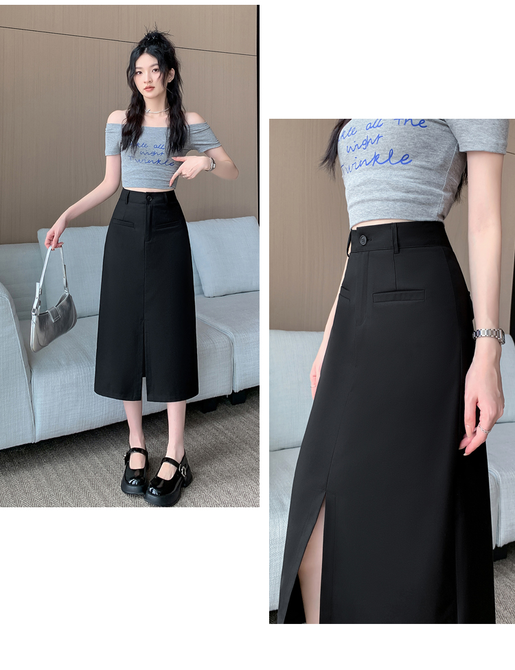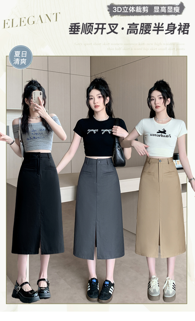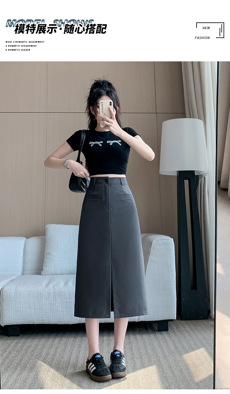 여성용 회색 슬림핏 정장 스커트, 봄 스타일, 슬릿 디자인, 독특하고 세련된 미디 길이 스커트, 우아하고 날씬해 보이는 효과.