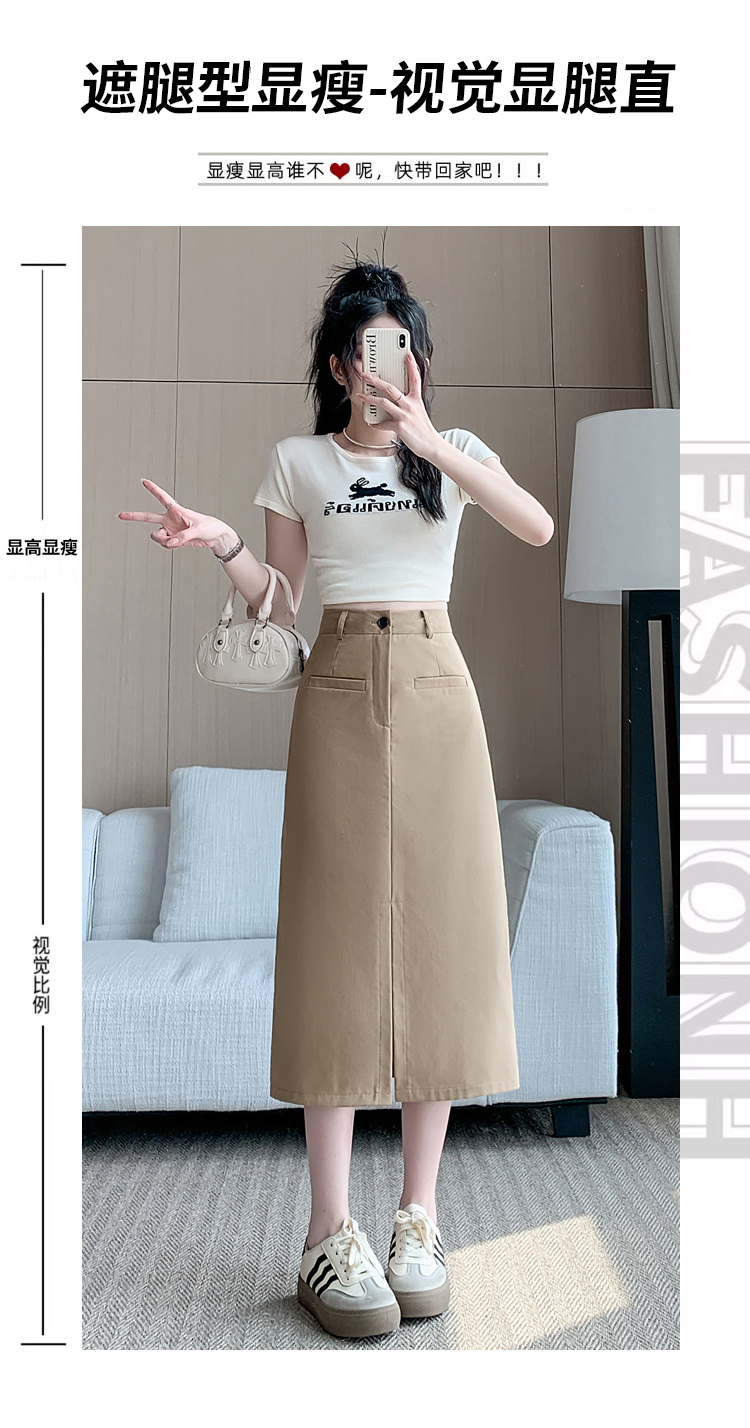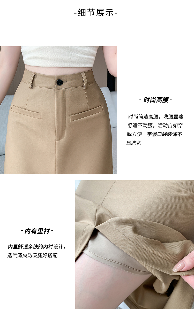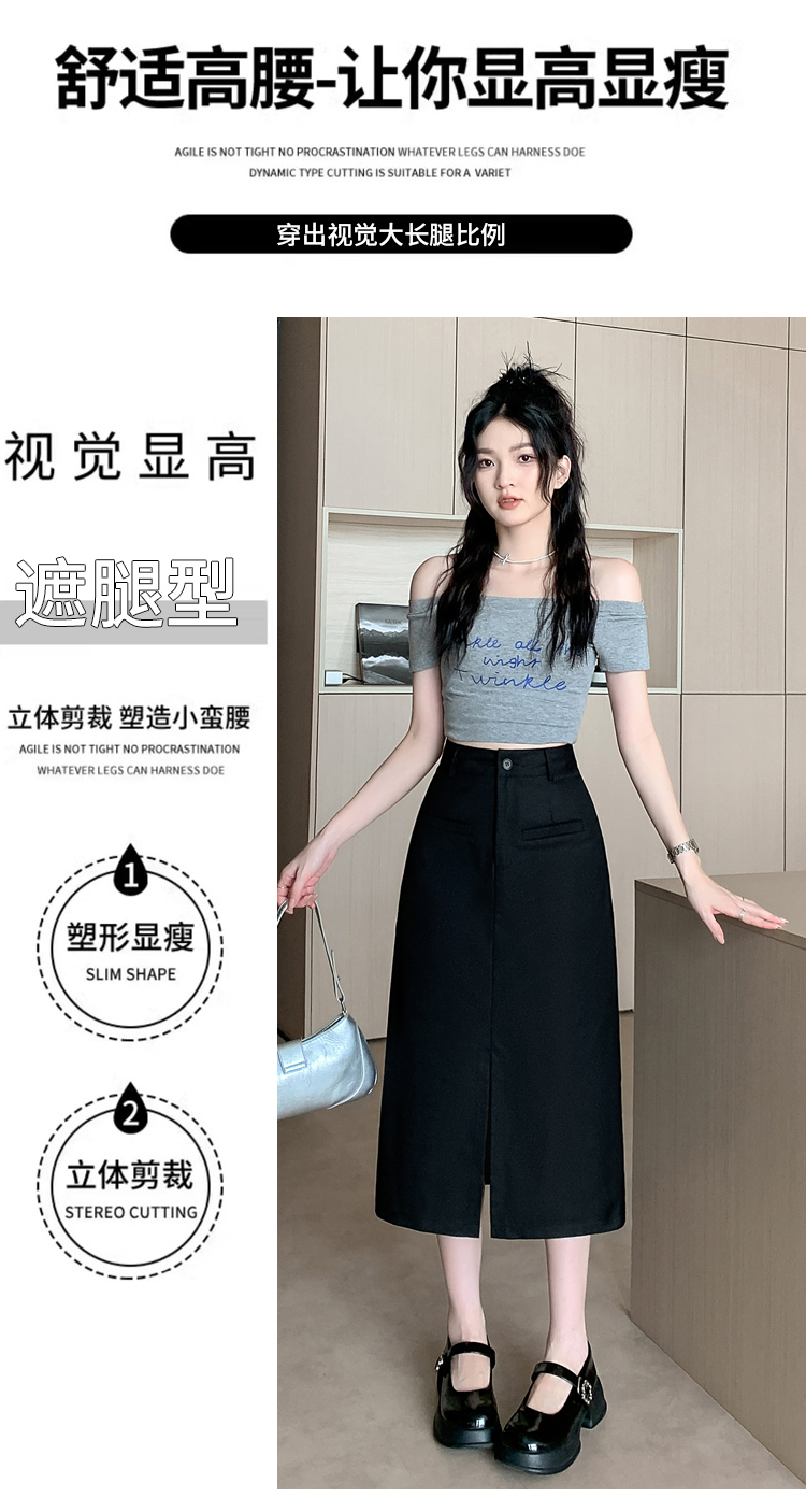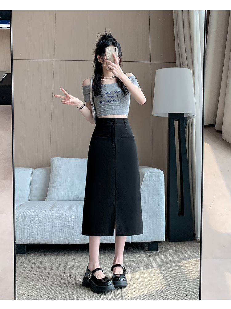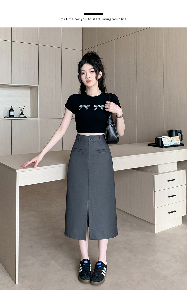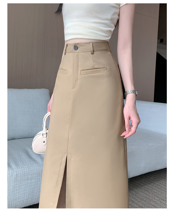 여성용 회색 슬림핏 정장 스커트, 봄 스타일, 슬릿 디자인, 독특하고 세련된 미디 길이 스커트, 우아하고 날씬해 보이는 효과.