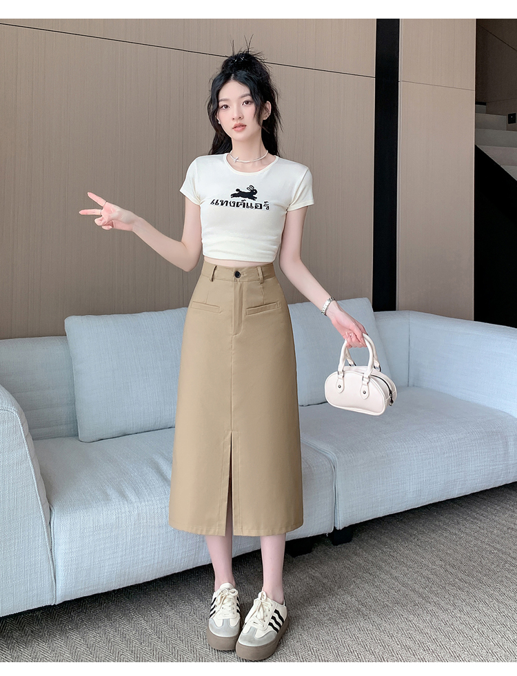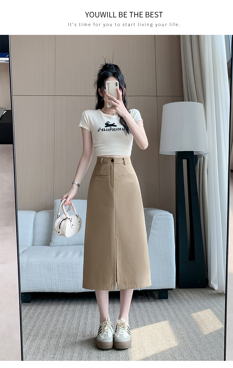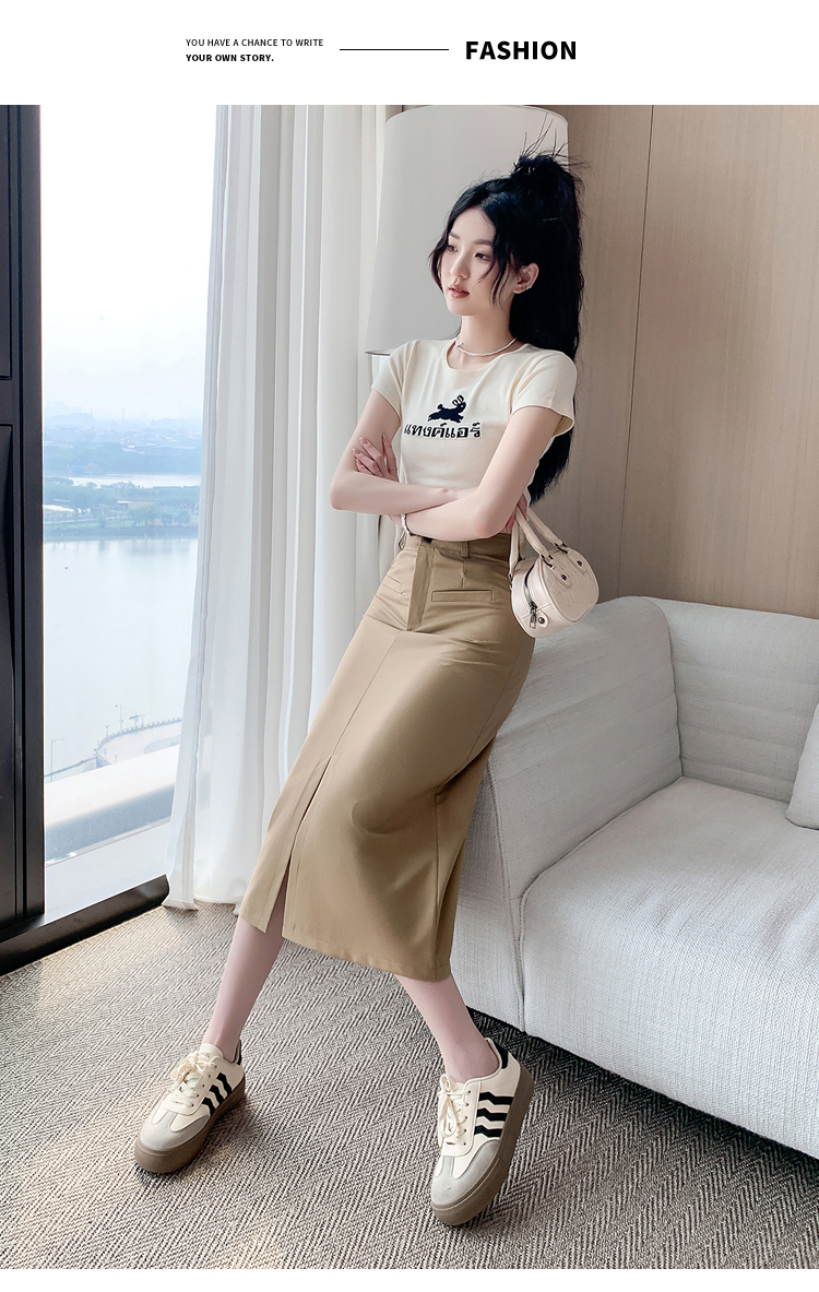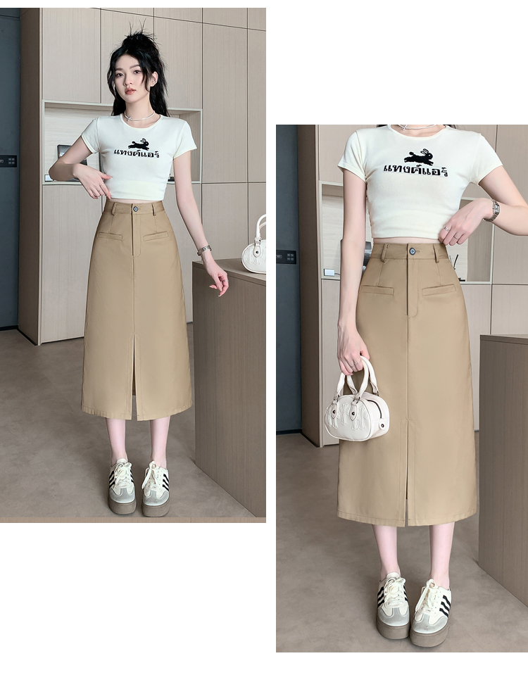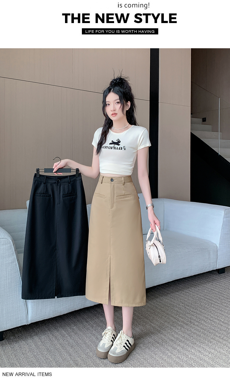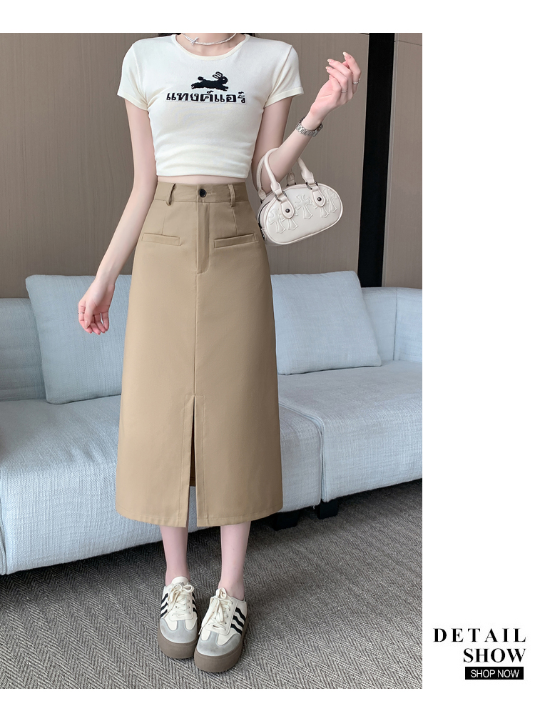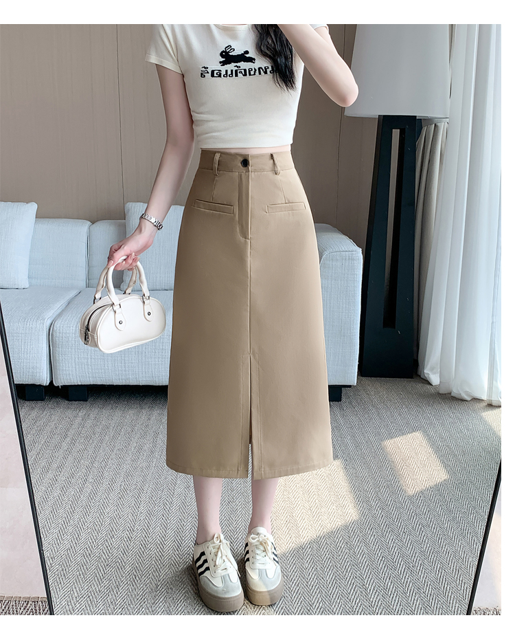 여성용 회색 슬림핏 정장 스커트, 봄 스타일, 슬릿 디자인, 독특하고 세련된 미디 길이 스커트, 우아하고 날씬해 보이는 효과.