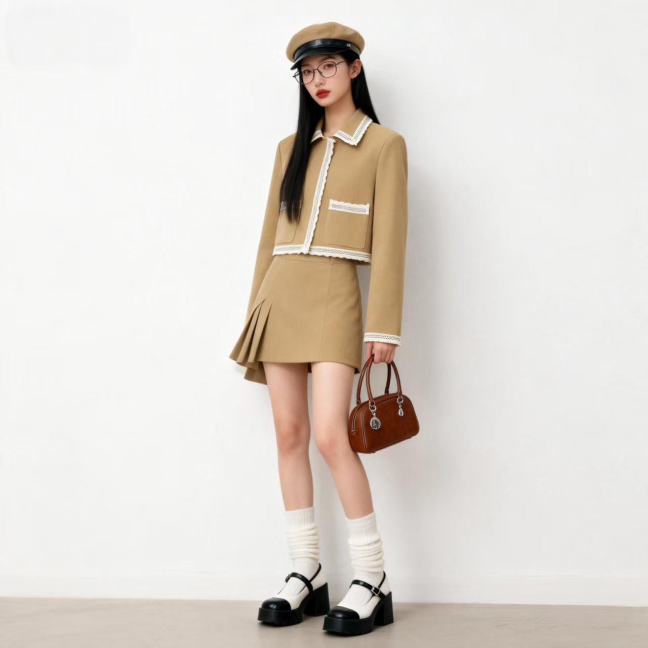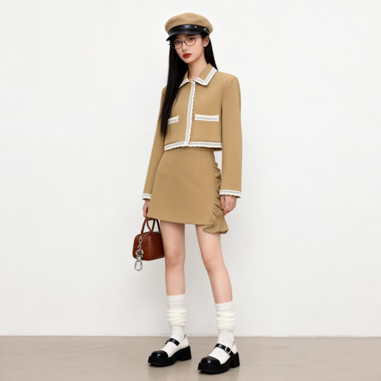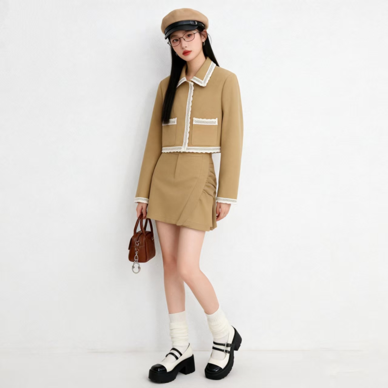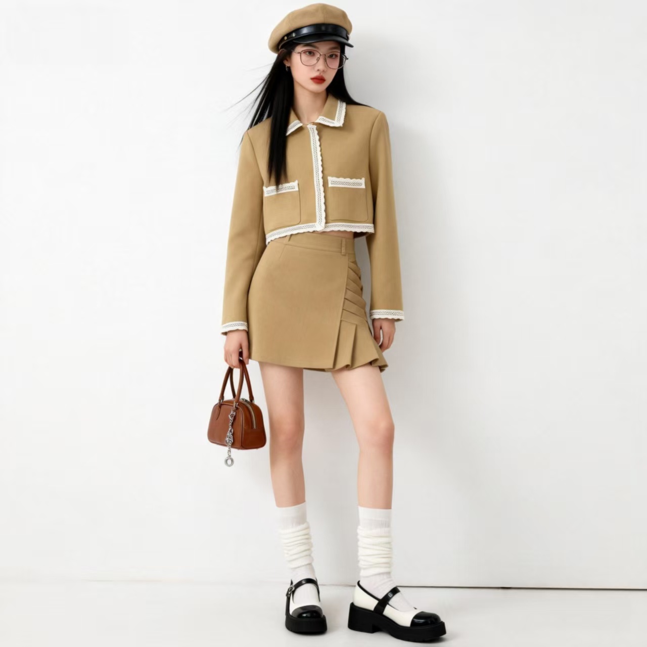 2026년 봄 신상 여성 재킷의 실제 사진입니다. 세련되고 활용도 높은 컬러 블록 레이스 트리밍이 특징이며, 짧은 기장으로 아담한 사이즈에도 잘 어울립니다.