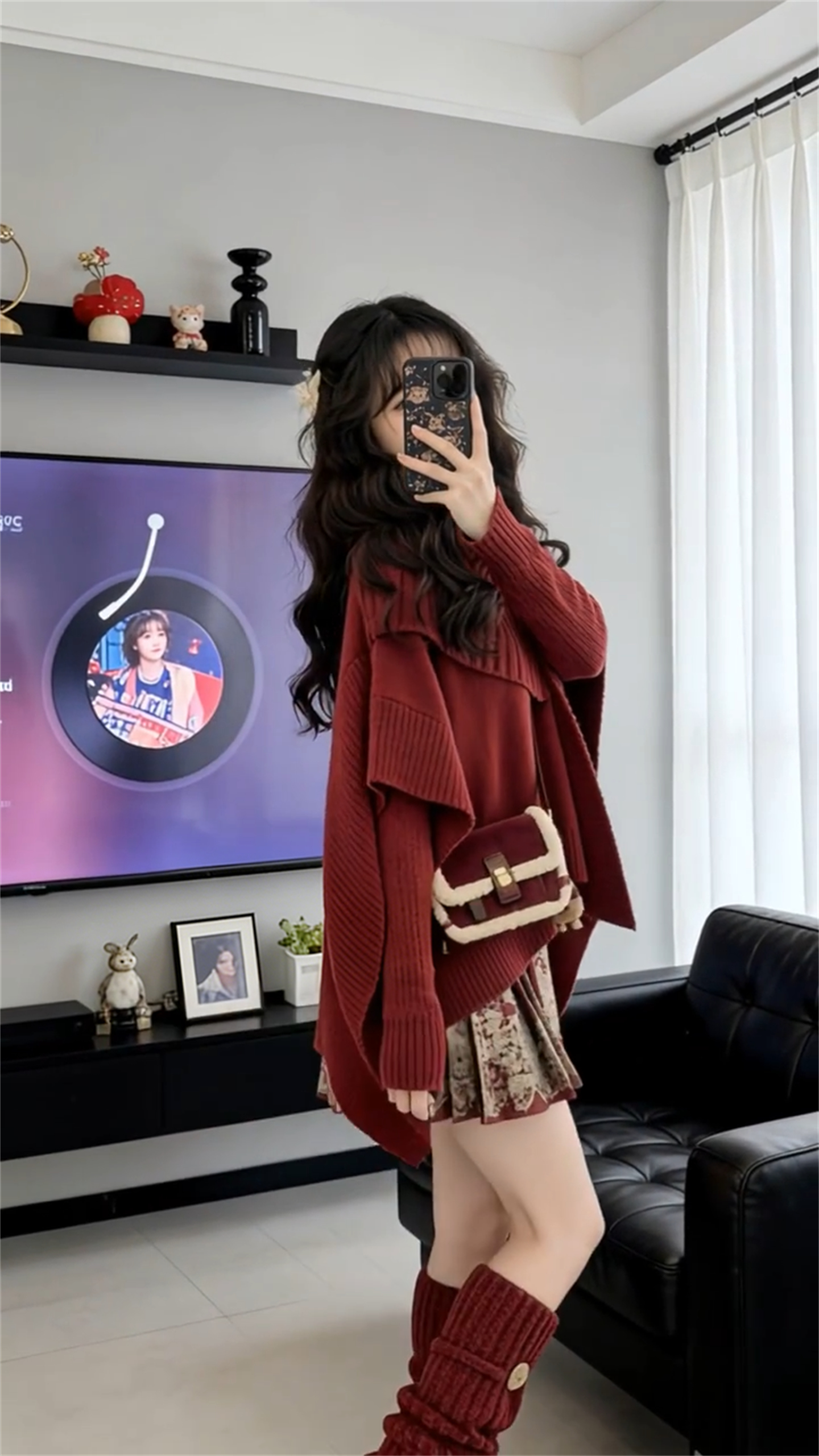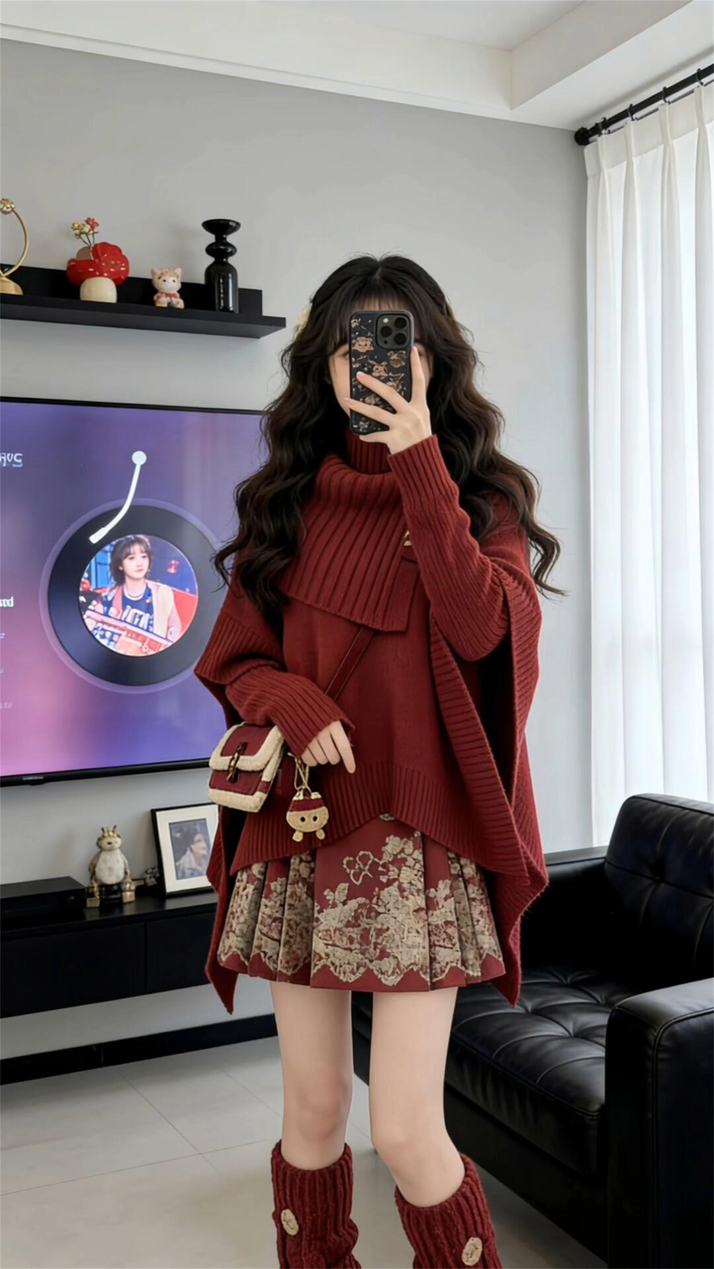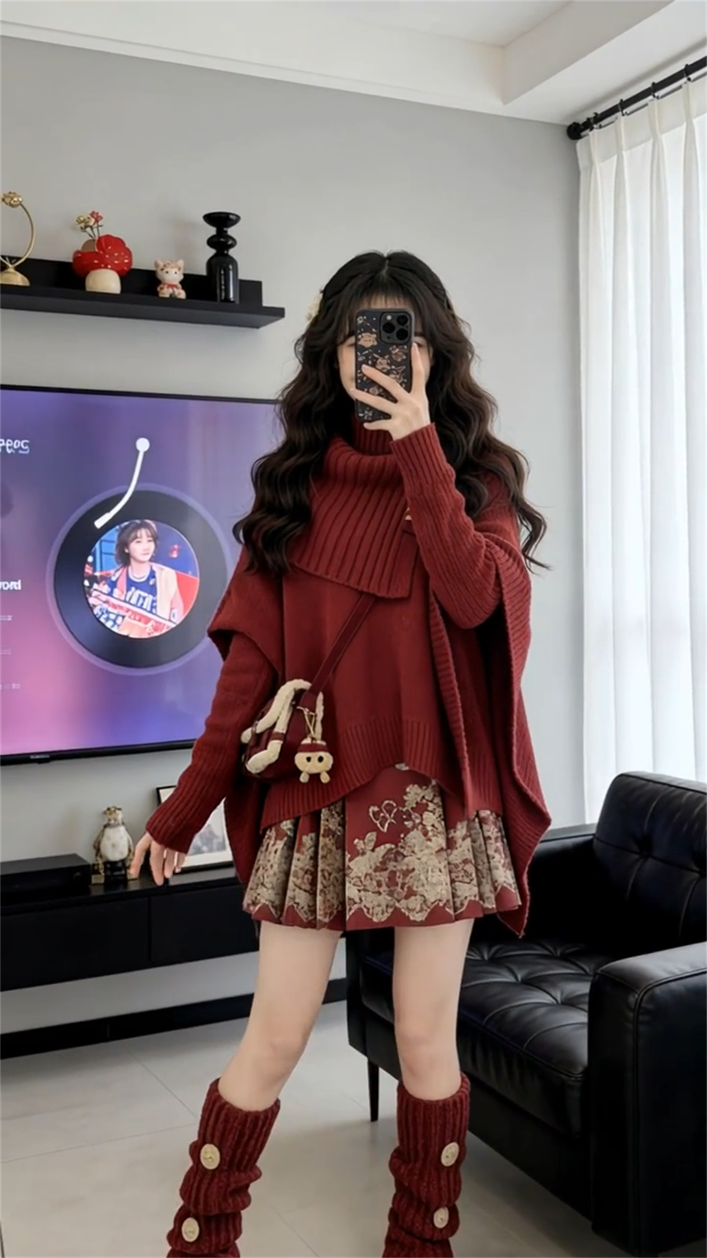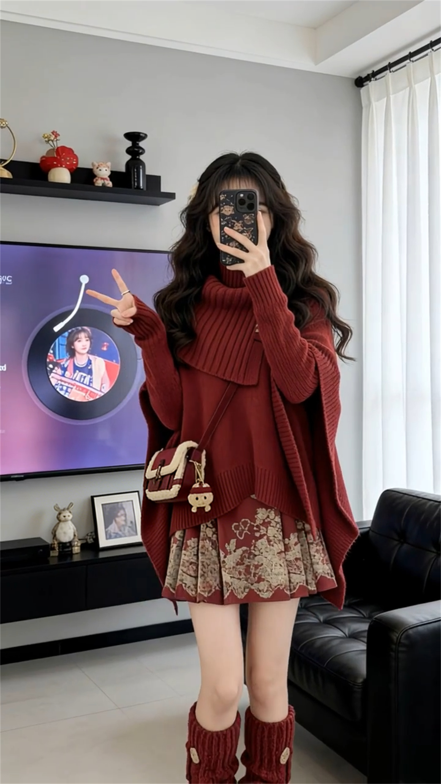 새로운 중국풍 레드 케이프 숄 스웨터 여성용 2026 가을/겨울 신상 초미녀 겨울 의류 세트