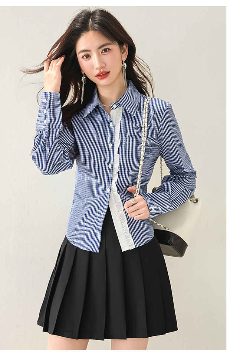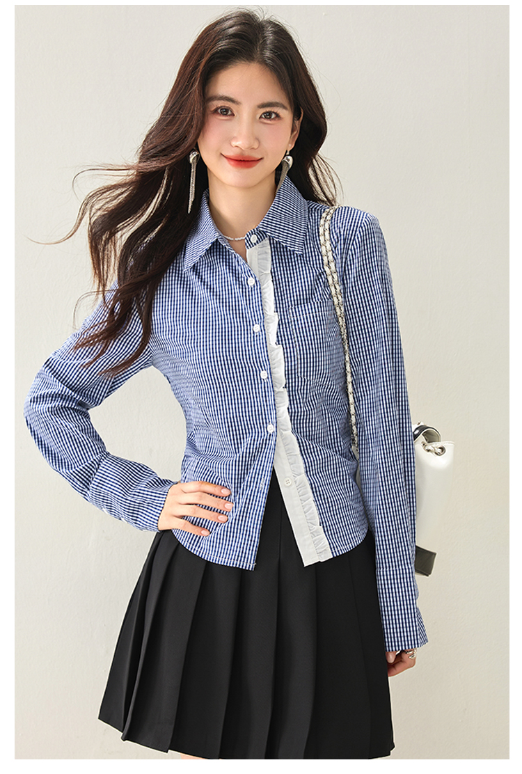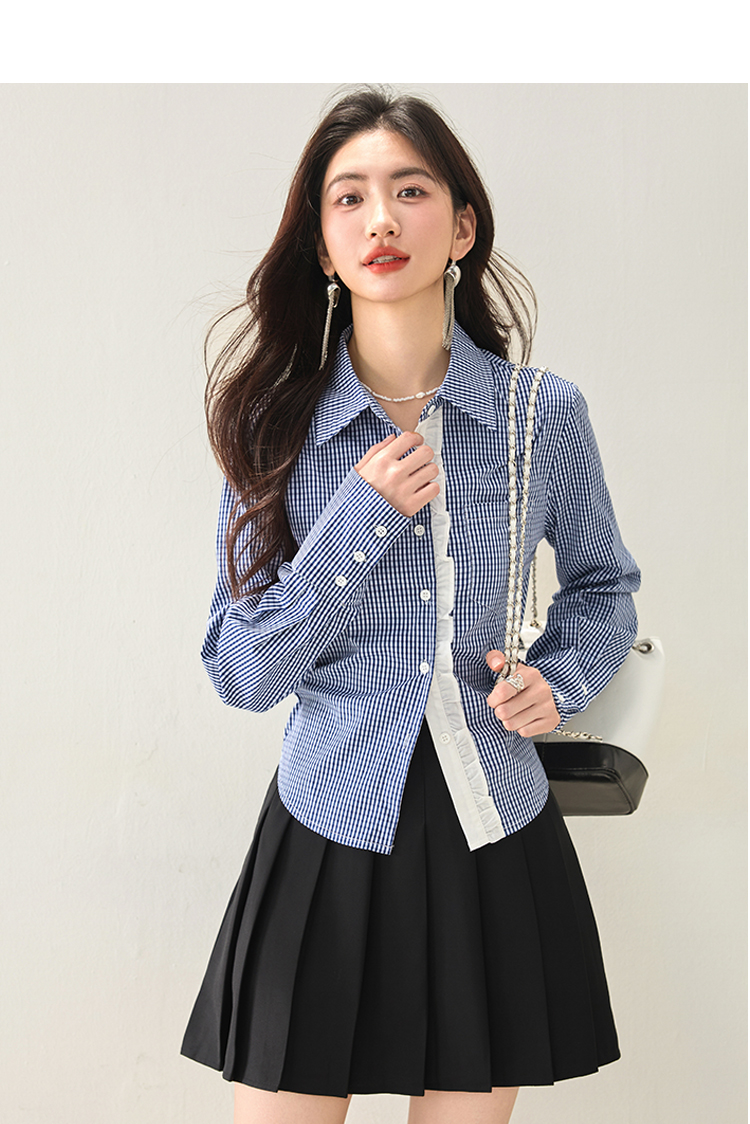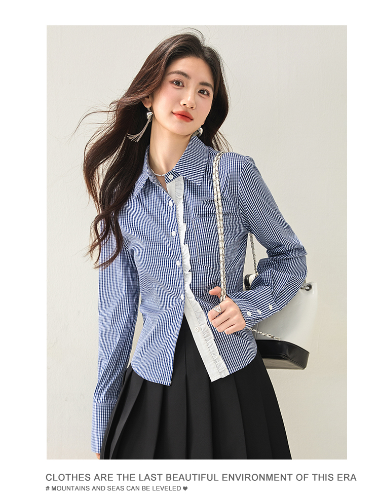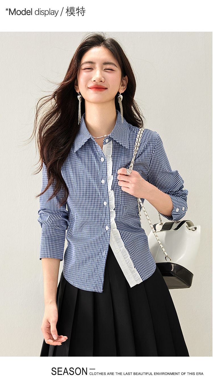 실물 사진 ◆ 2026 레이스 블루 체크 고급 셔츠, 프렌치 레트로 긴팔 티셔츠, 니치 디자인 셔츠