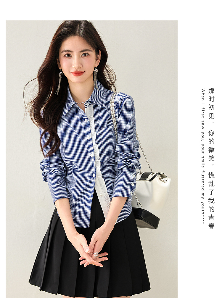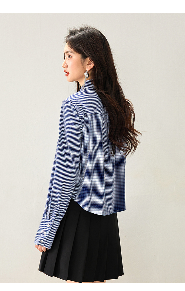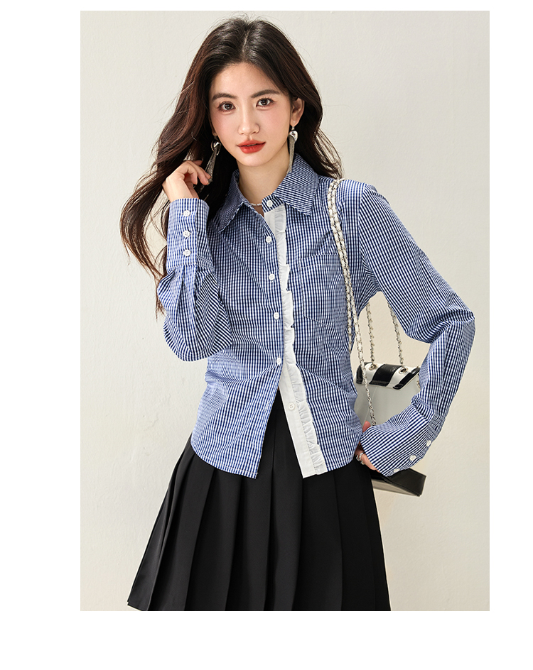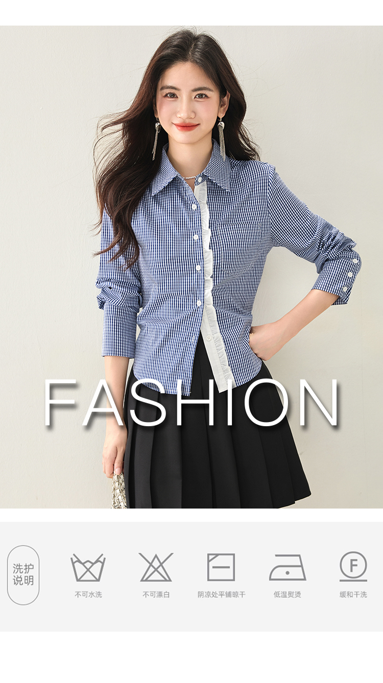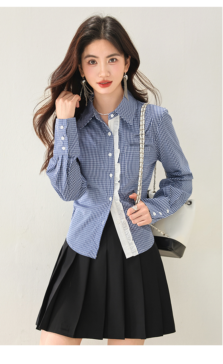 실물 사진 ◆ 2026 레이스 블루 체크 고급 셔츠, 프렌치 레트로 긴팔 티셔츠, 니치 디자인 셔츠