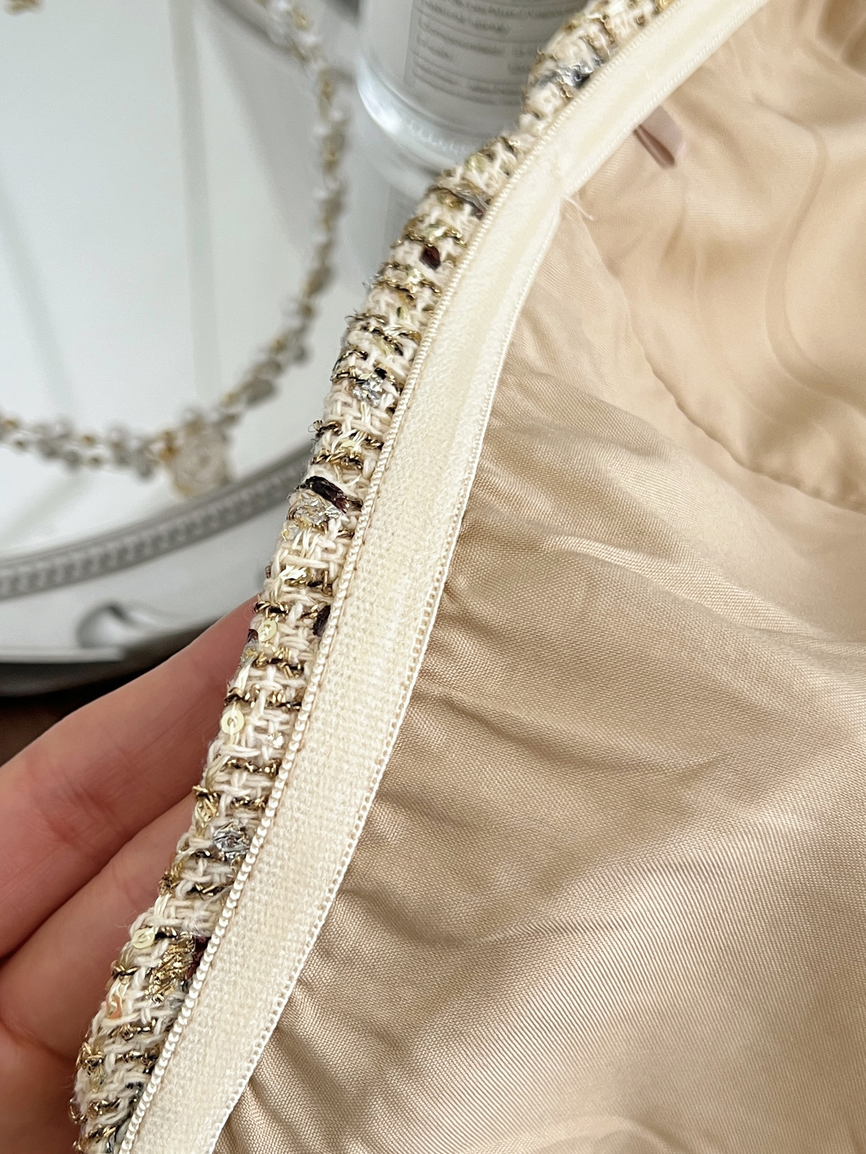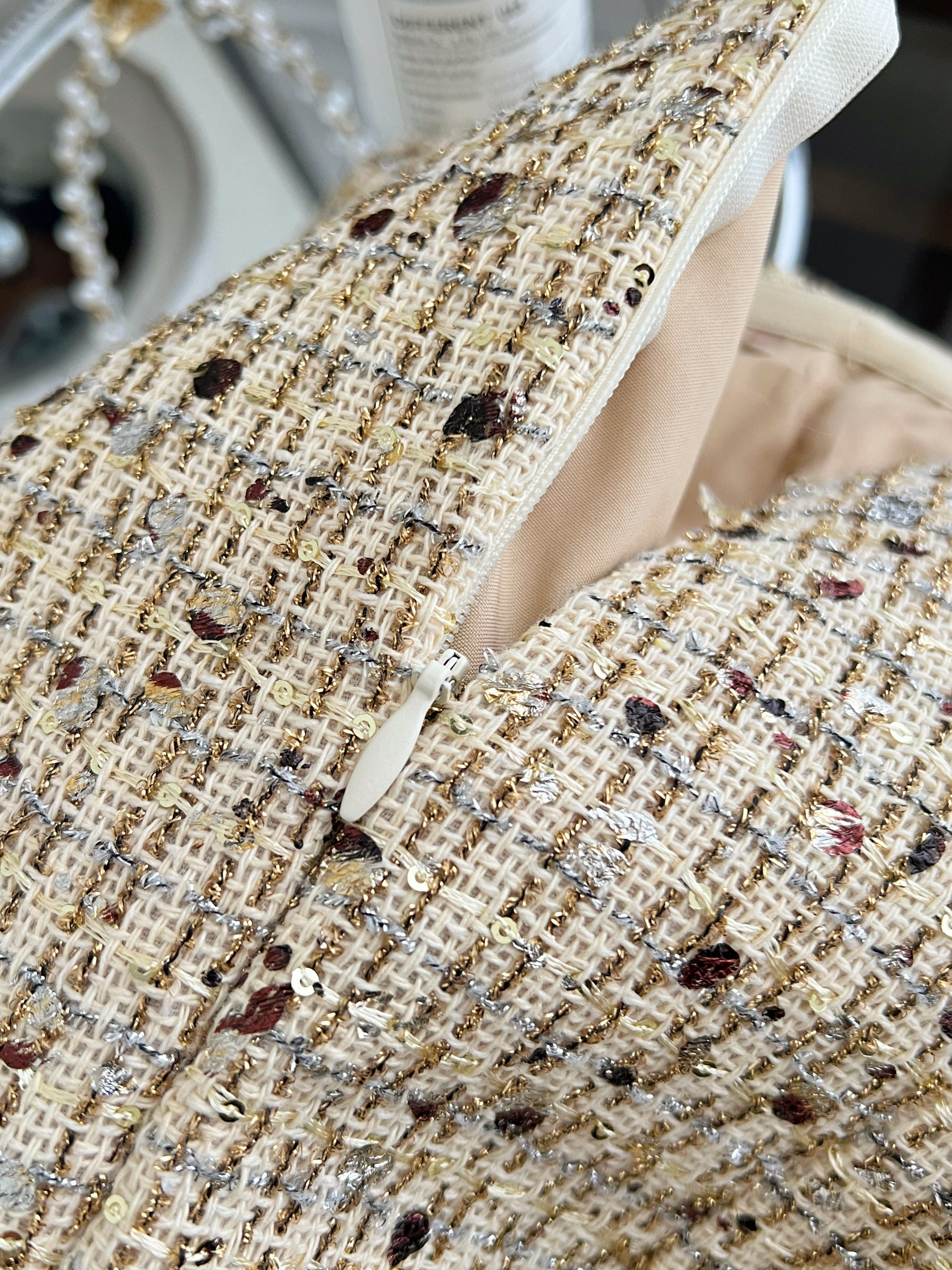 샤넬에서 영감을 받은 스트랩리스 드레스, 투피스 디자인, 고급스러운 느낌, 2026년 새롭게 선보이는 프랑스 스타일의 허리선을 강조한 롱 드레스.