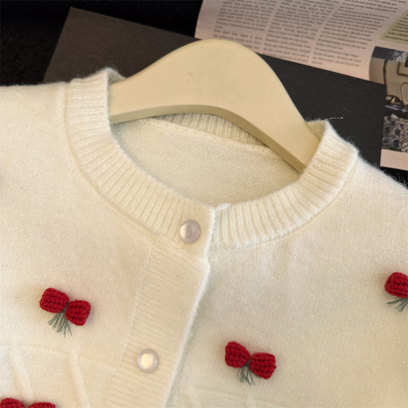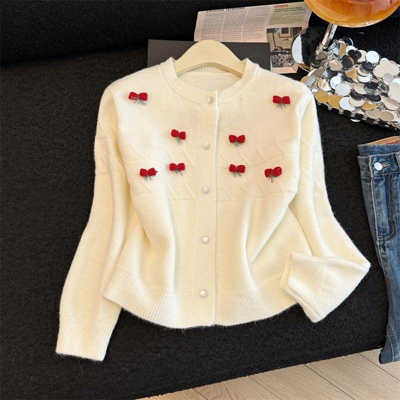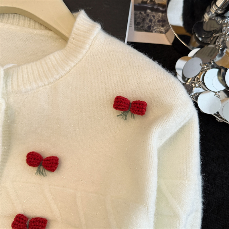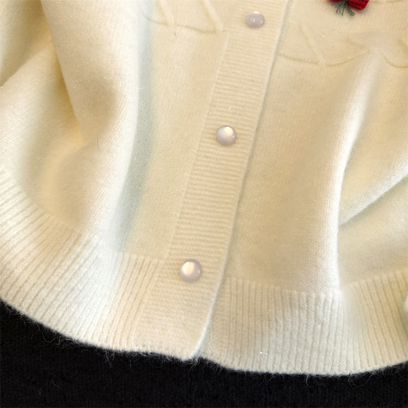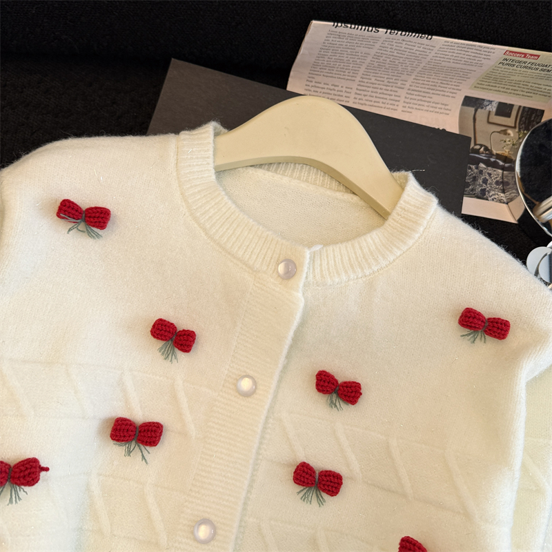 실생활에서 촬영한 새해 패션 사진: 여성용 화이트 가디건 스웨터, 2026년 새롭게 선보이는 프렌치 스타일의 세련된 니트 가디건 탑.