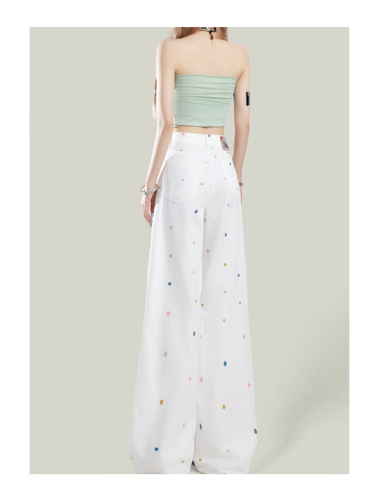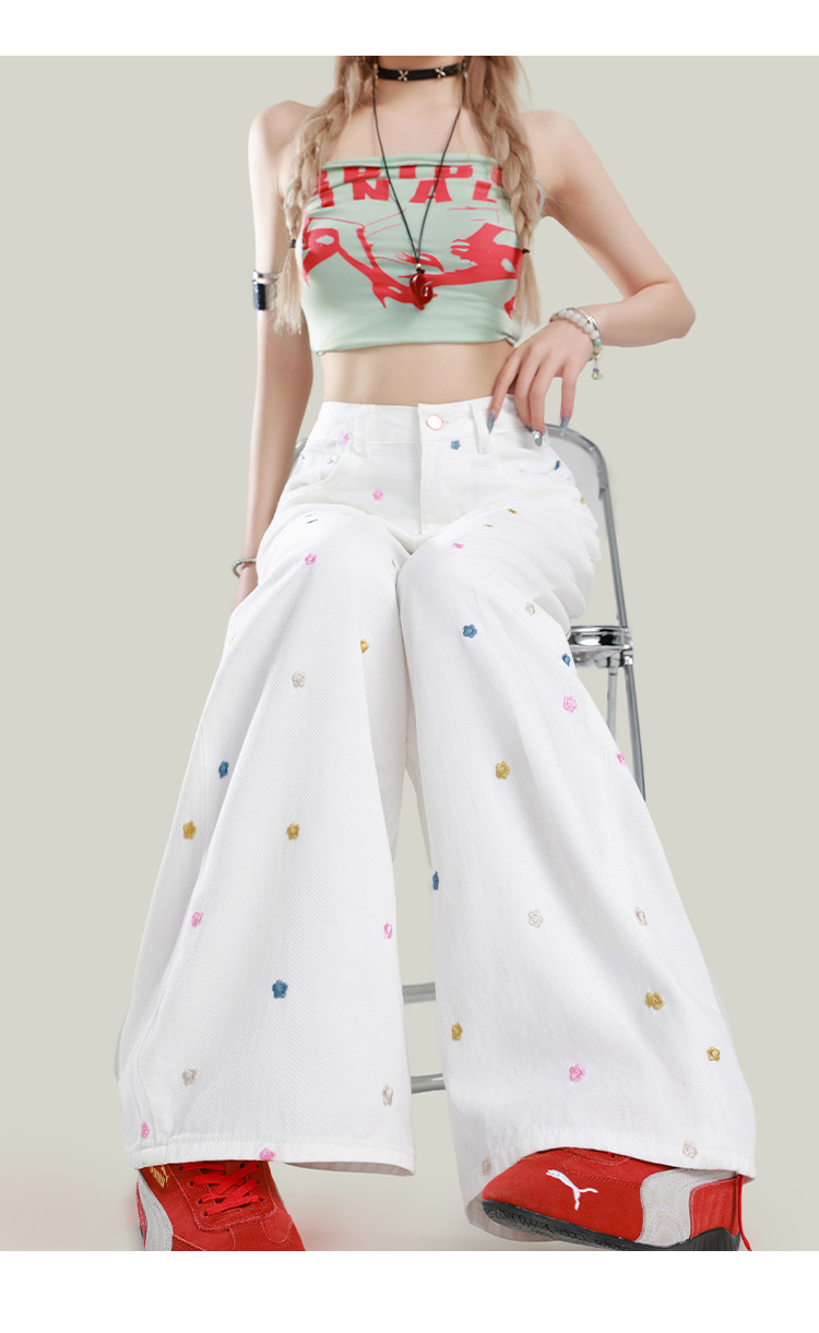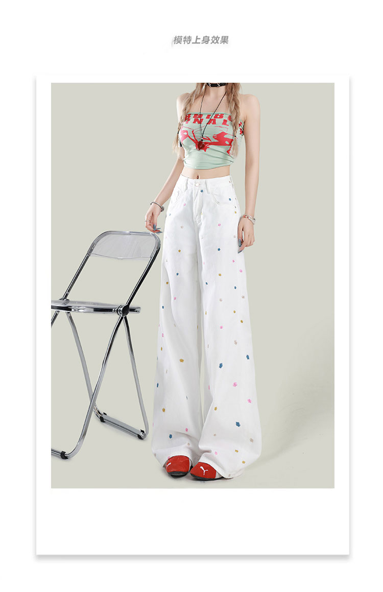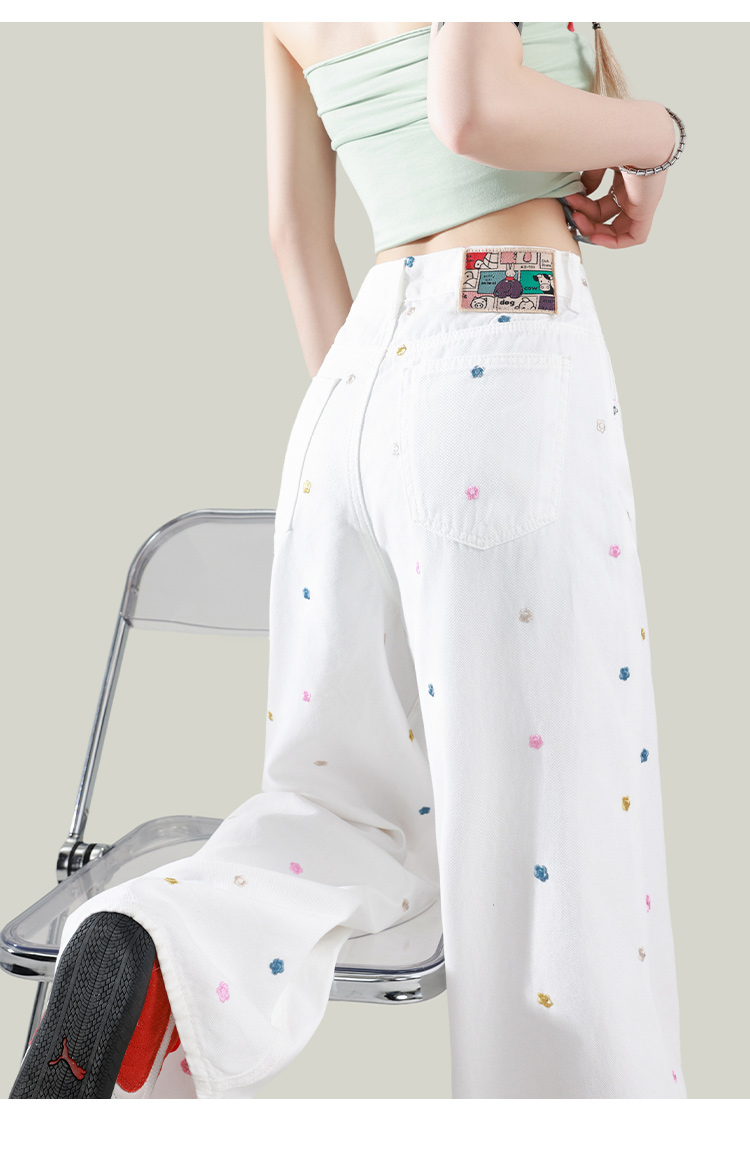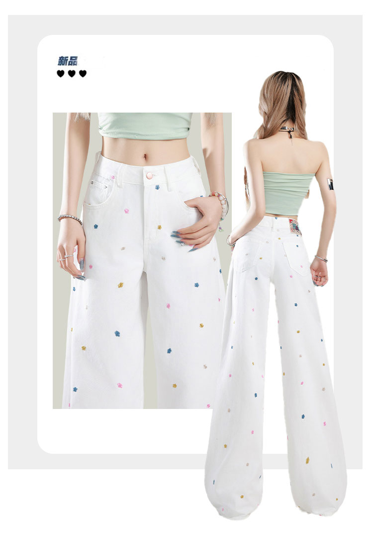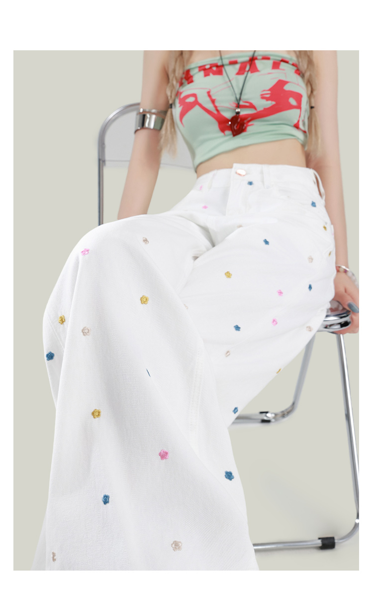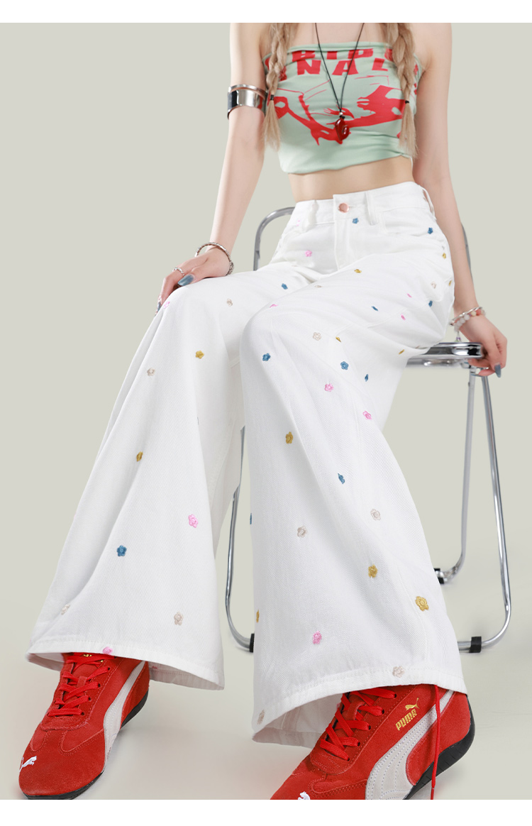 여성용 자수 와이드 팬츠, 봄/가을용, 아메리칸 스타일, 플로럴 디자인, 개성 있는 스타일, 출퇴근용으로 적합, 루즈핏, 플러스 사이즈 여성, 활용도 높은 스트레이트 팬츠.