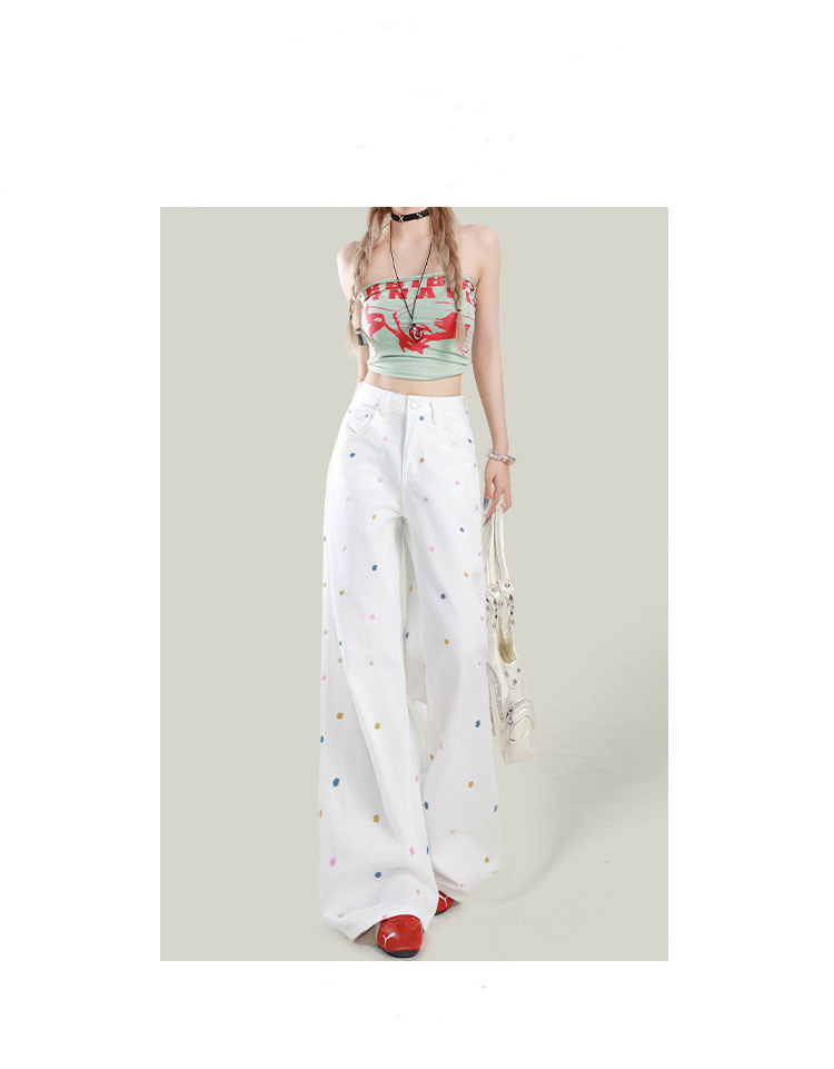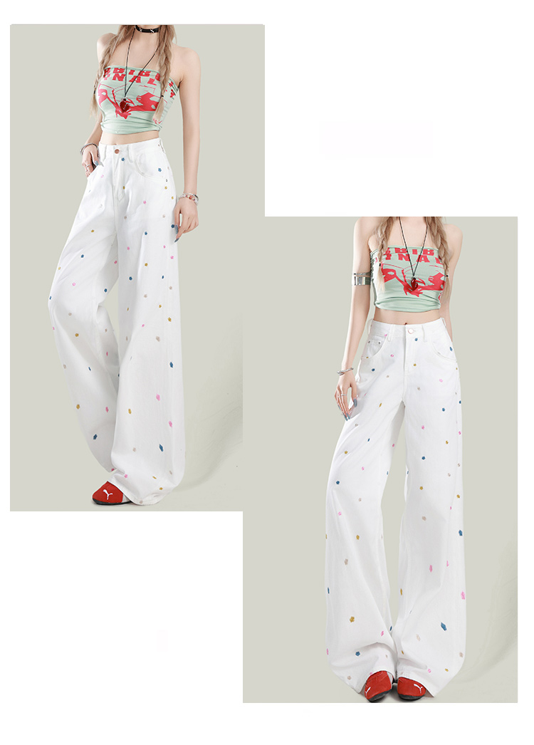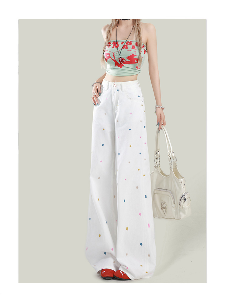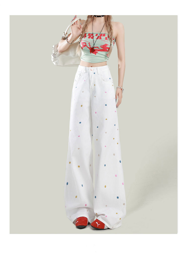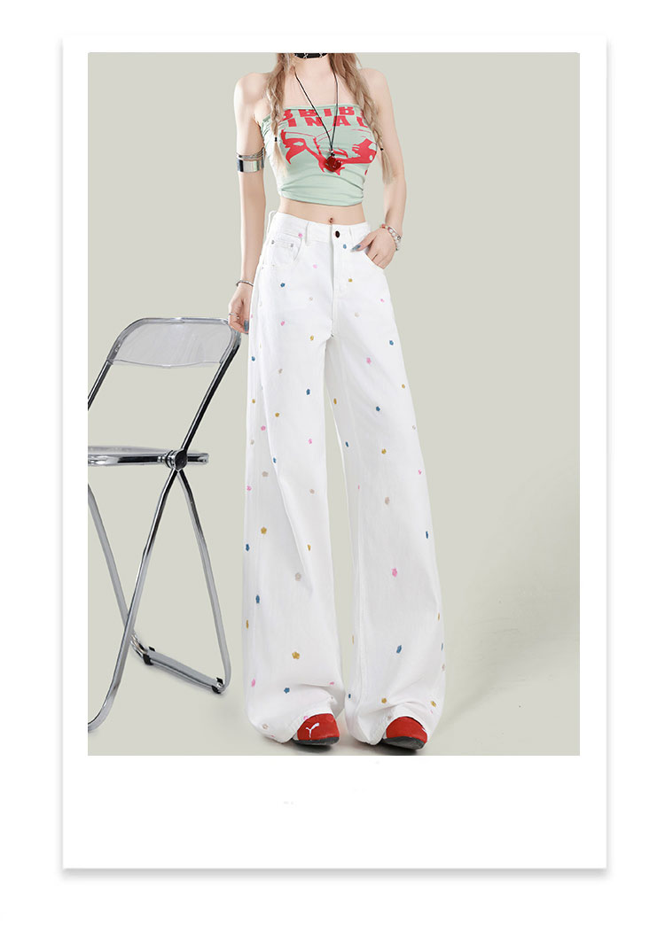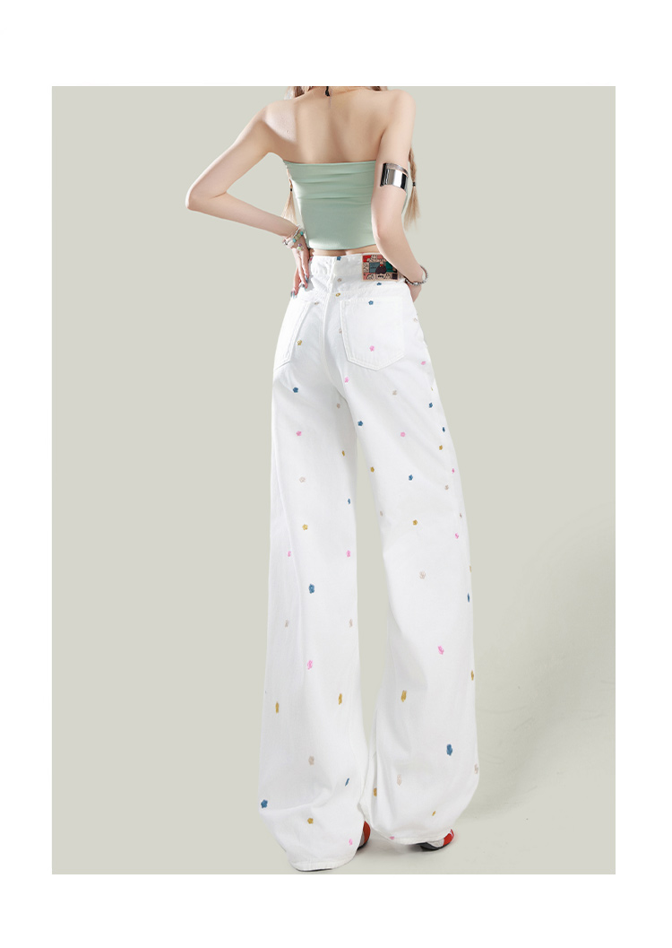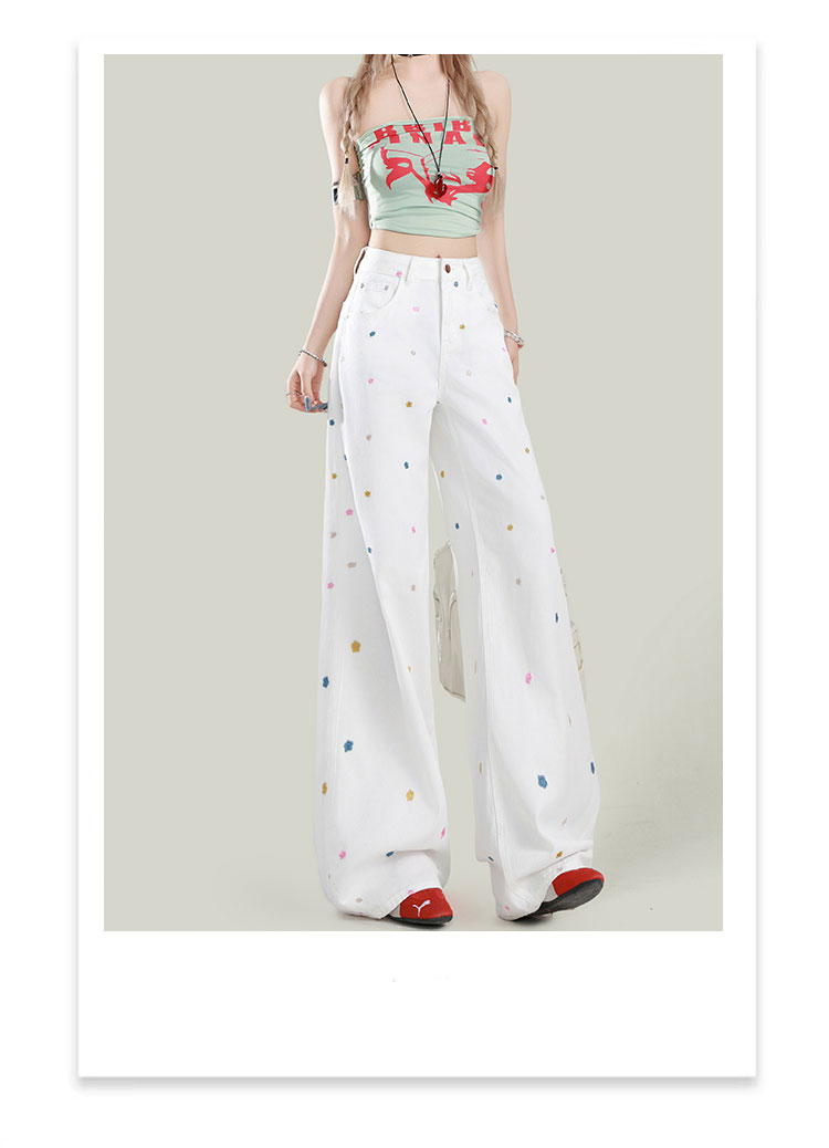 여성용 자수 와이드 팬츠, 봄/가을용, 아메리칸 스타일, 플로럴 디자인, 개성 있는 스타일, 출퇴근용으로 적합, 루즈핏, 플러스 사이즈 여성, 활용도 높은 스트레이트 팬츠.