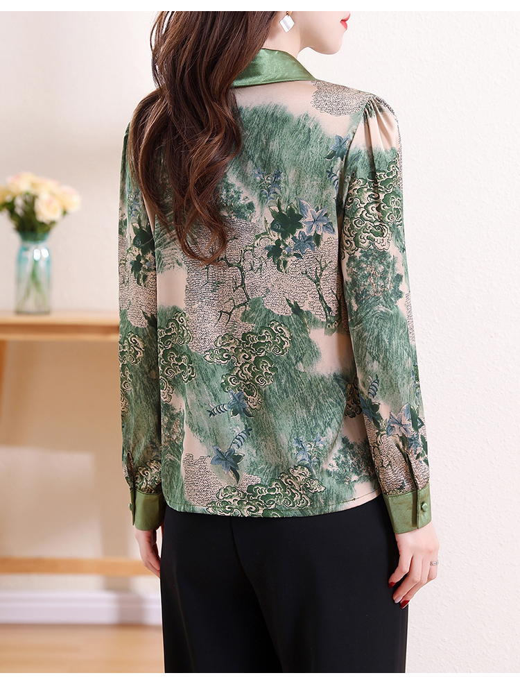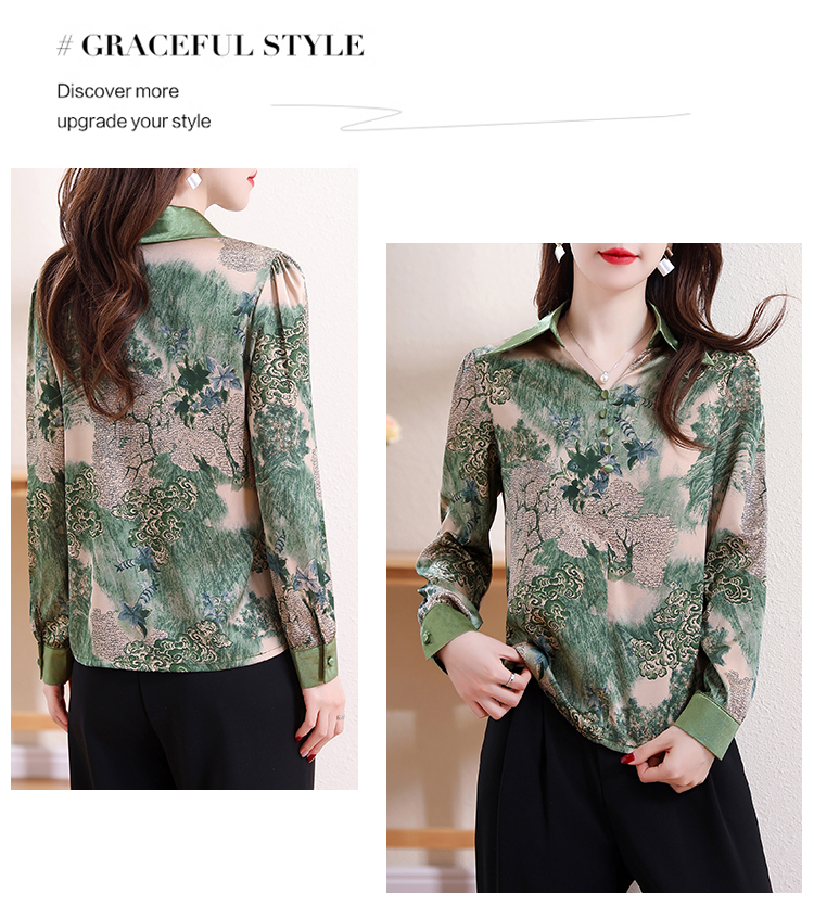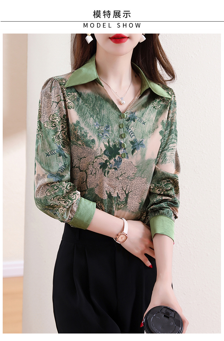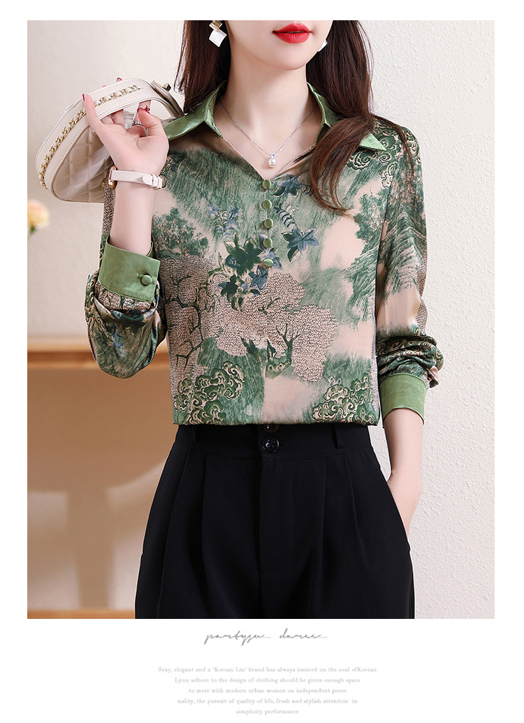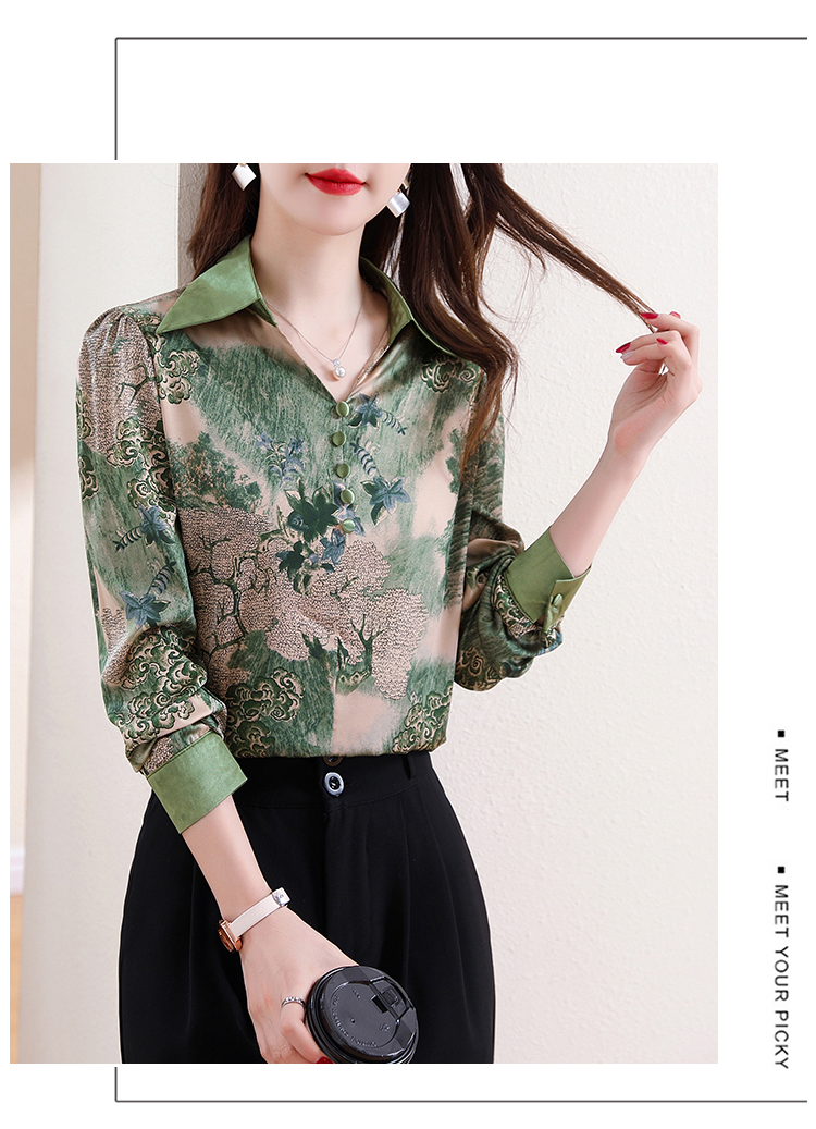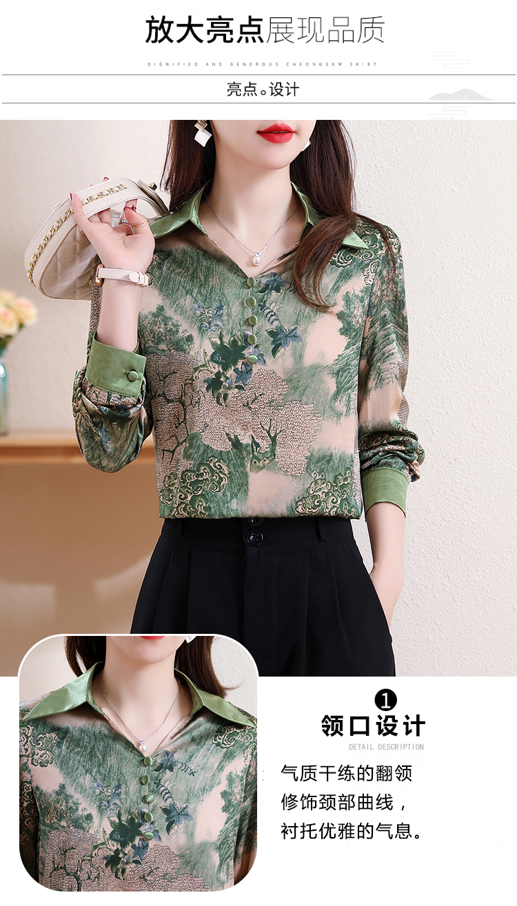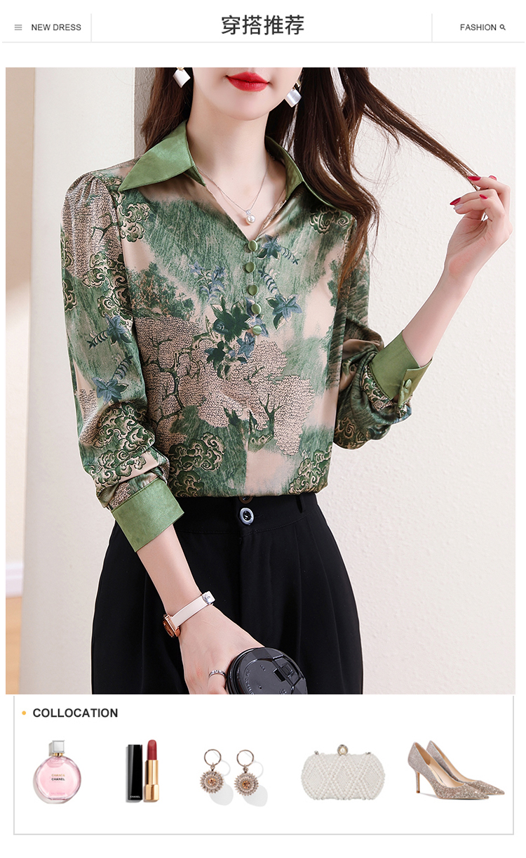 实拍翻领缎面衬衣女2026春季新长袖拼接V领印花百搭时髦显瘦上衣