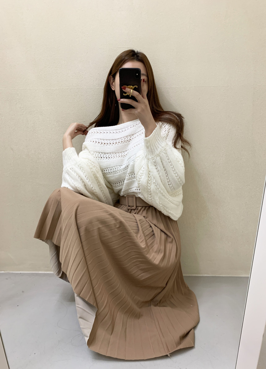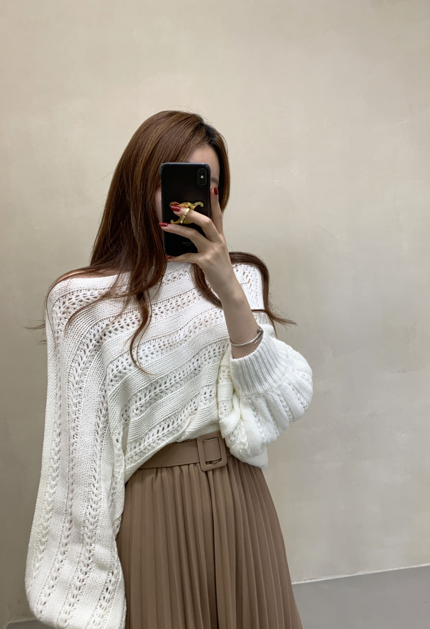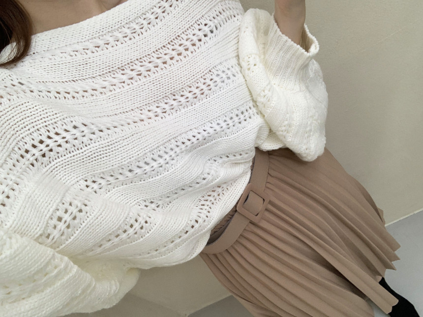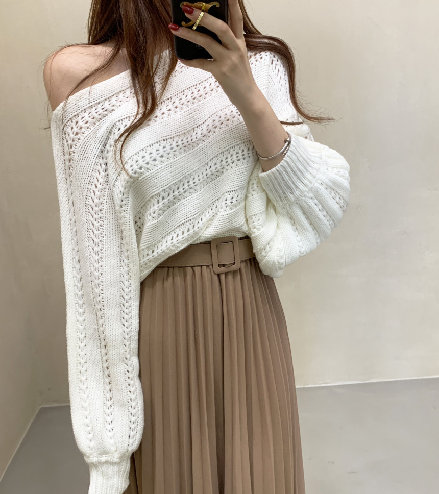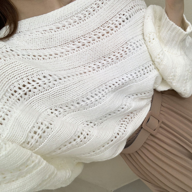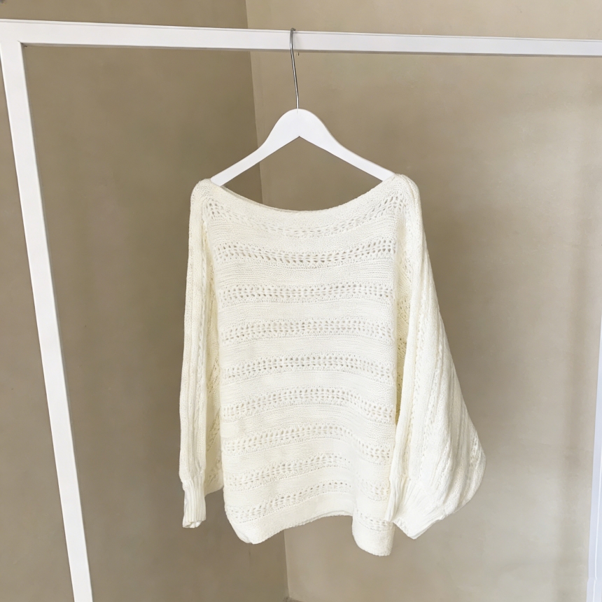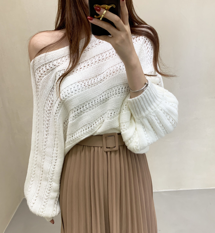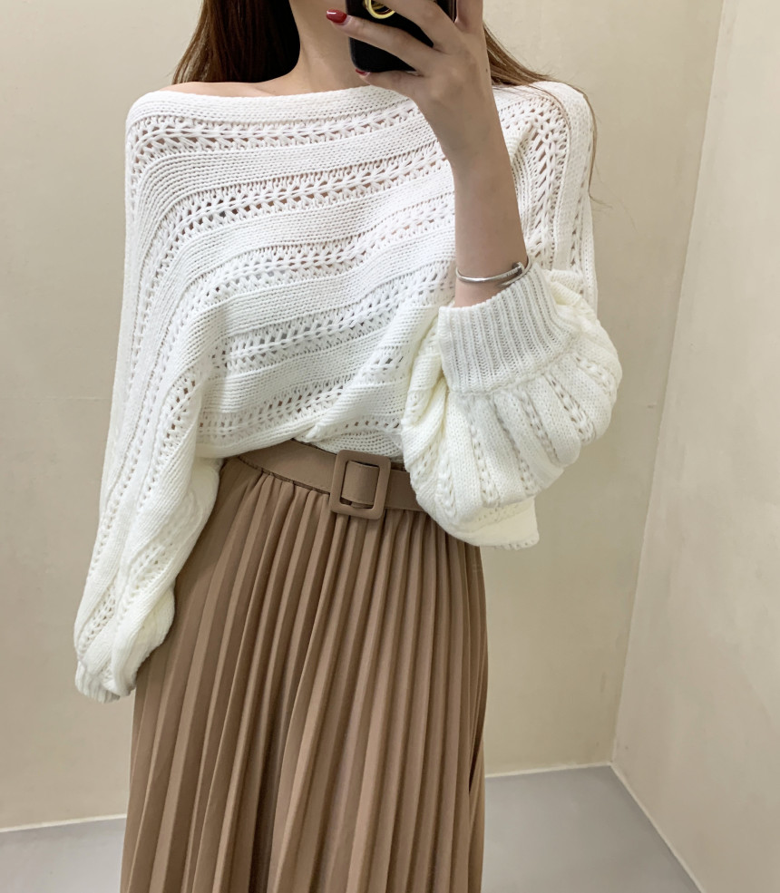 한국 스타일의 부드럽고 편안한 느낌, 오픈워크 오프숄더 디자인, 박쥐 소매, 루즈핏으로 활용도 높고 스타일리시한 스웨터입니다.