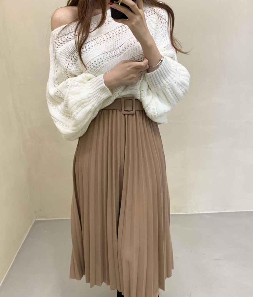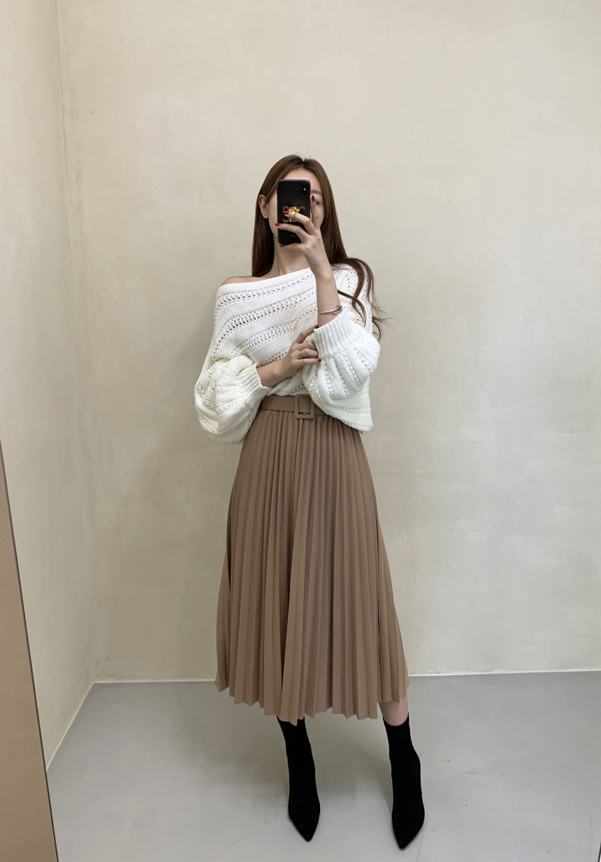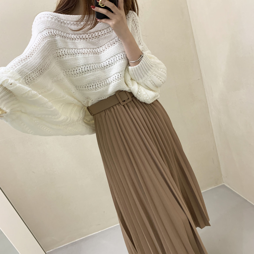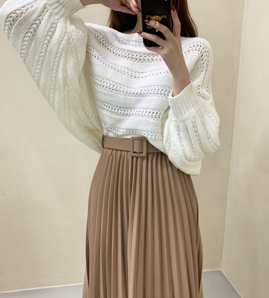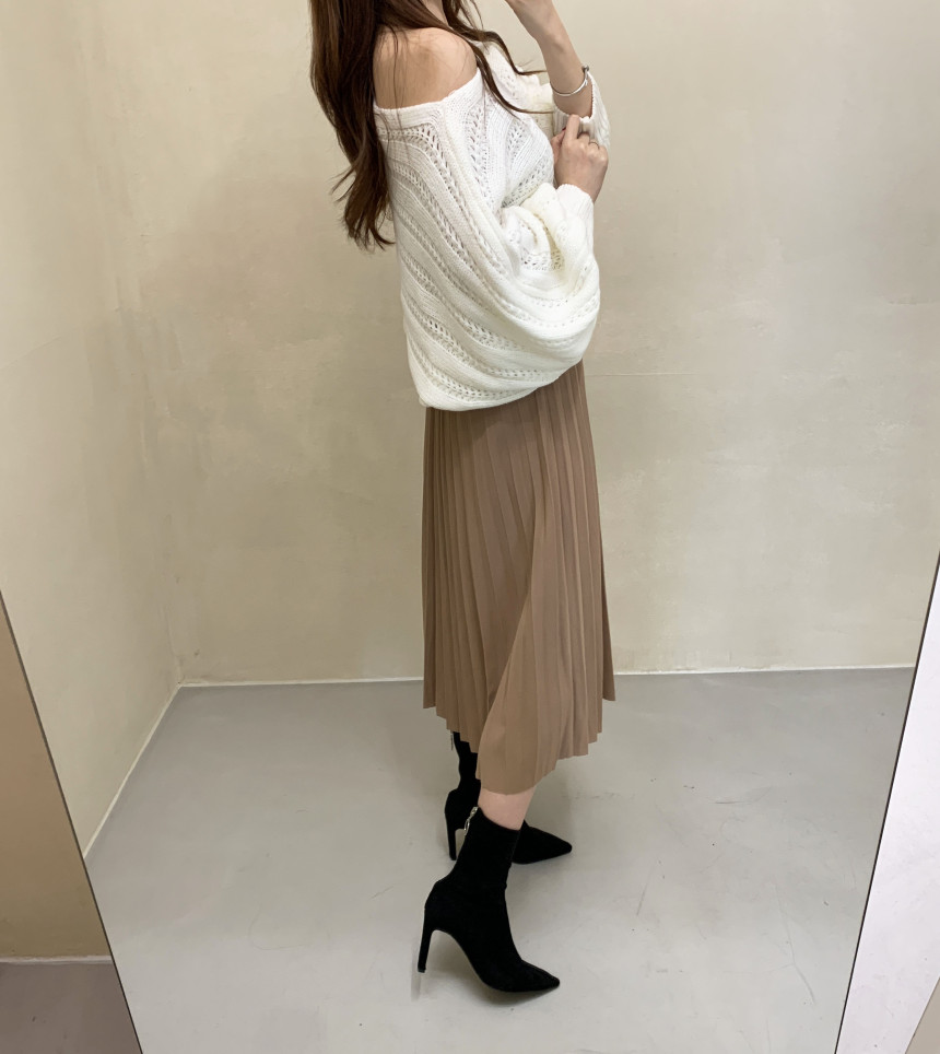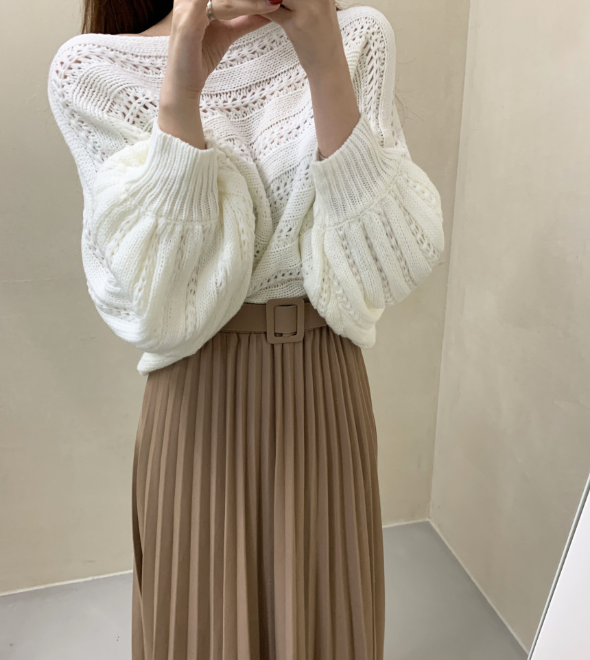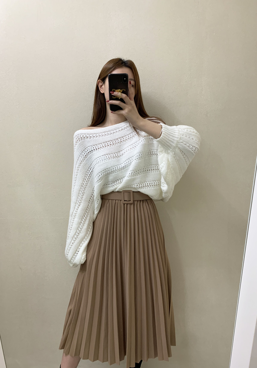 한국 스타일의 부드럽고 편안한 느낌, 오픈워크 오프숄더 디자인, 박쥐 소매, 루즈핏으로 활용도 높고 스타일리시한 스웨터입니다.