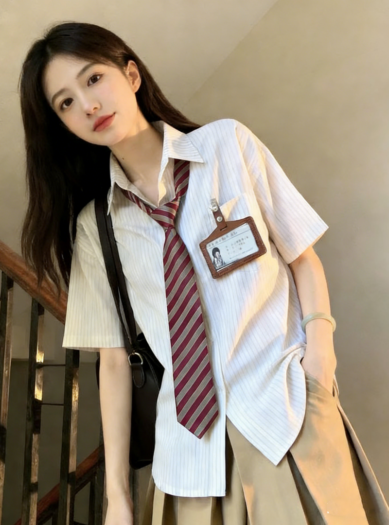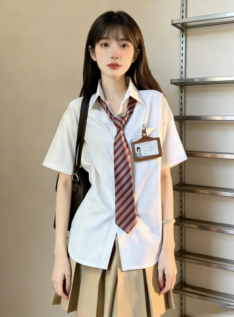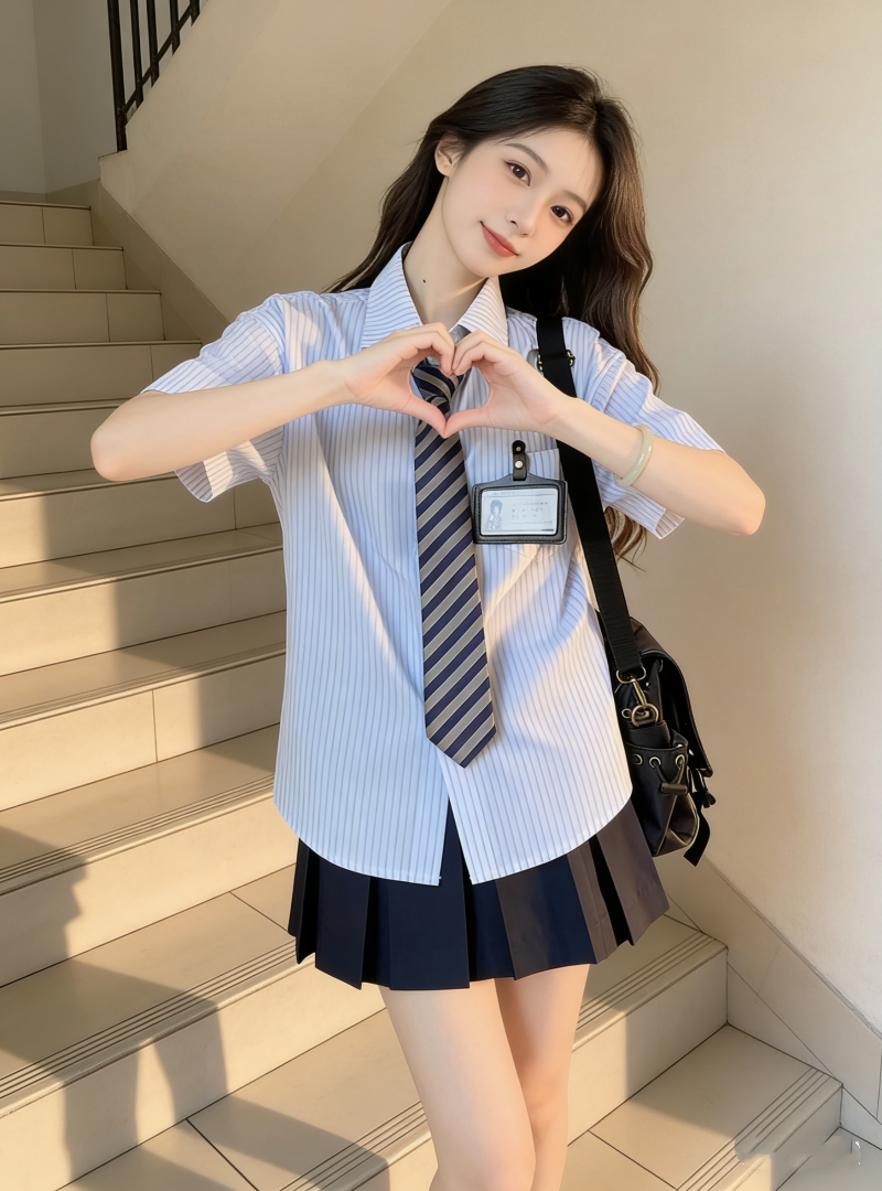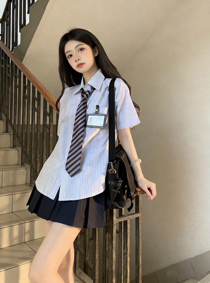小个子茶系穿搭蓝色短袖衬衫百褶短裙学院风减龄两件套装女夏