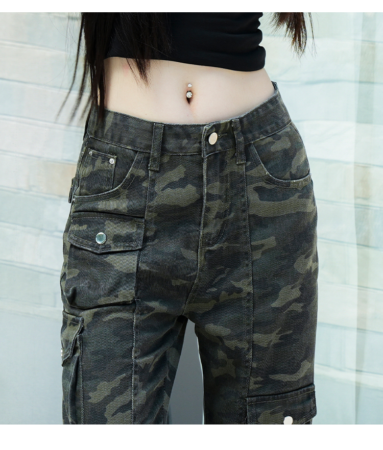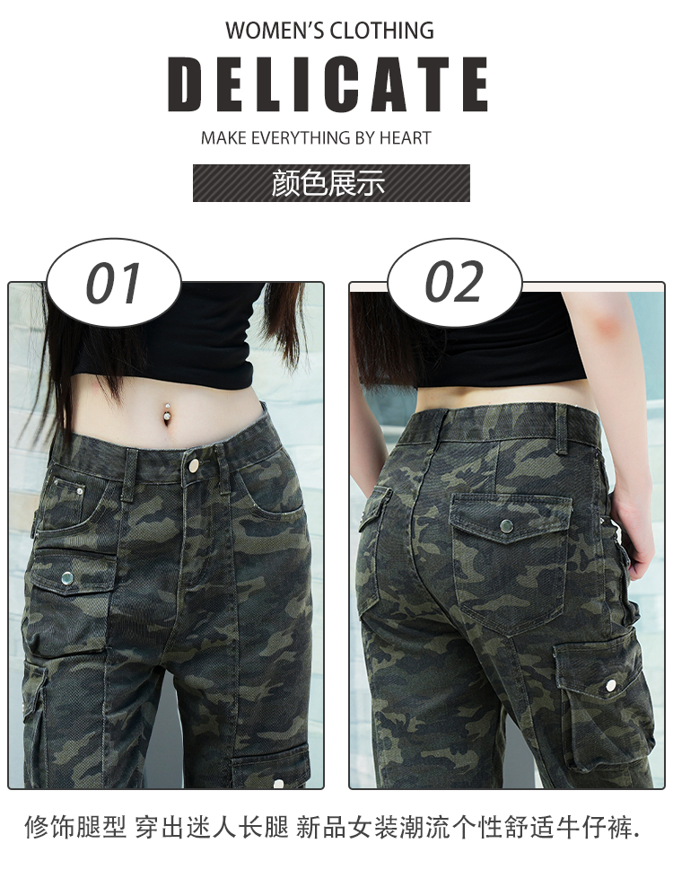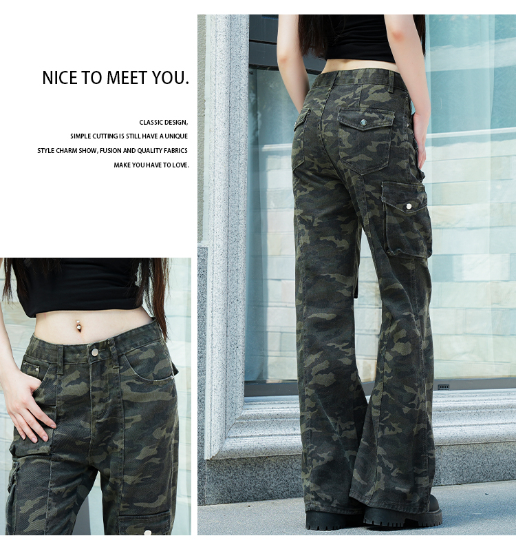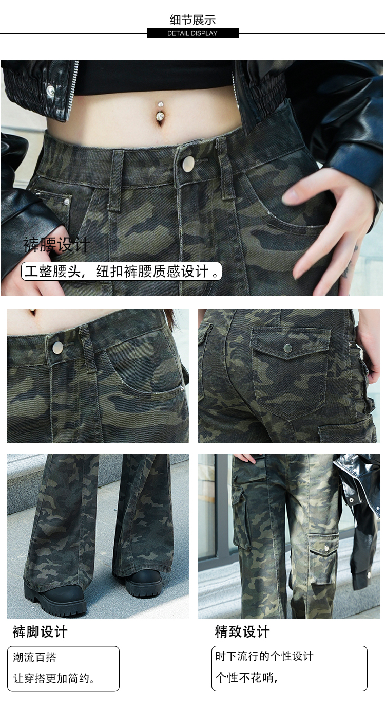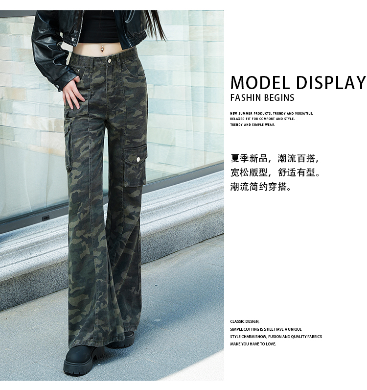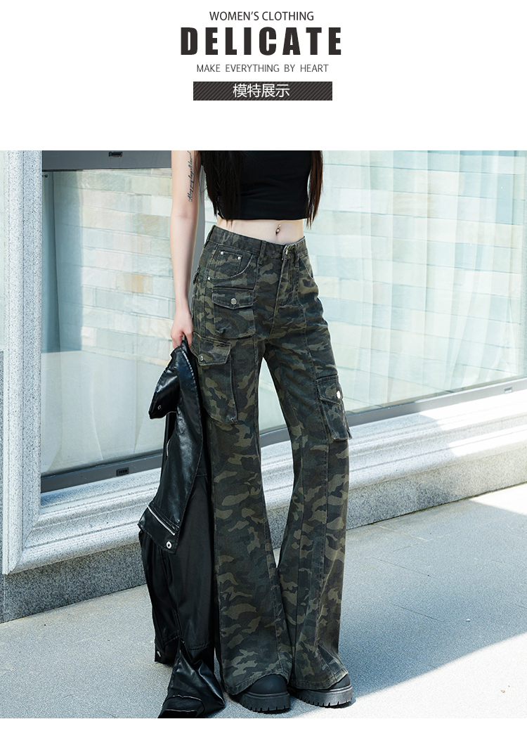 实拍-春款辣妹设计感迷彩工装高腰牛仔裤修身显瘦微喇叭拖地裤