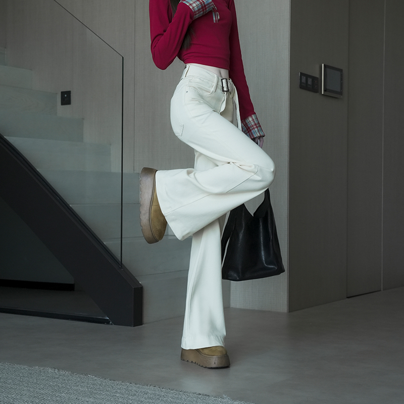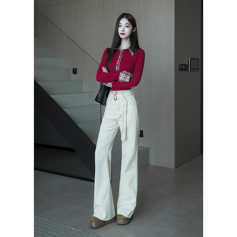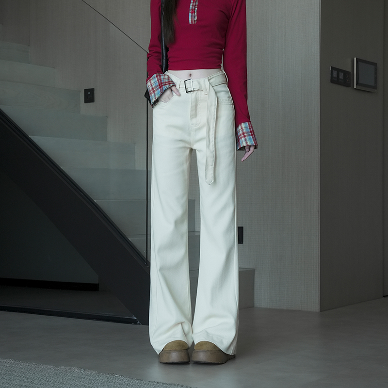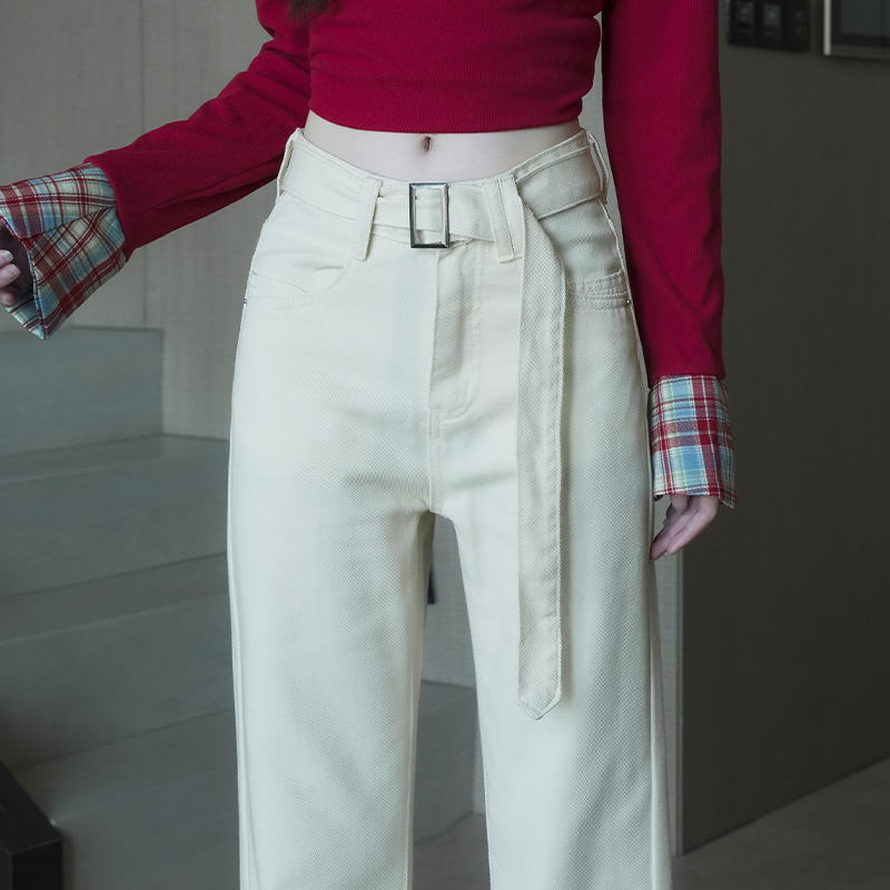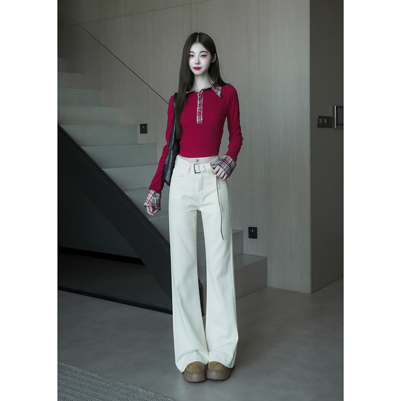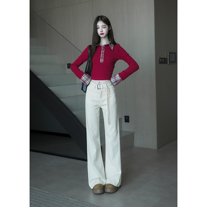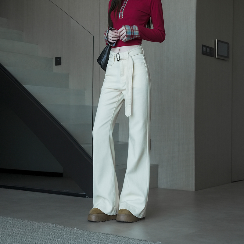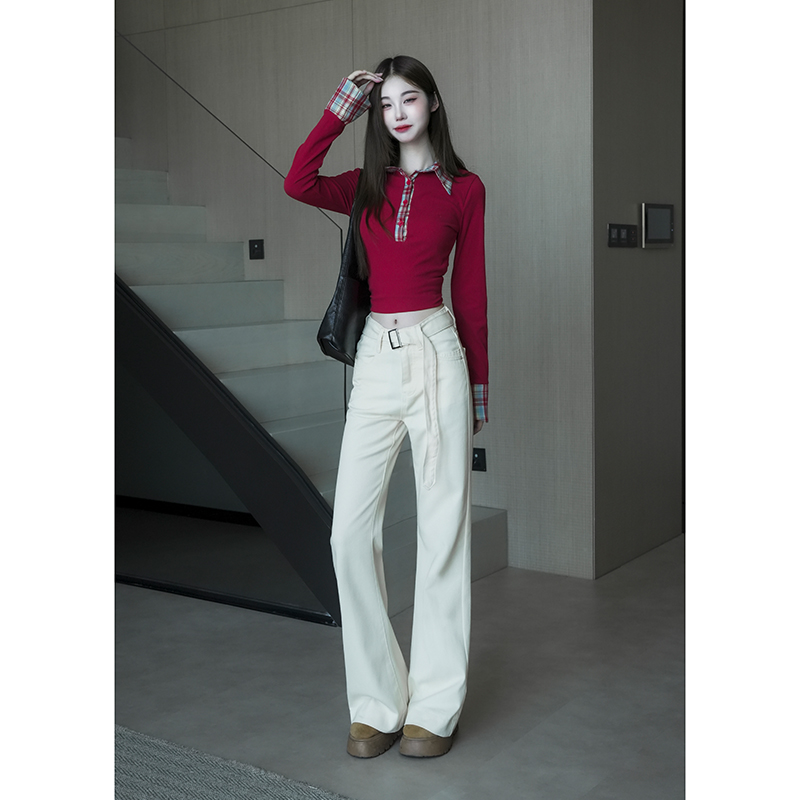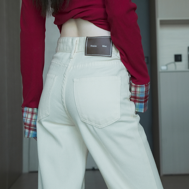 实拍-春款高腰显瘦微喇米杏色阔腿牛仔裤女直筒慵懒垂感拖地裤