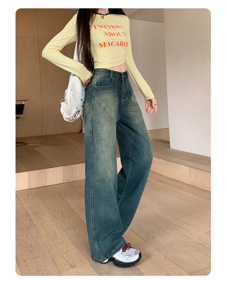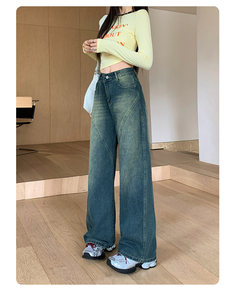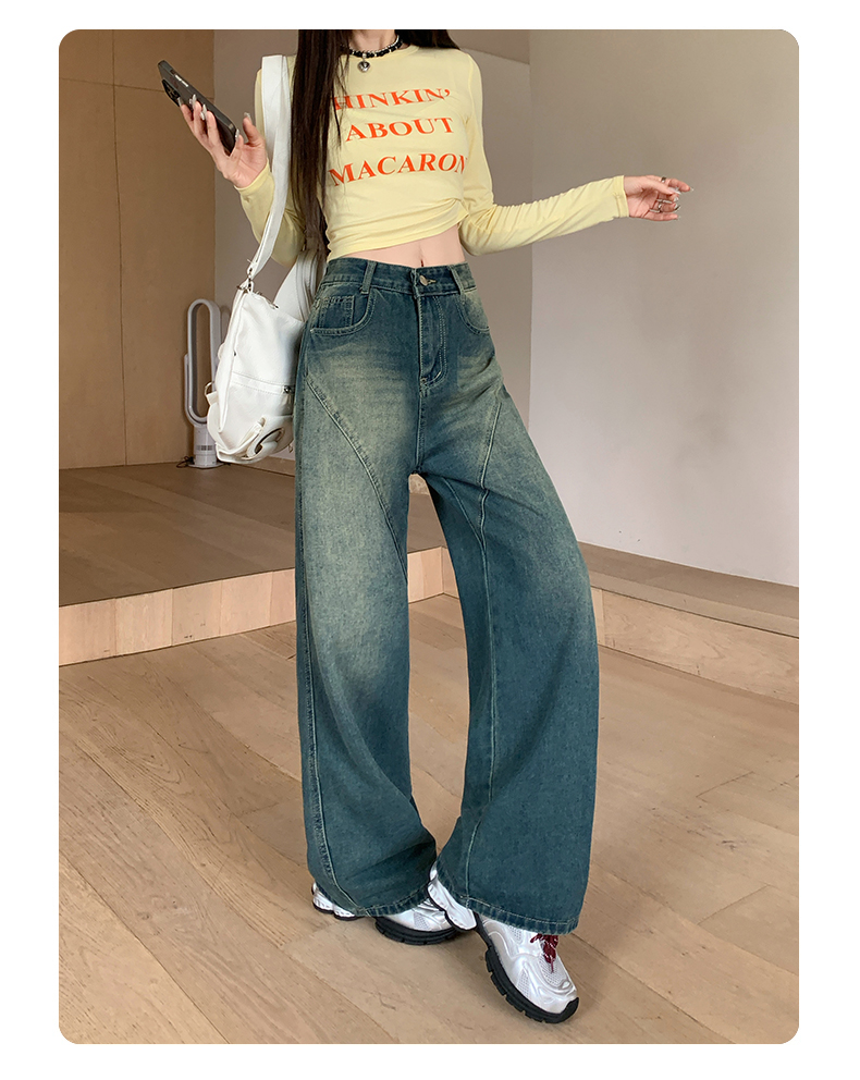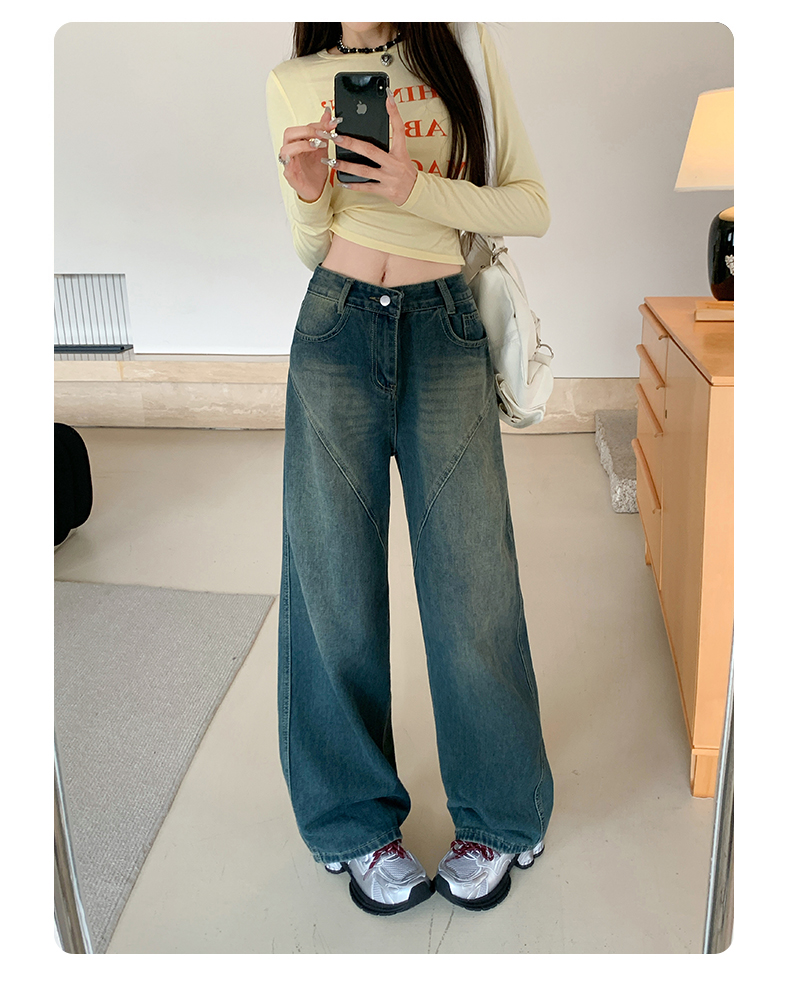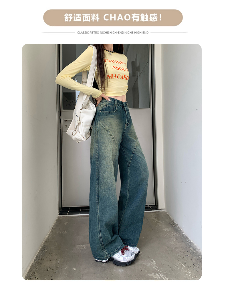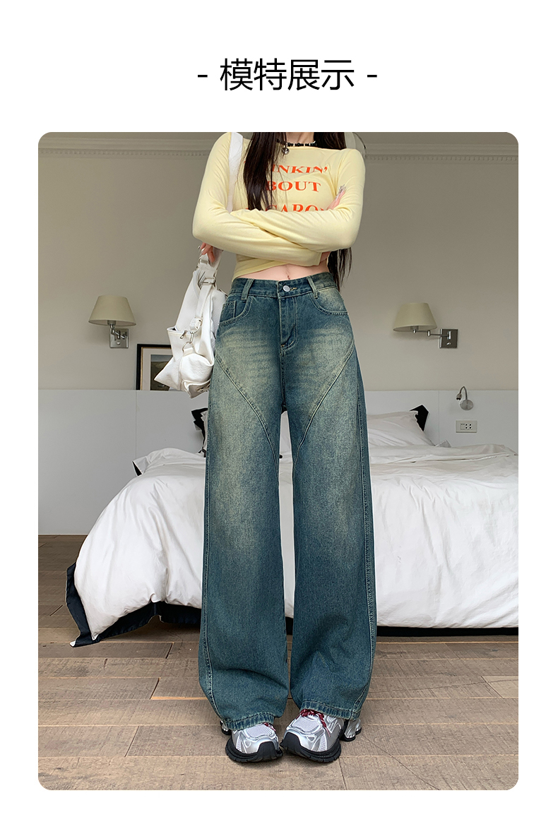 实拍-春秋拼接复古牛仔裤女设计高腰宽松大码胖mm阔腿直筒拖地裤