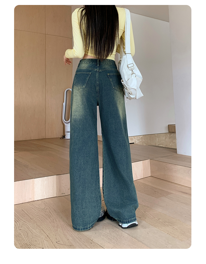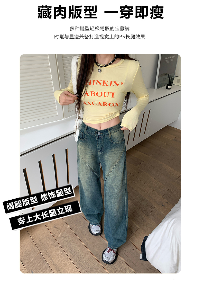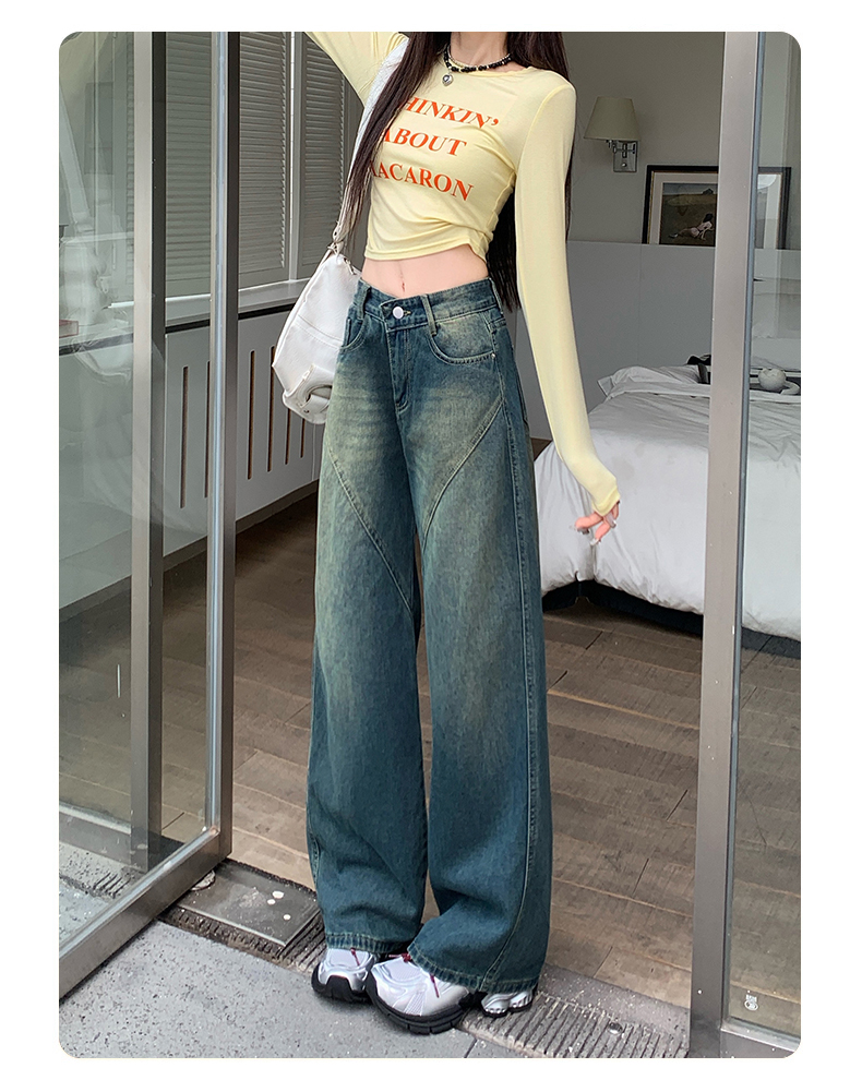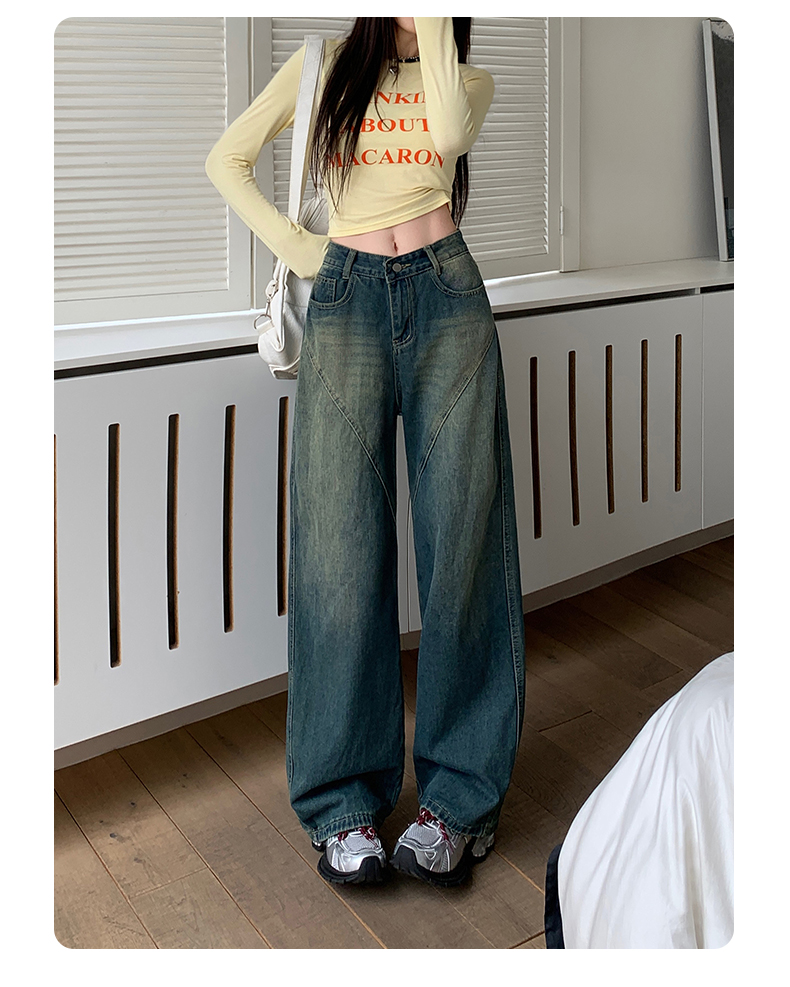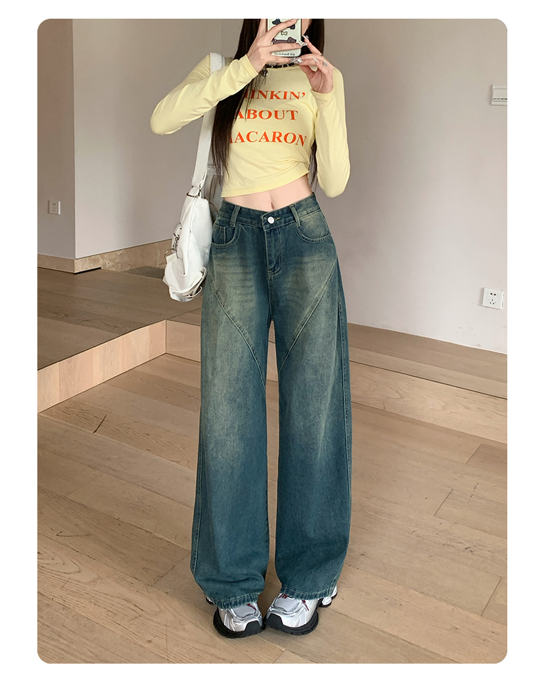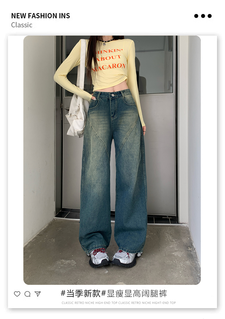 实拍-春秋拼接复古牛仔裤女设计高腰宽松大码胖mm阔腿直筒拖地裤