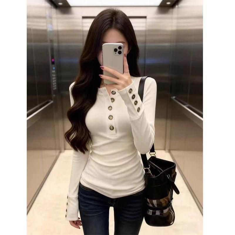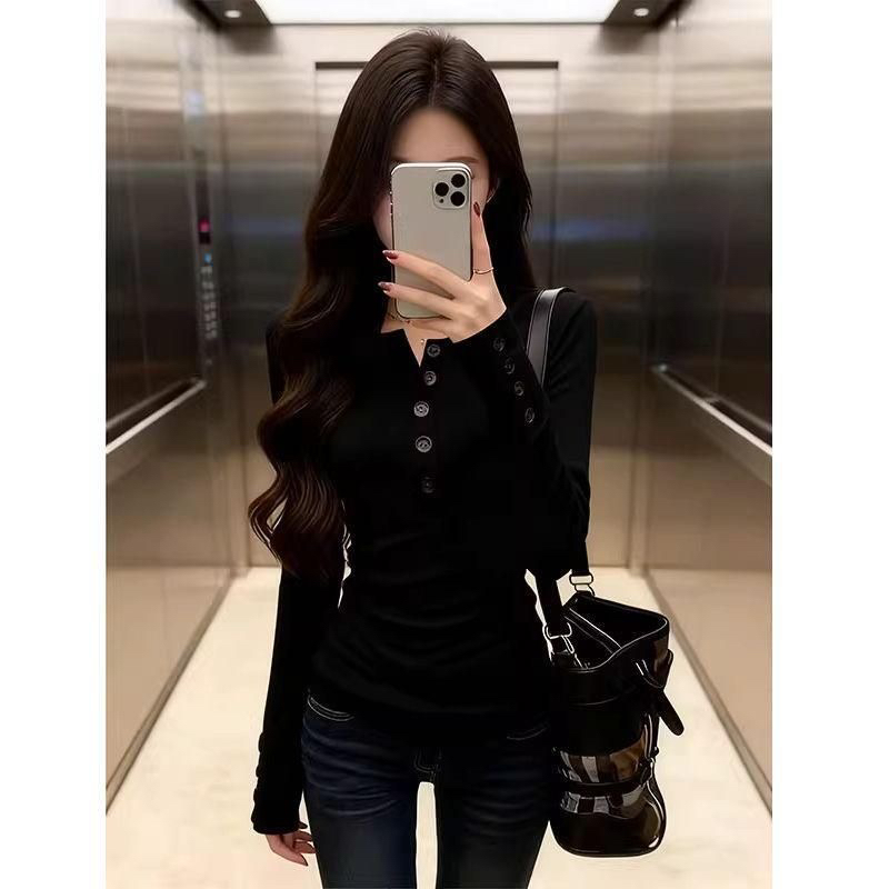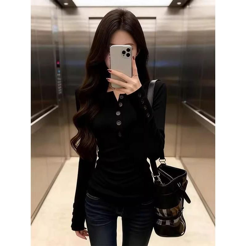 罗纹德绒270克美式亨利领长袖纽扣T恤秋冬修身显瘦气质打底上衣