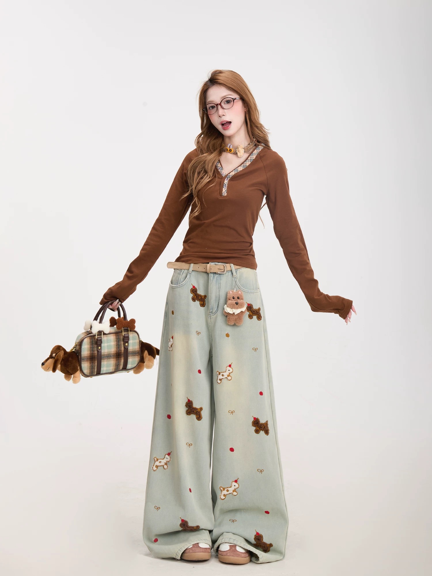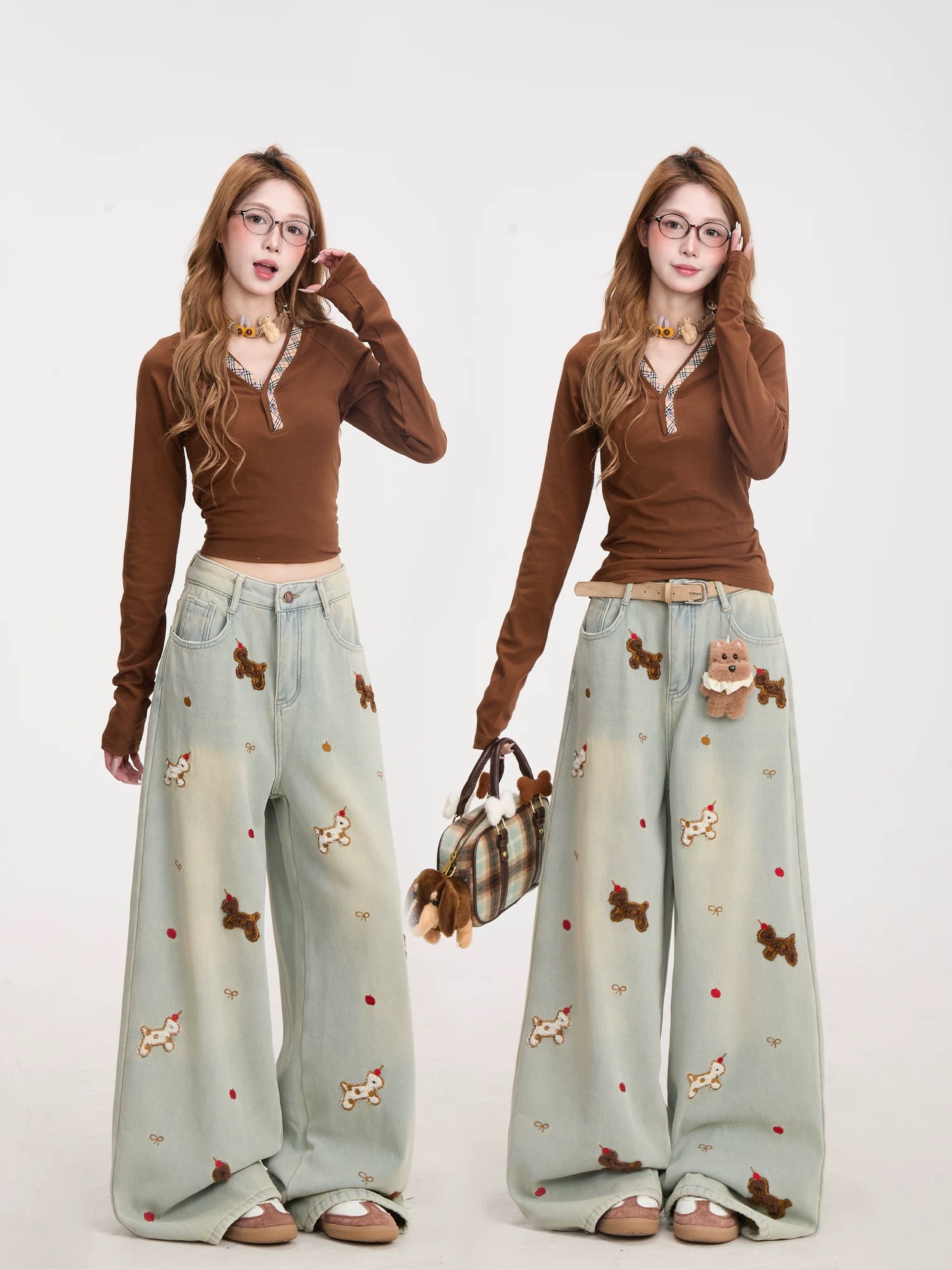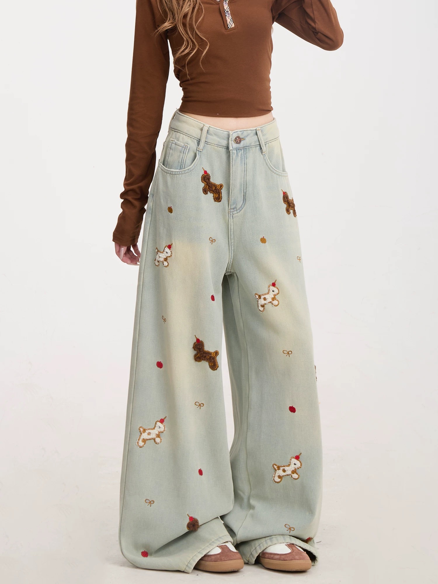 趣味小狗刺绣牛仔裤女复古慵懒水洗裤子宽松直筒阔腿裤