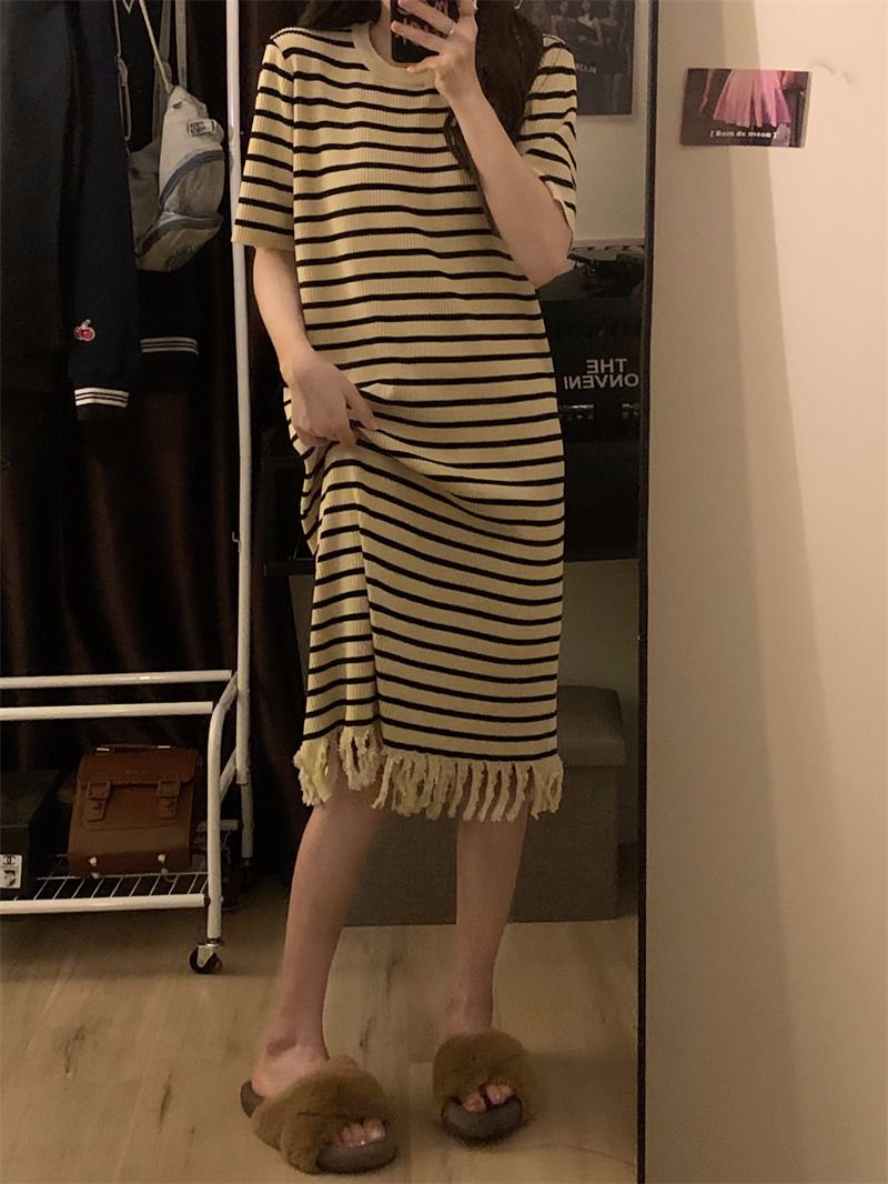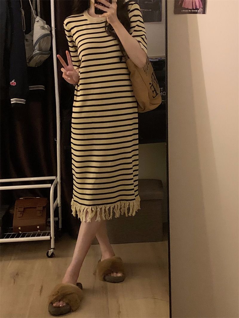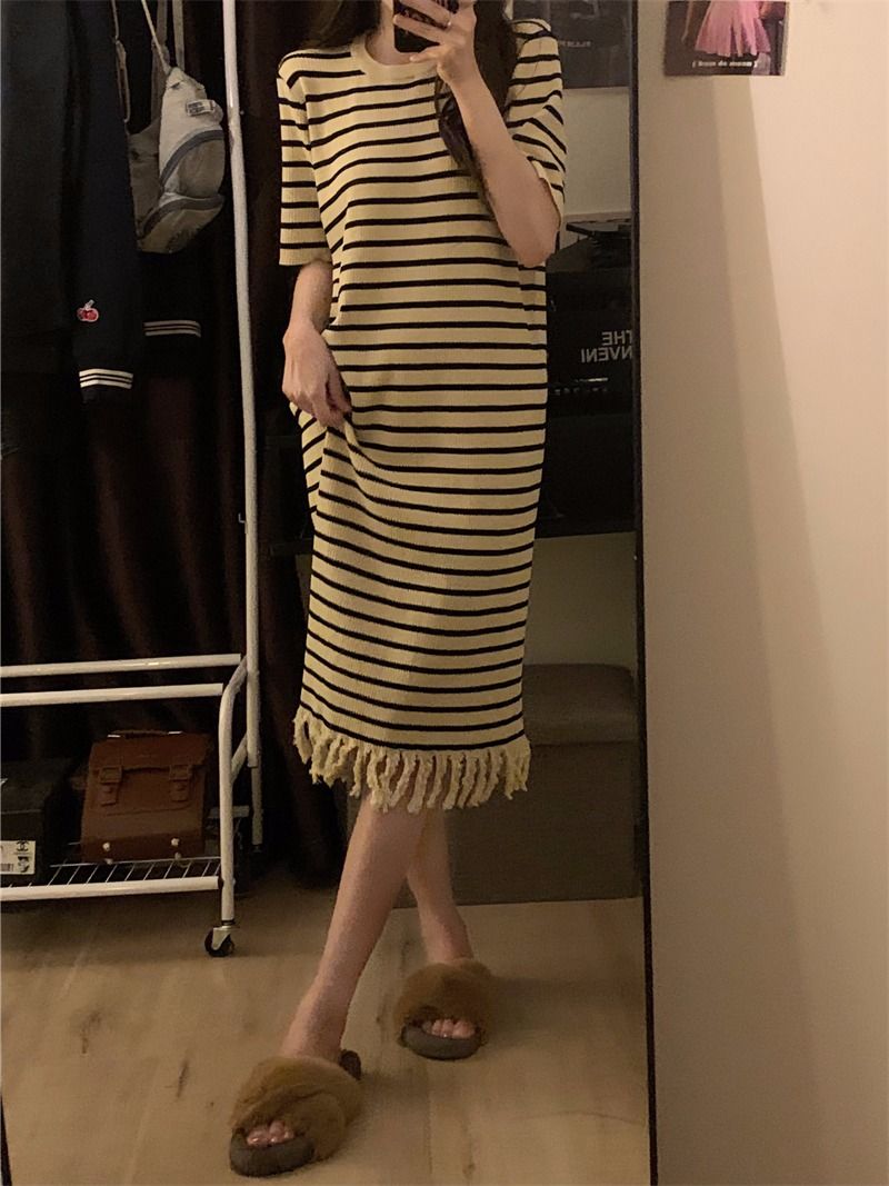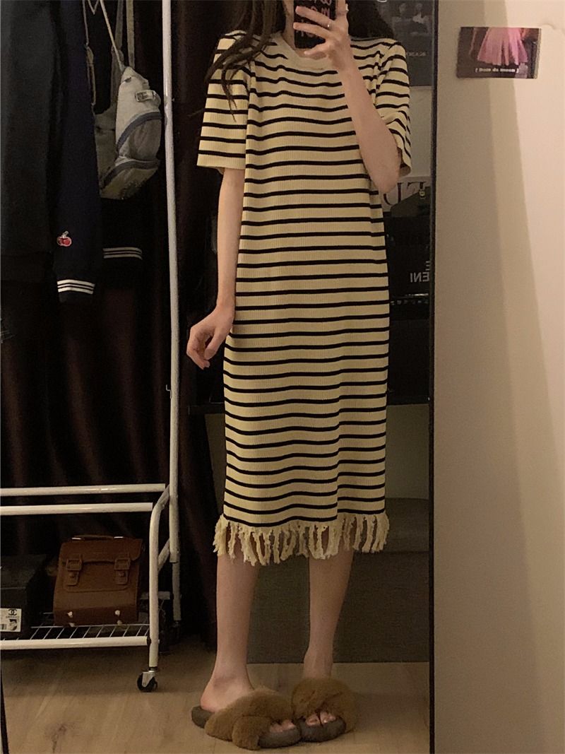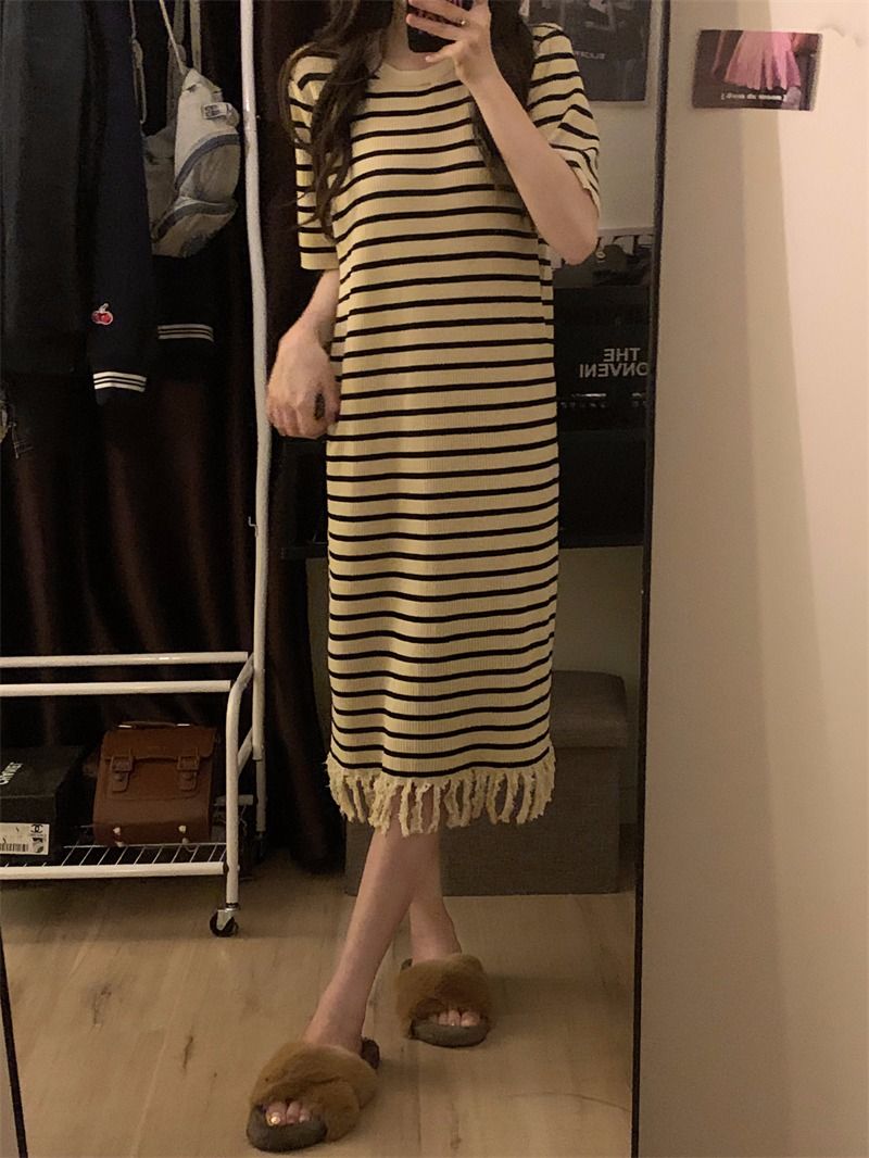 流苏条纹短袖针织连衣裙内搭打底裙长裙女茶歇法式气质2026年夏季