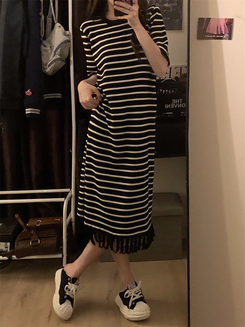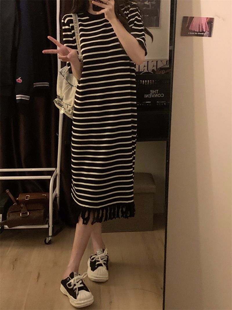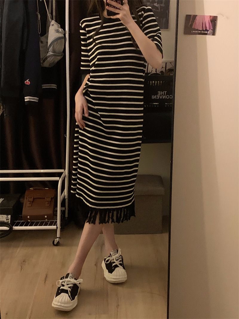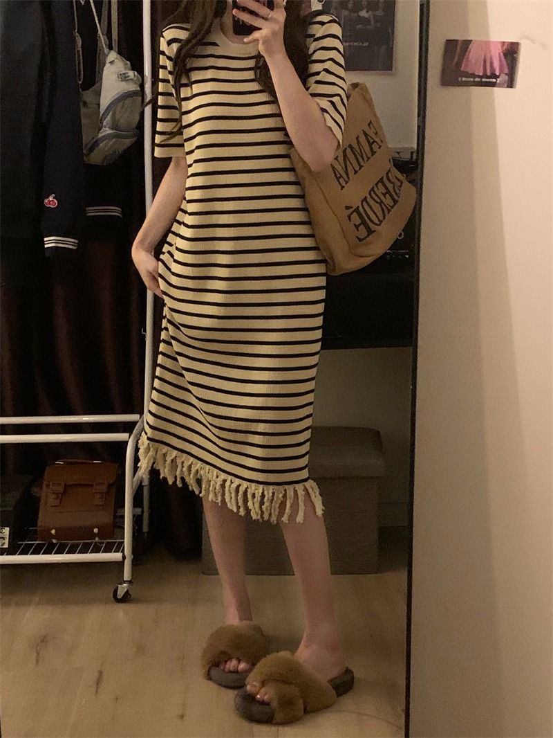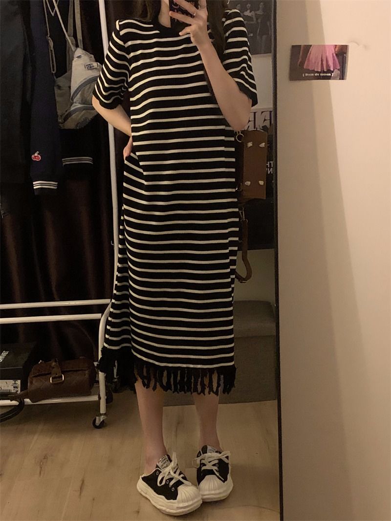流苏条纹短袖针织连衣裙内搭打底裙长裙女茶歇法式气质2026年夏季