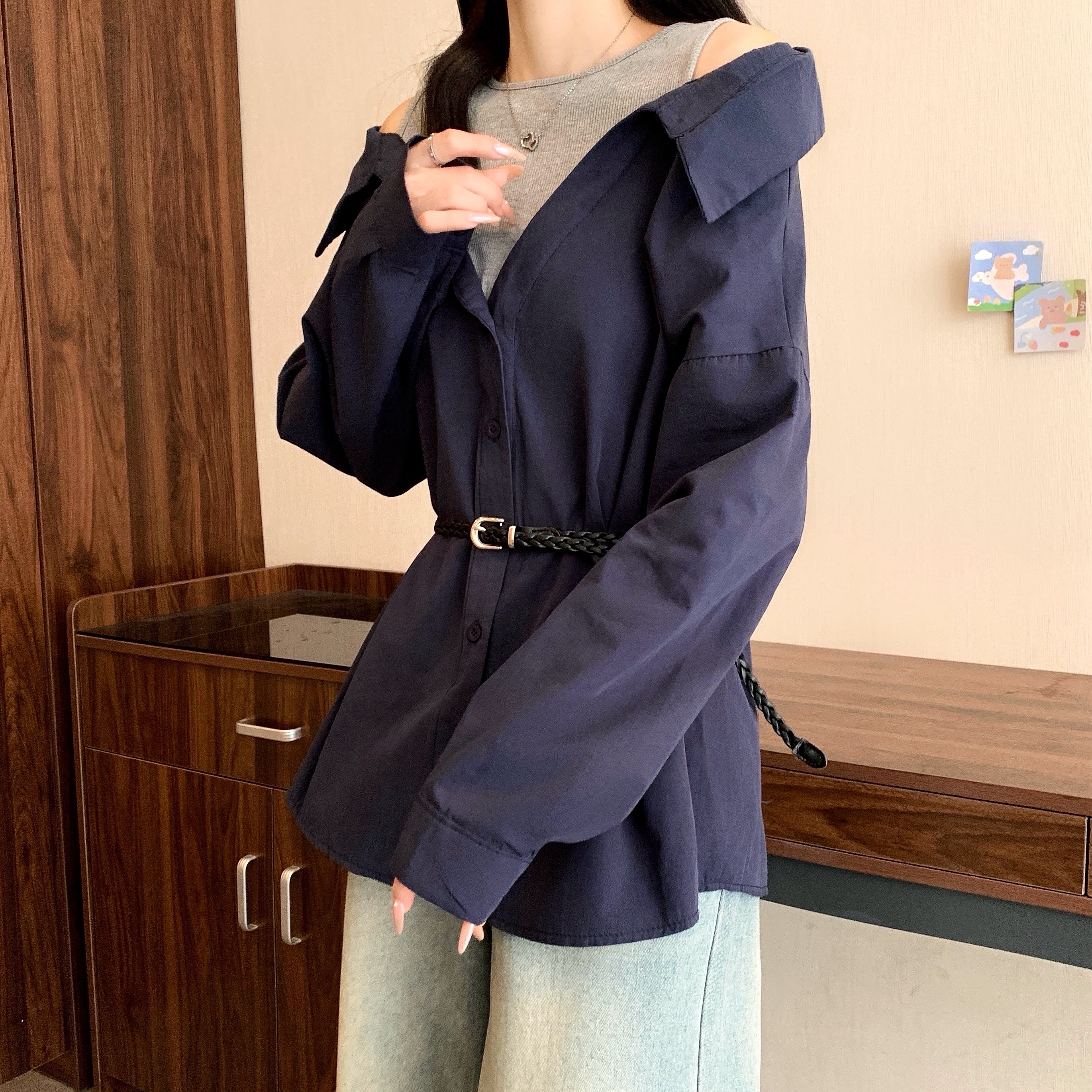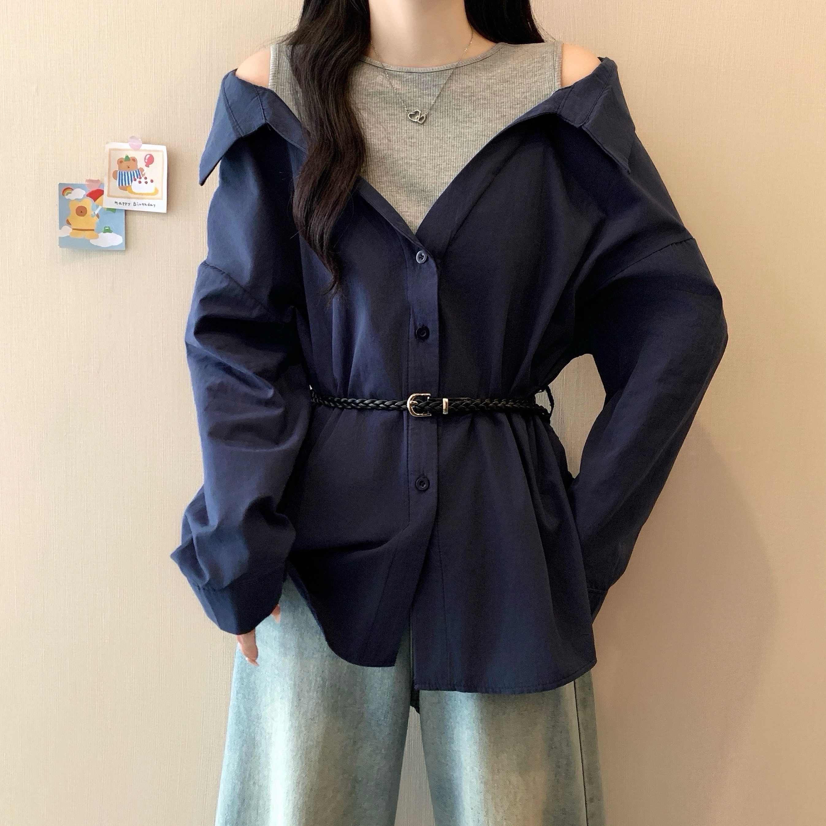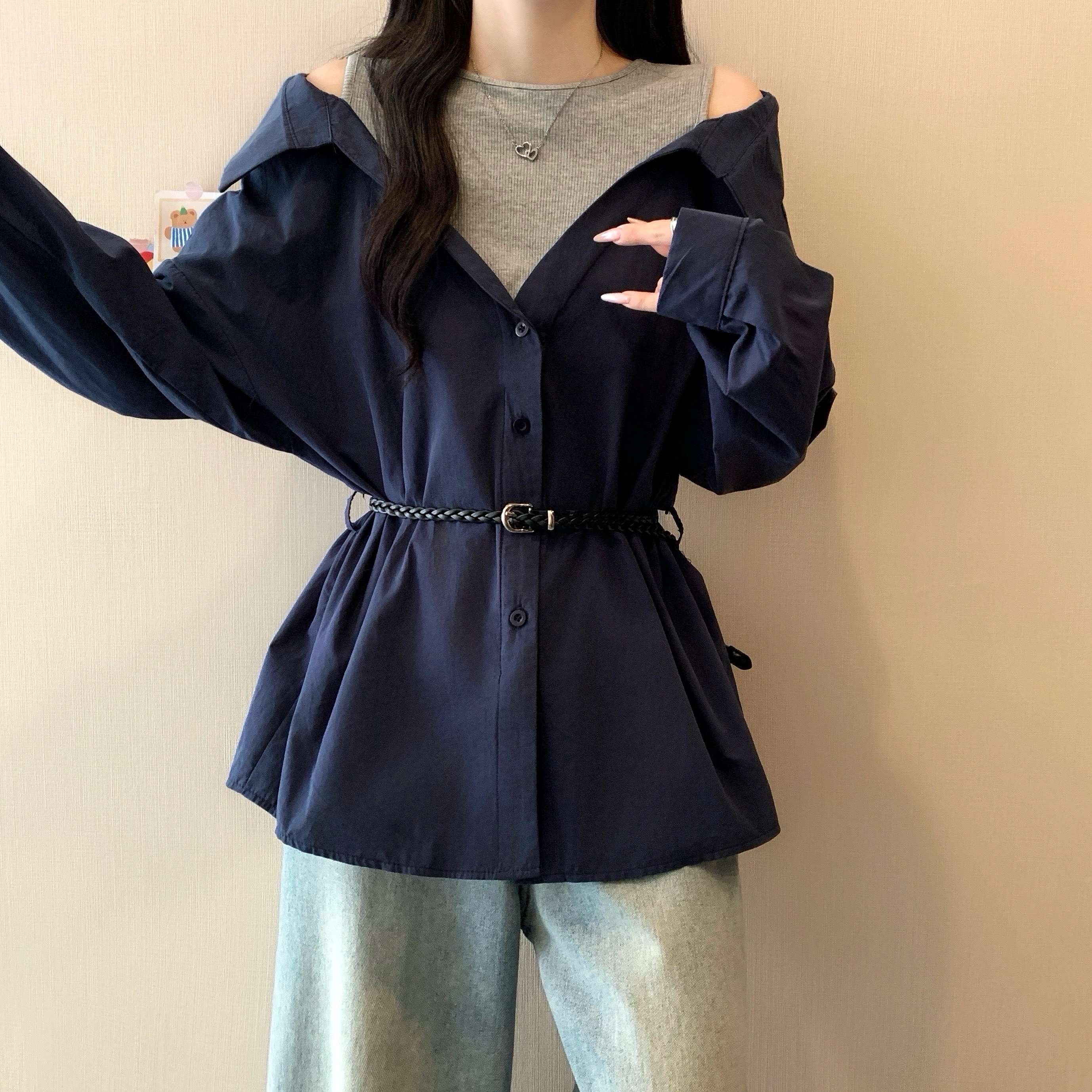 中长款系带收腰长袖衬衫女款春夏2026大码胖mm显瘦假两件露肩上衣