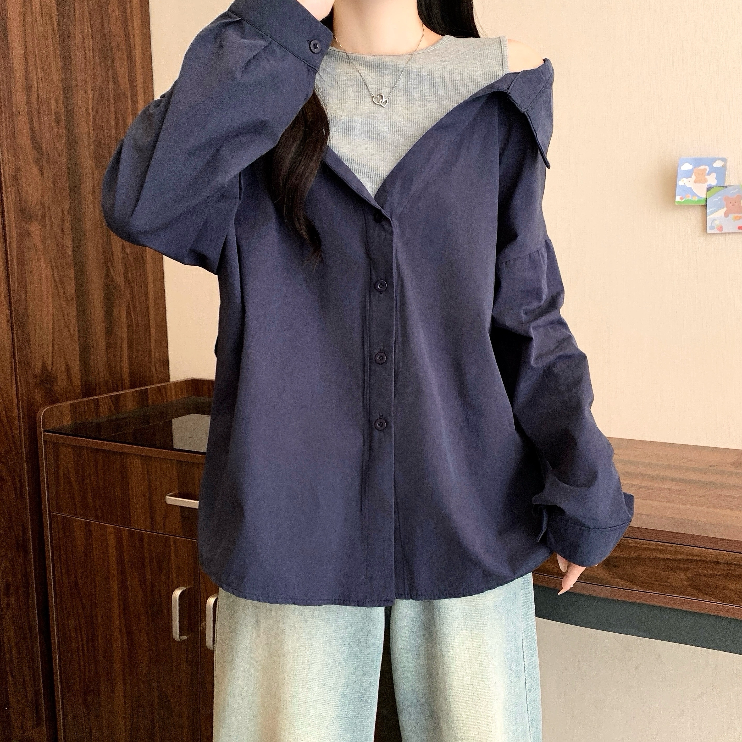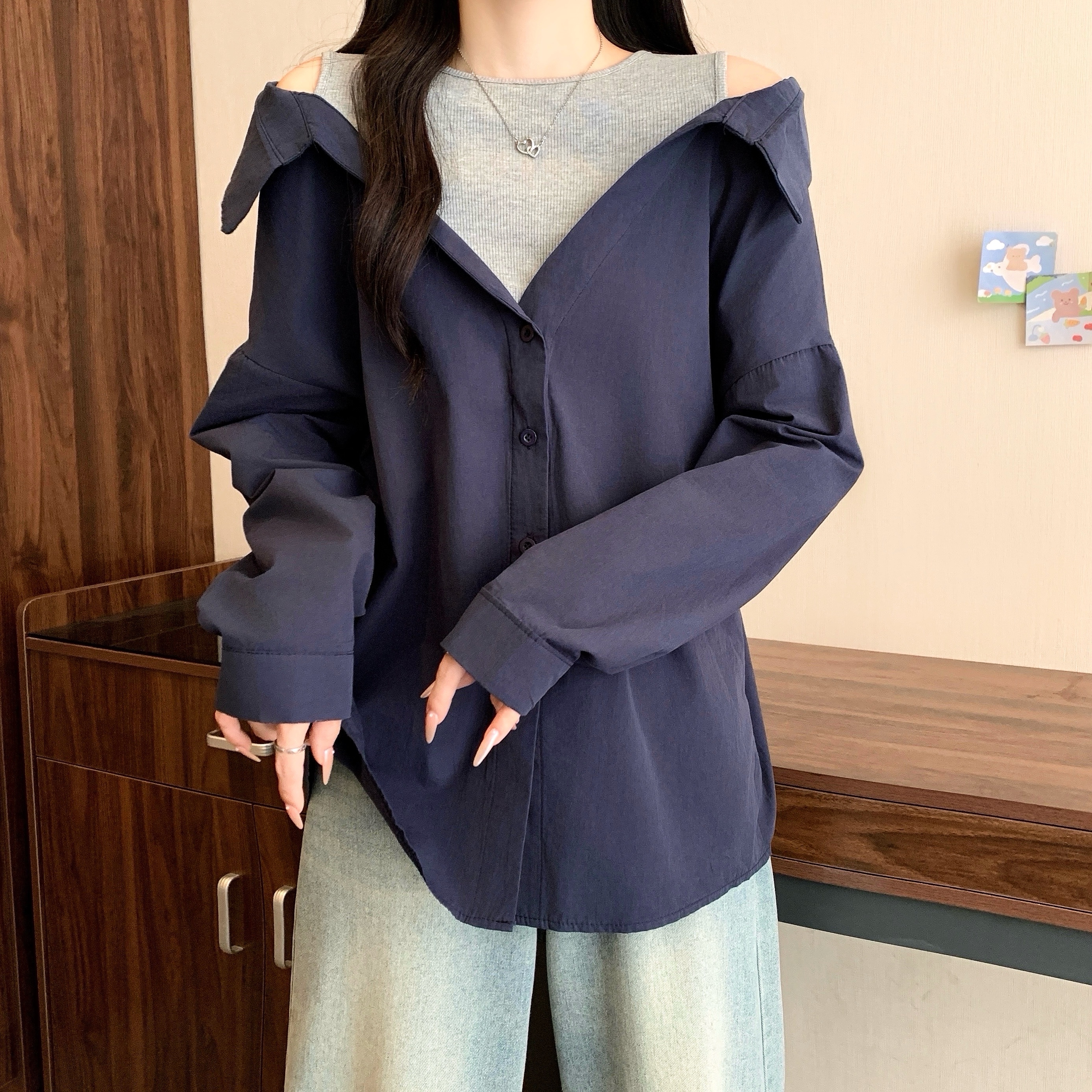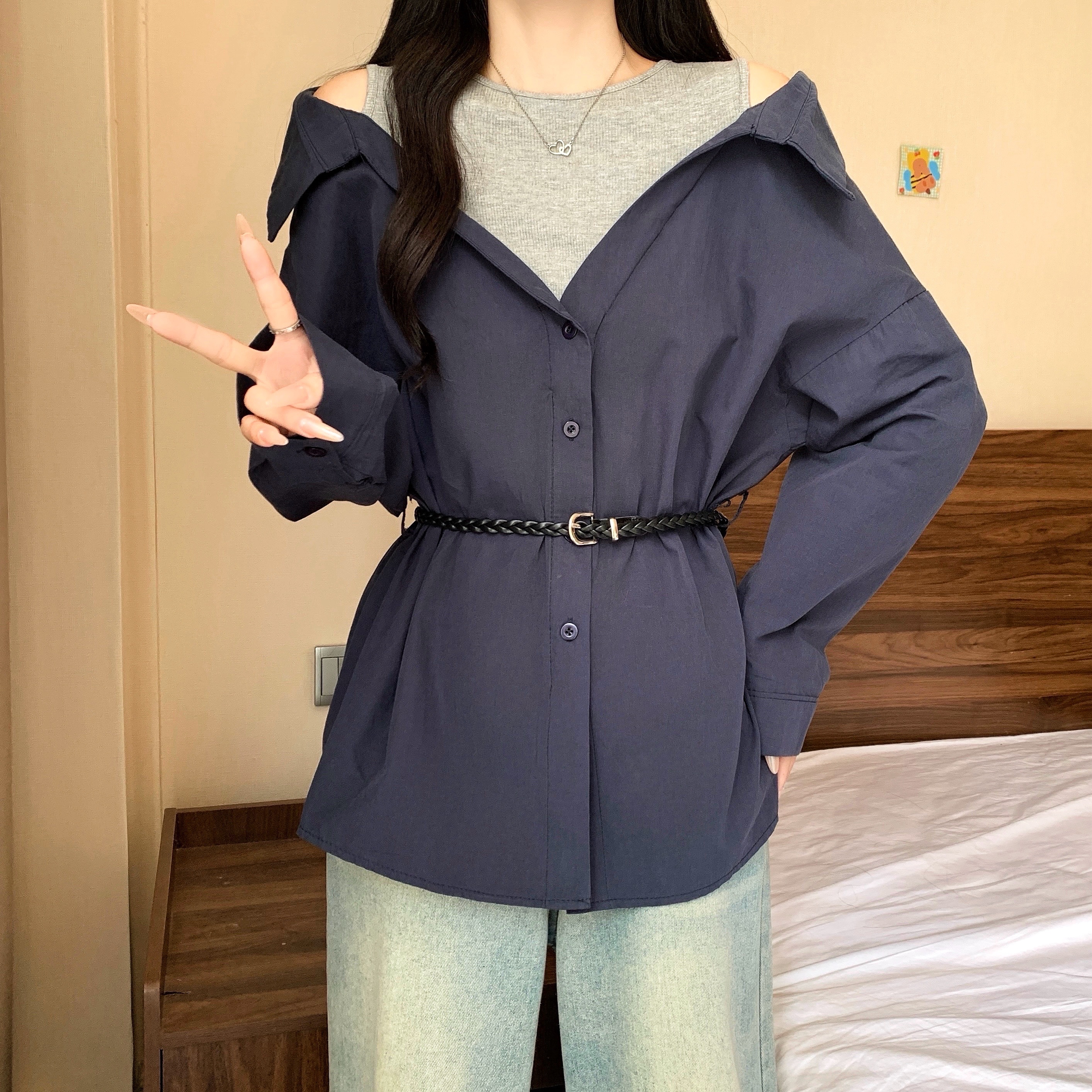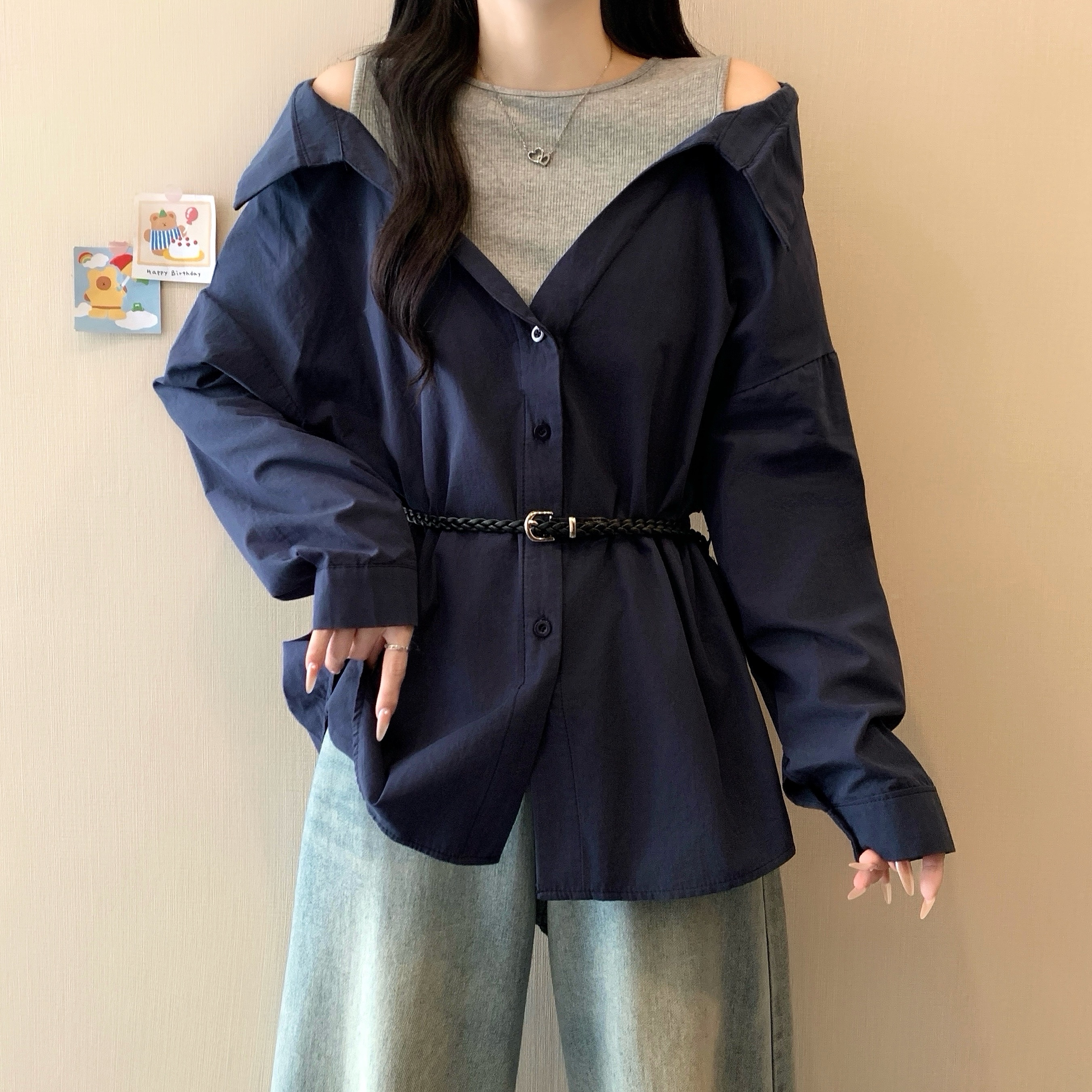 中长款系带收腰长袖衬衫女款春夏2026大码胖mm显瘦假两件露肩上衣