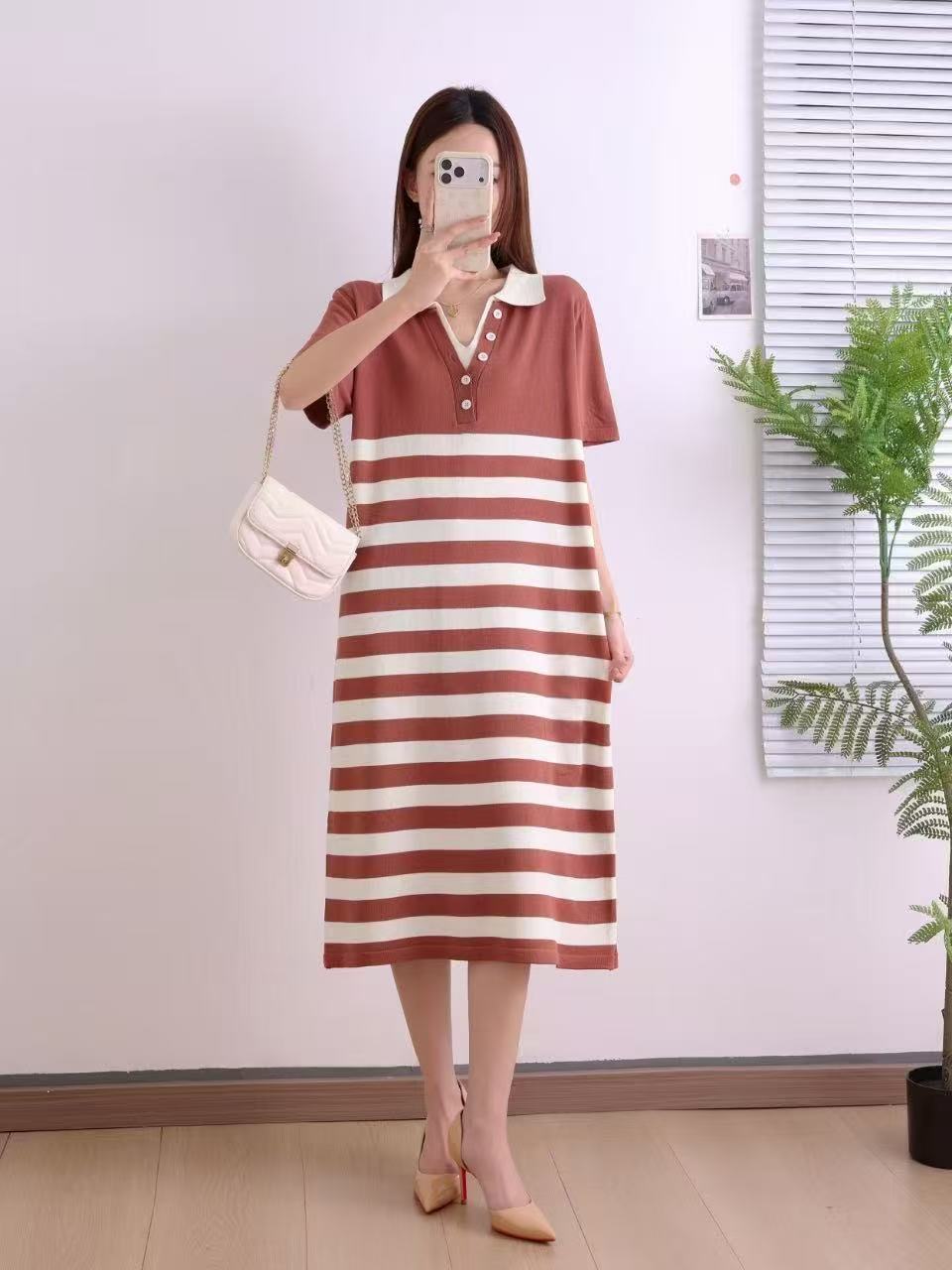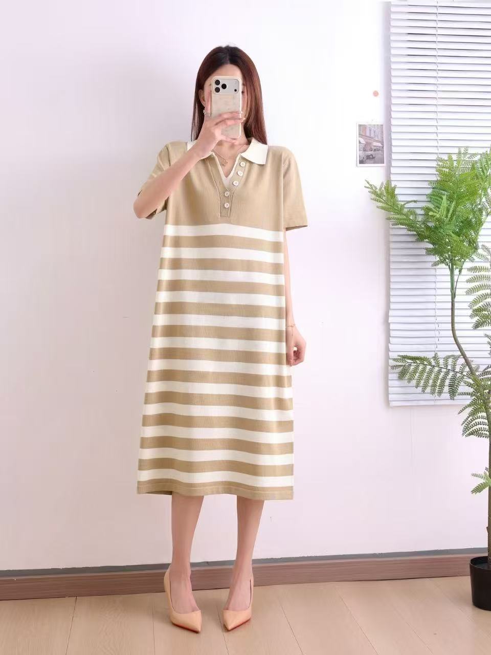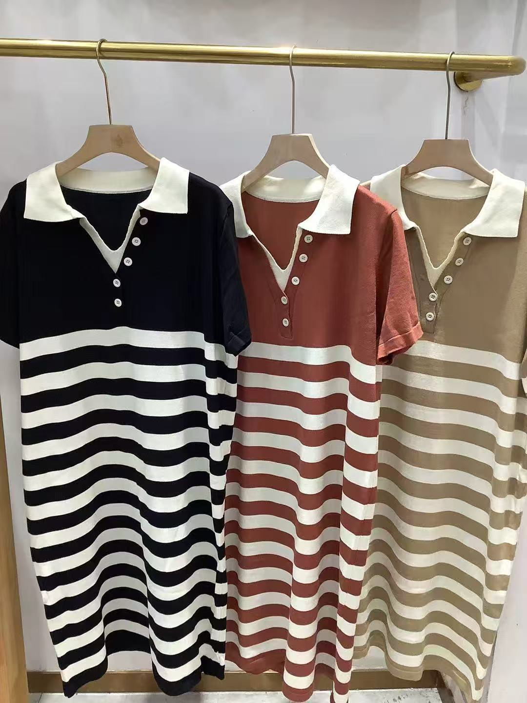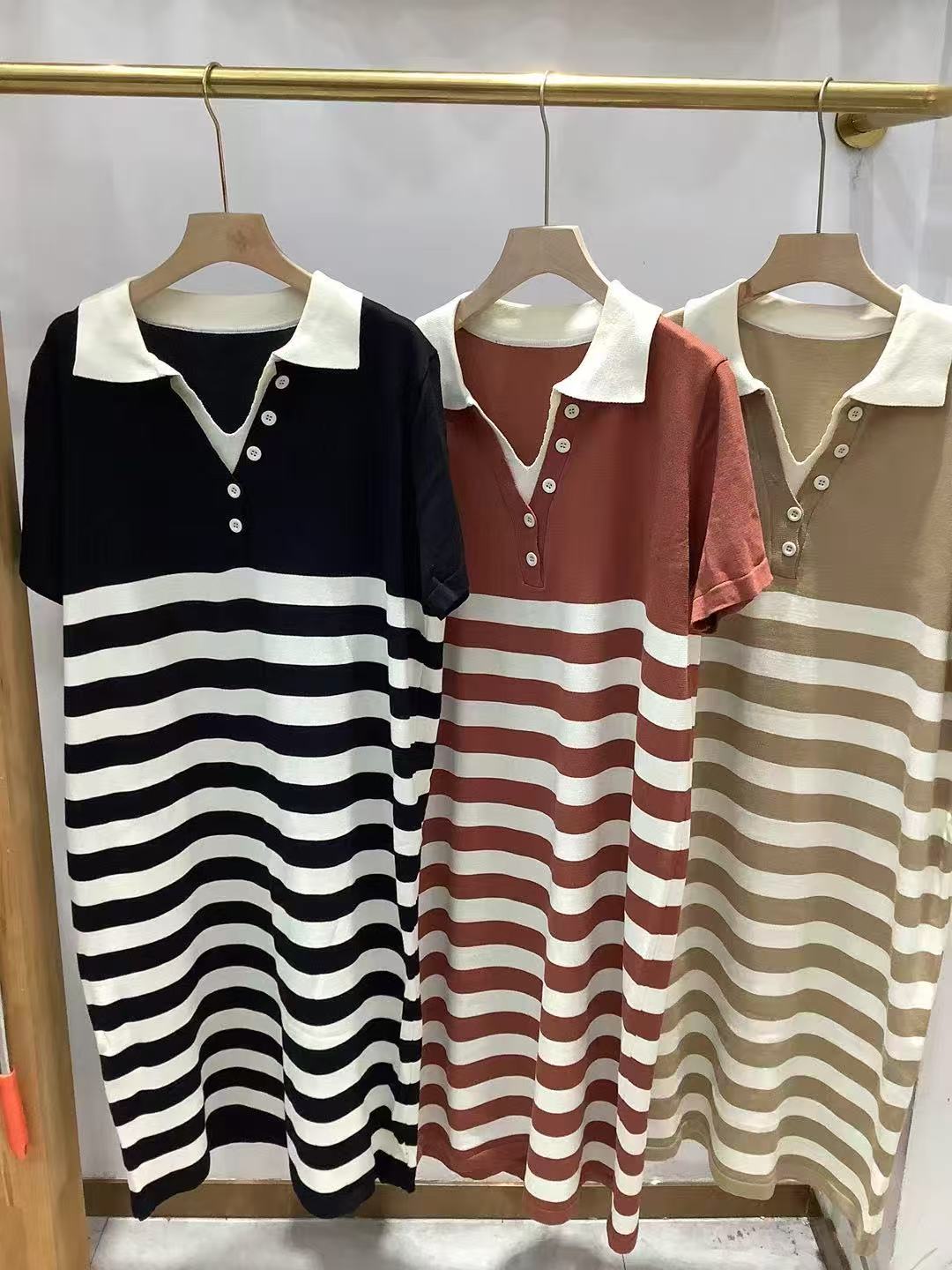 韩国chic夏季法式小众翻领撞色条纹提花宽松休闲短袖针织连衣裙女
