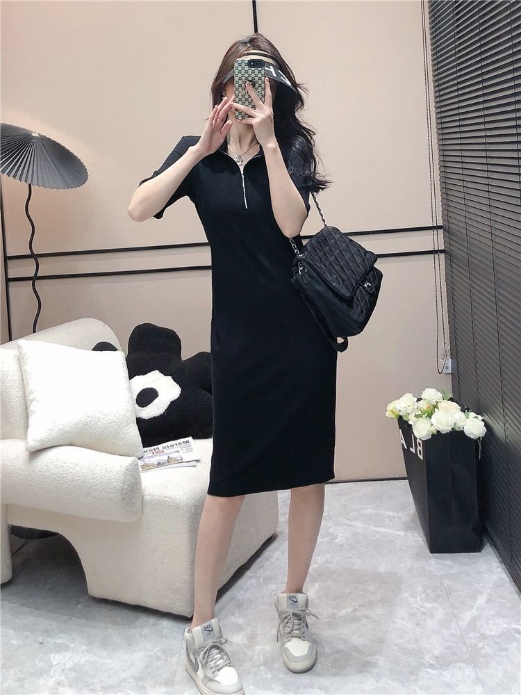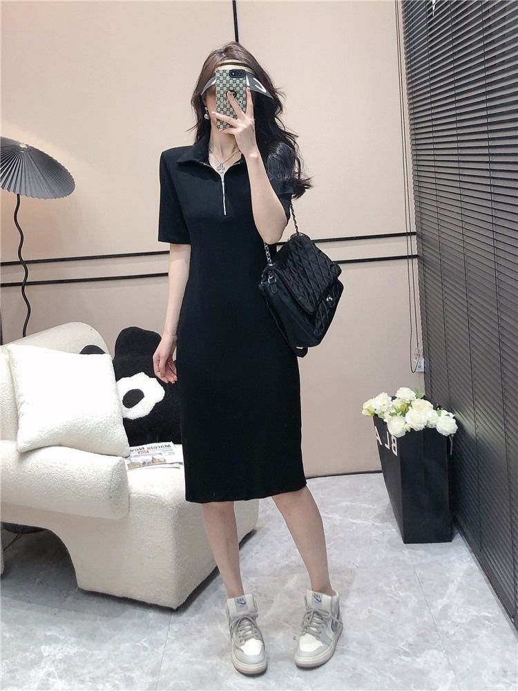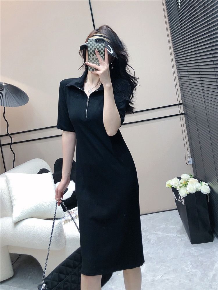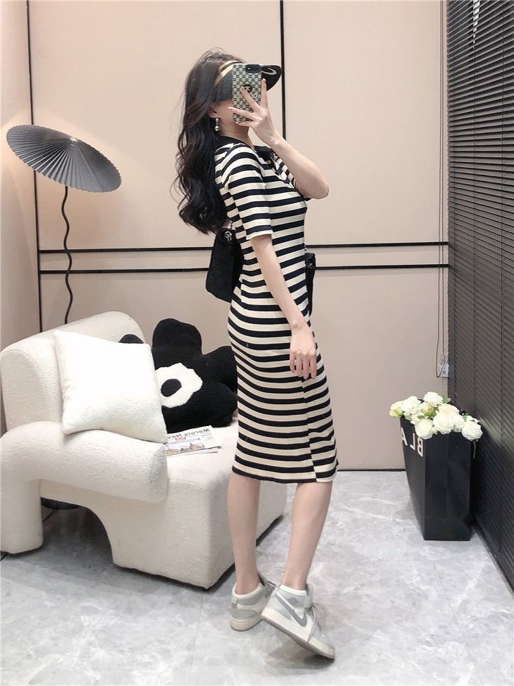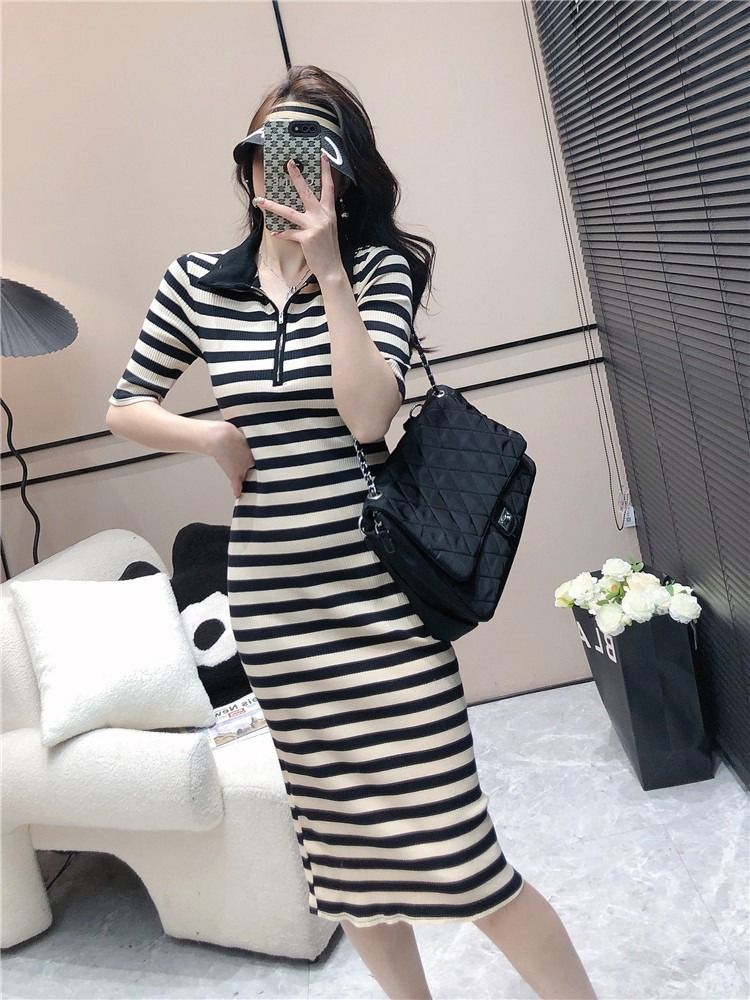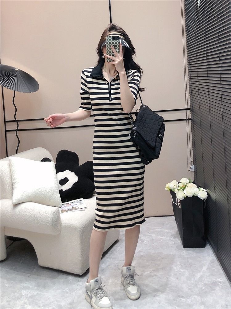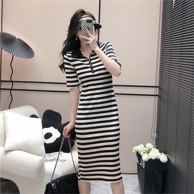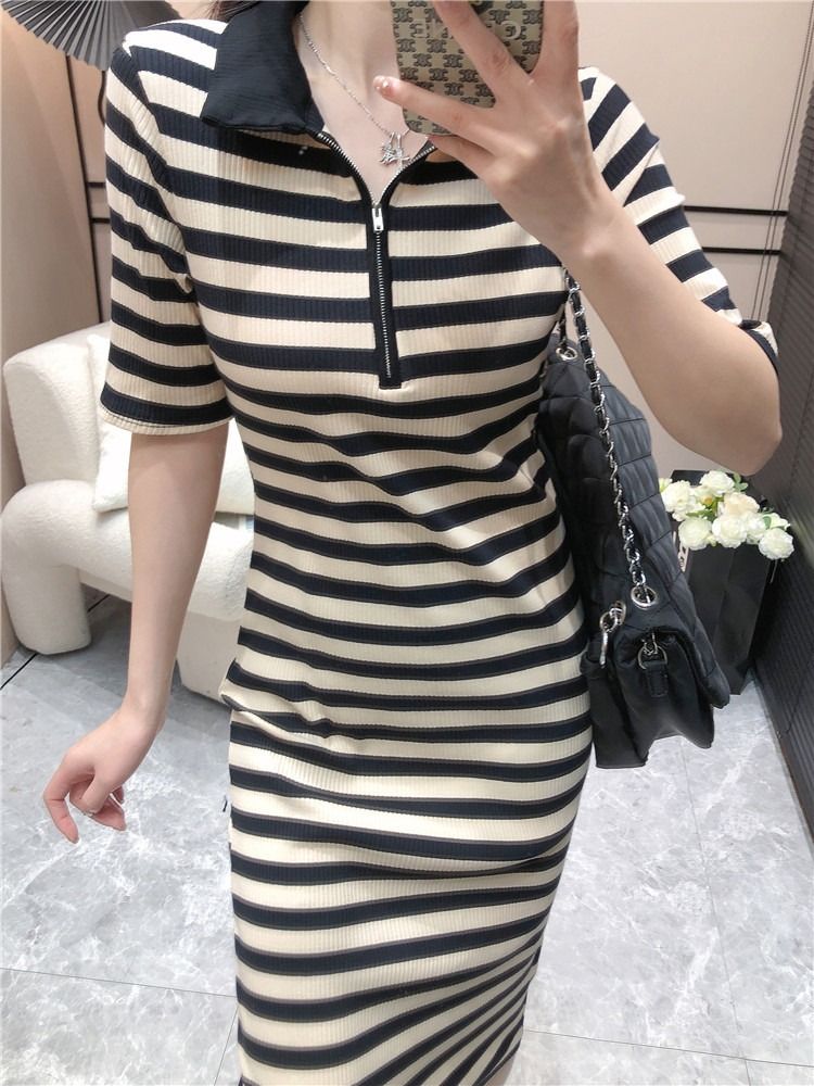 韩版休闲时尚条纹连衣裙女夏季2026年新款拉链短袖港风针织中长裙