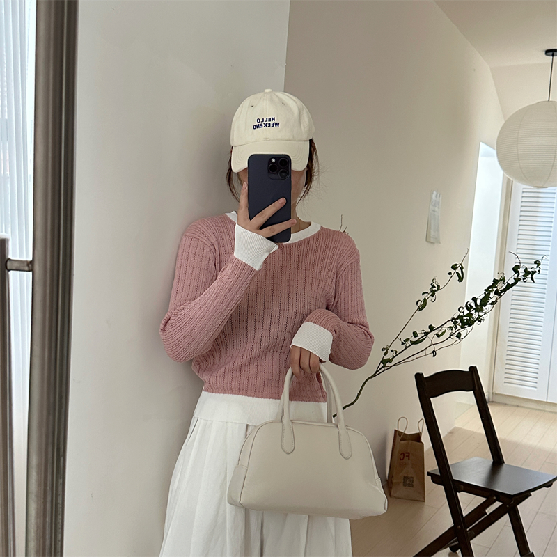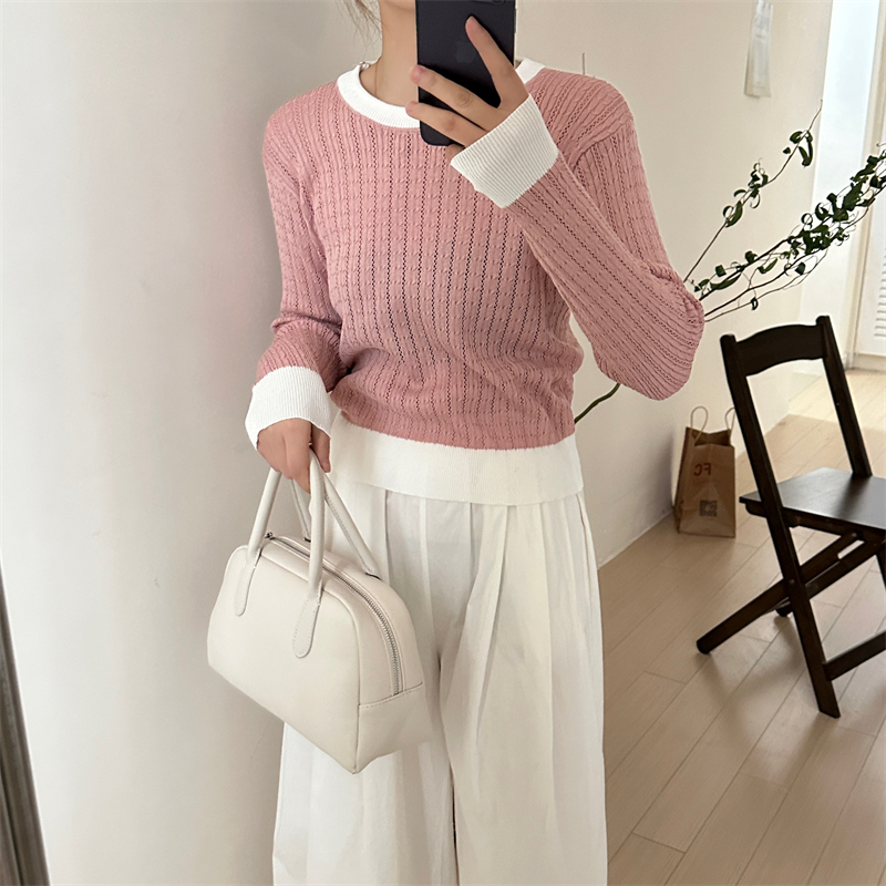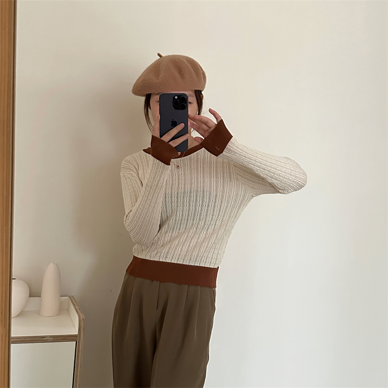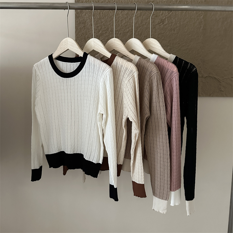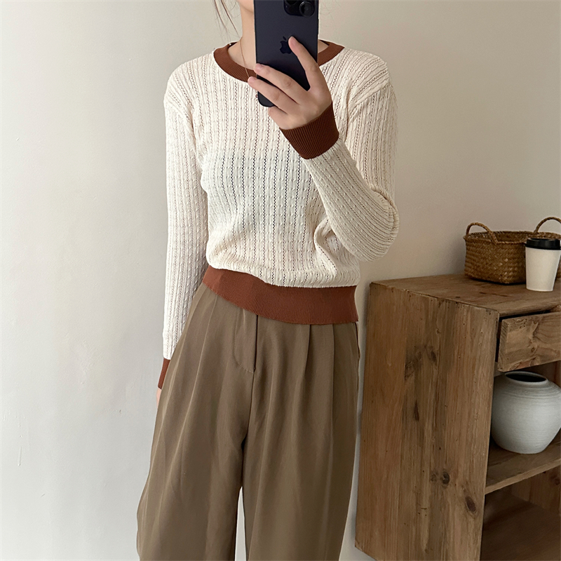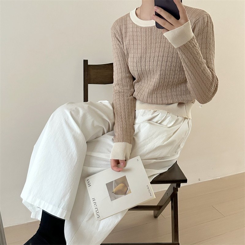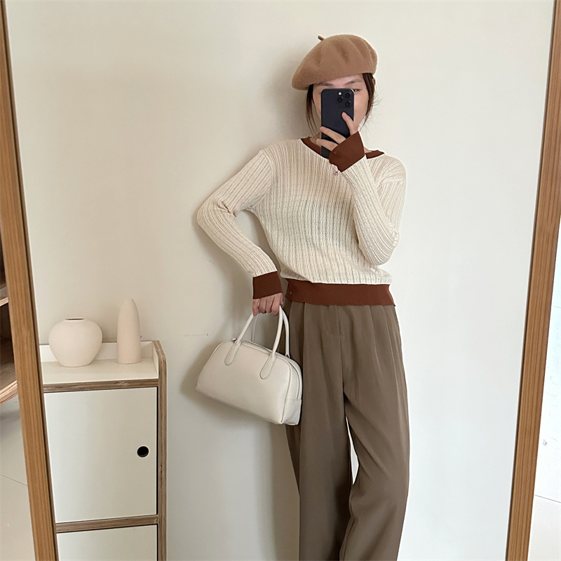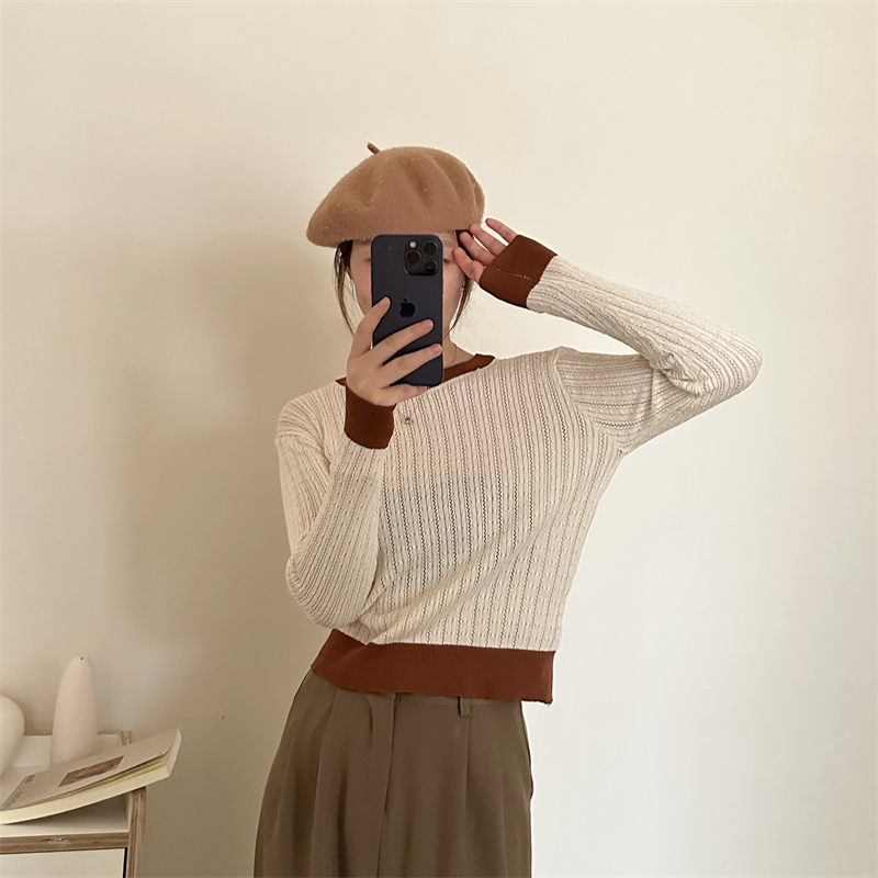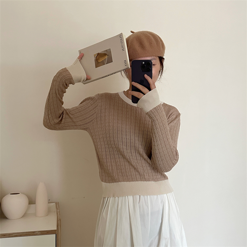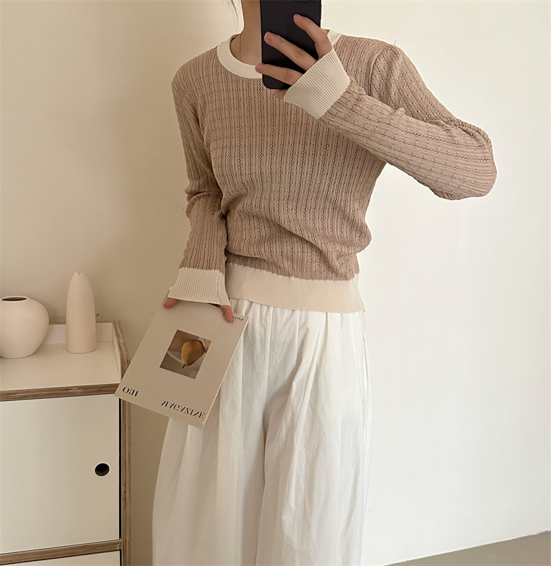 2026년 한국 스타일의 컬러 블록 디자인에 세련된 감각을 더한, 활용도 높은 여성용 니트 긴팔 스웨터의 실제 사진입니다.