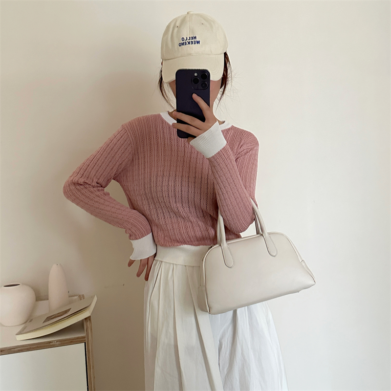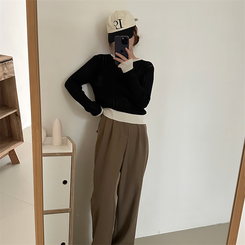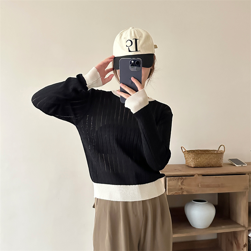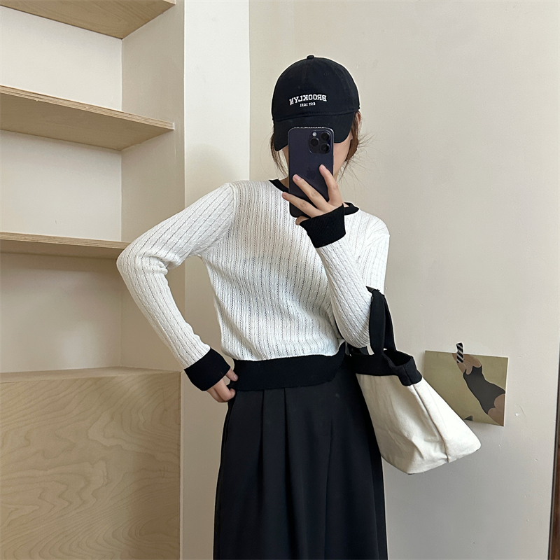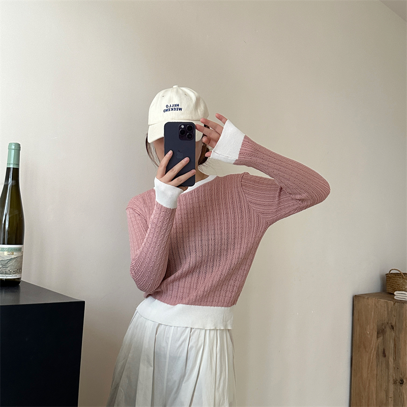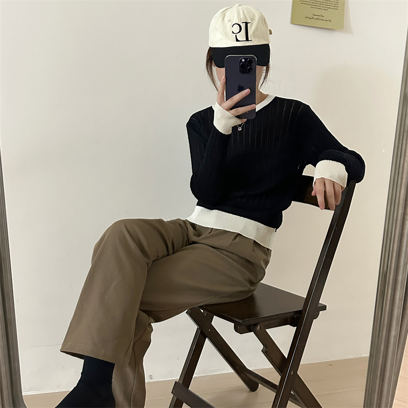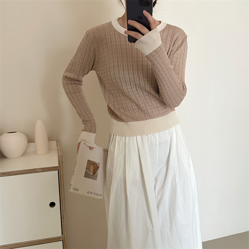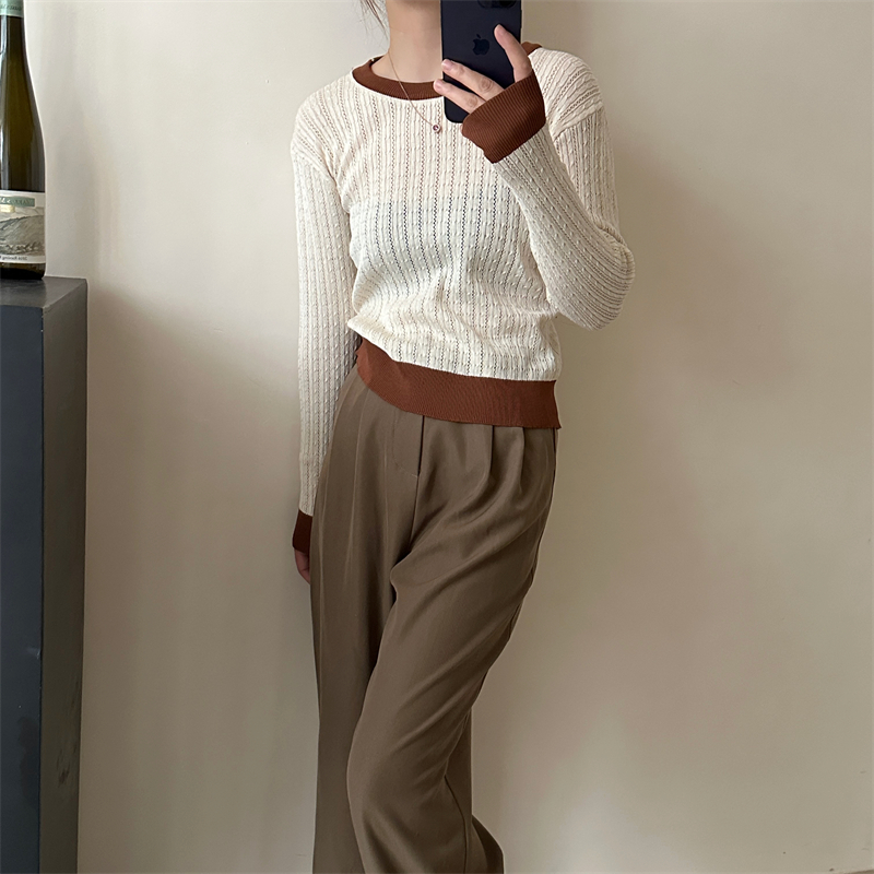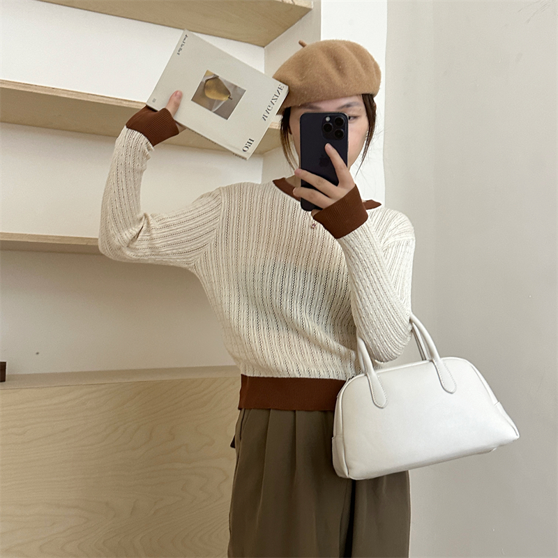 2026년 한국 스타일의 컬러 블록 디자인에 세련된 감각을 더한, 활용도 높은 여성용 니트 긴팔 스웨터의 실제 사진입니다.