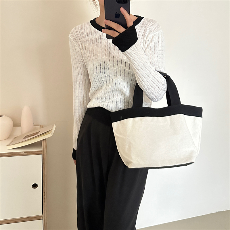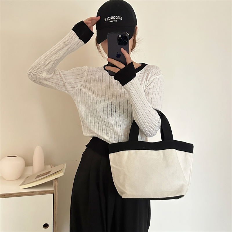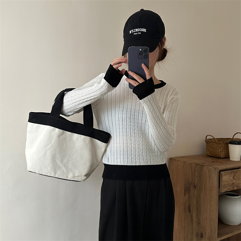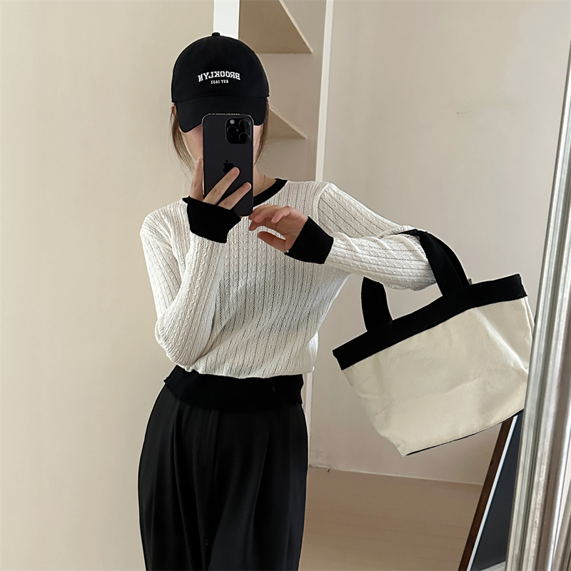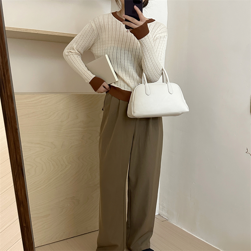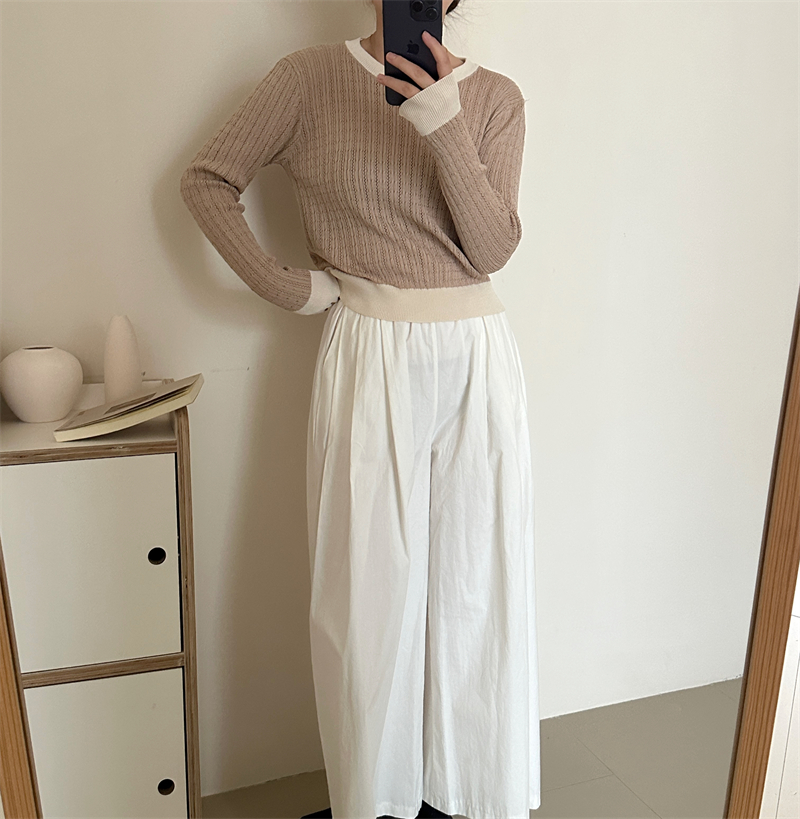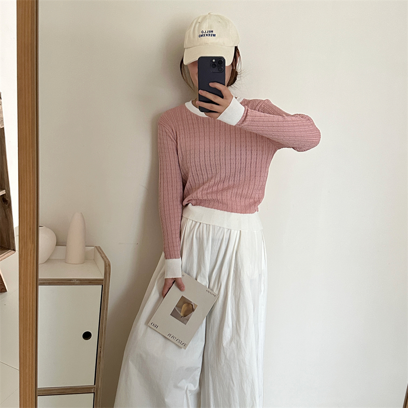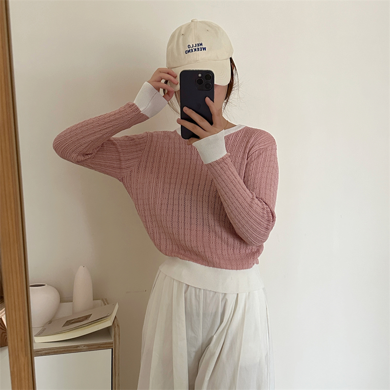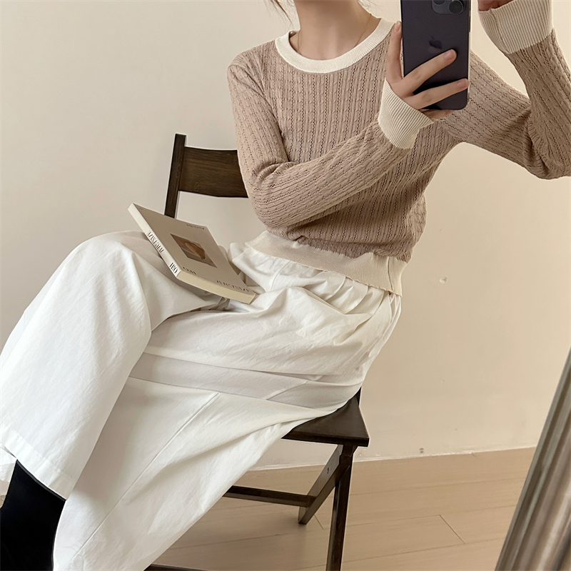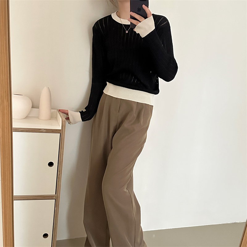2026년 한국 스타일의 컬러 블록 디자인에 세련된 감각을 더한, 활용도 높은 여성용 니트 긴팔 스웨터의 실제 사진입니다.