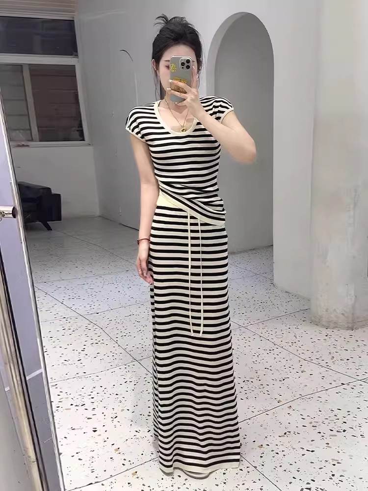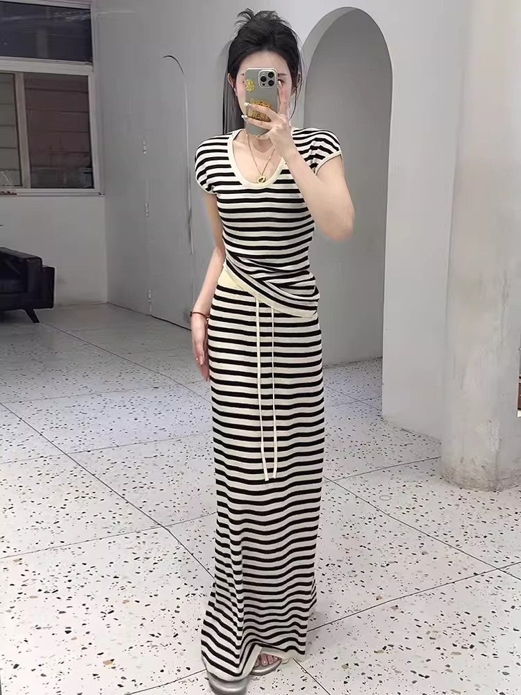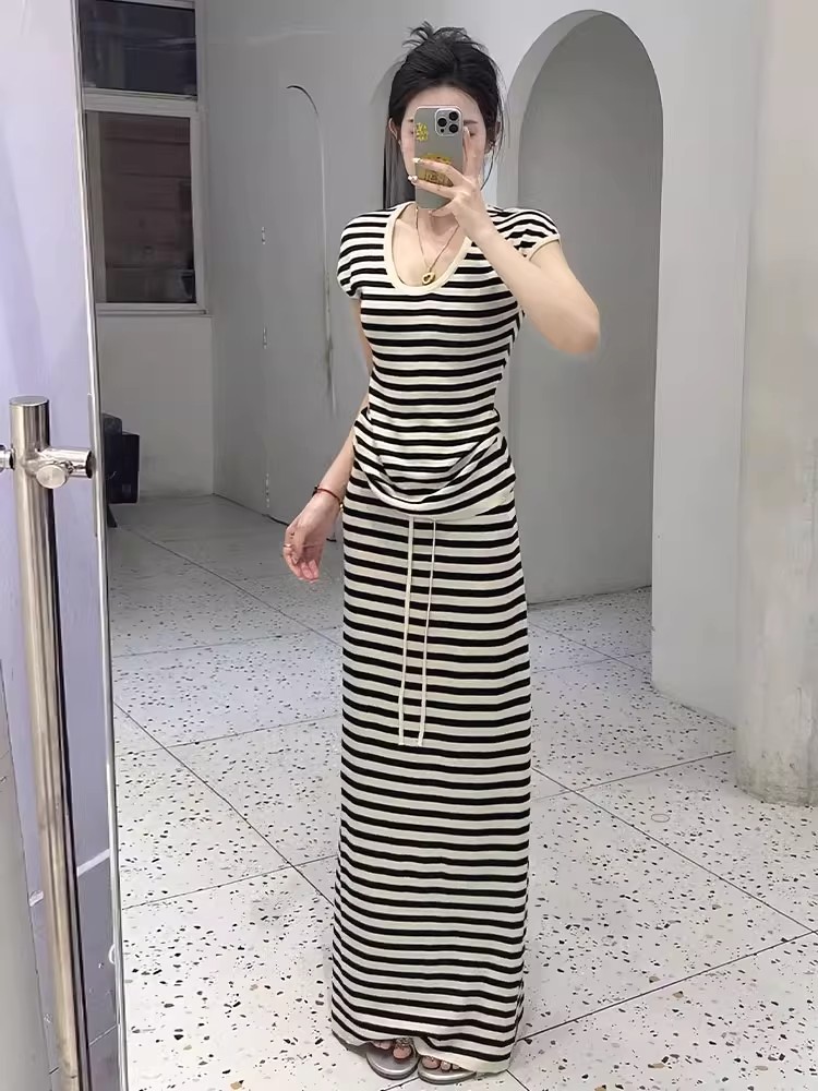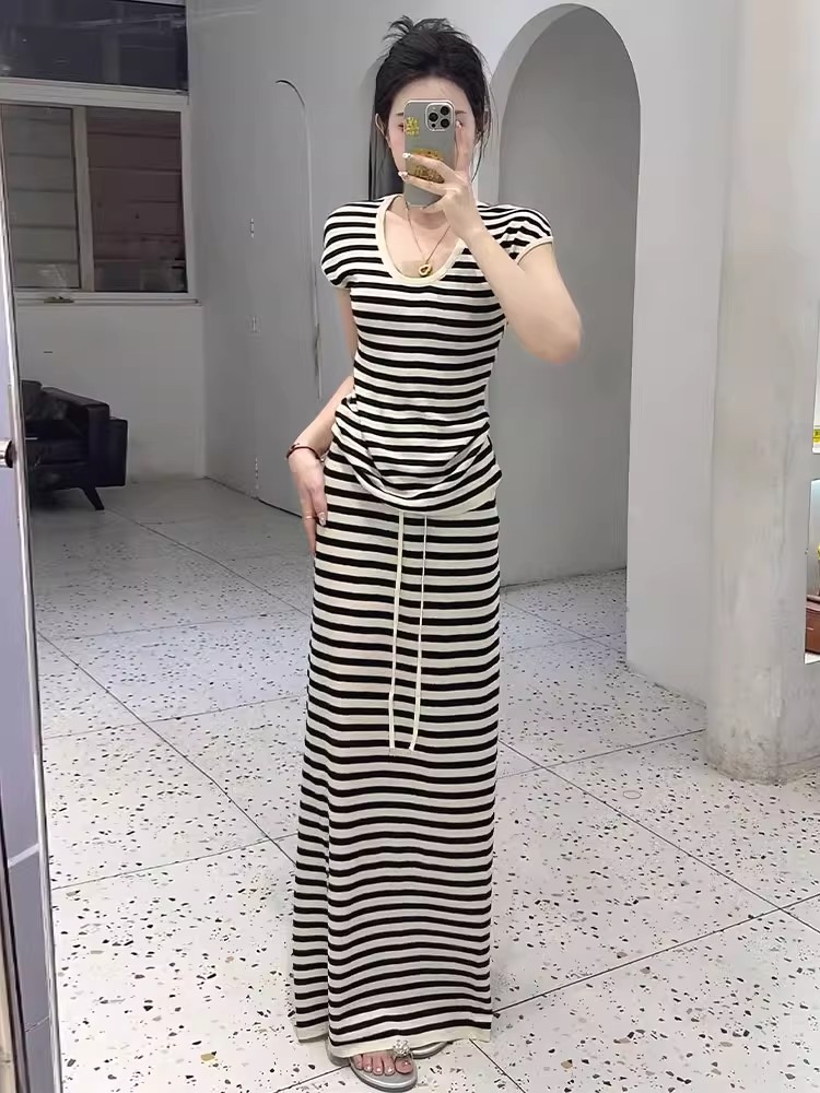 法式休闲简约慵懒风条纹U领短袖针织T恤女夏季高腰直筒半身裙套装