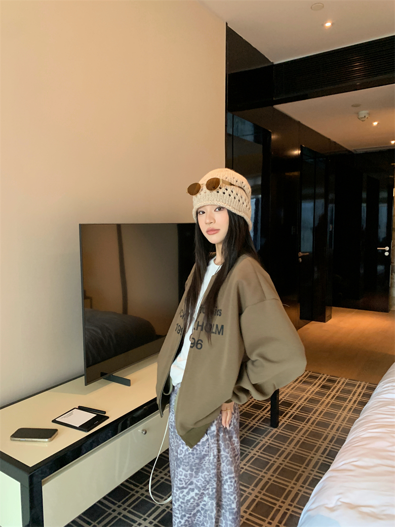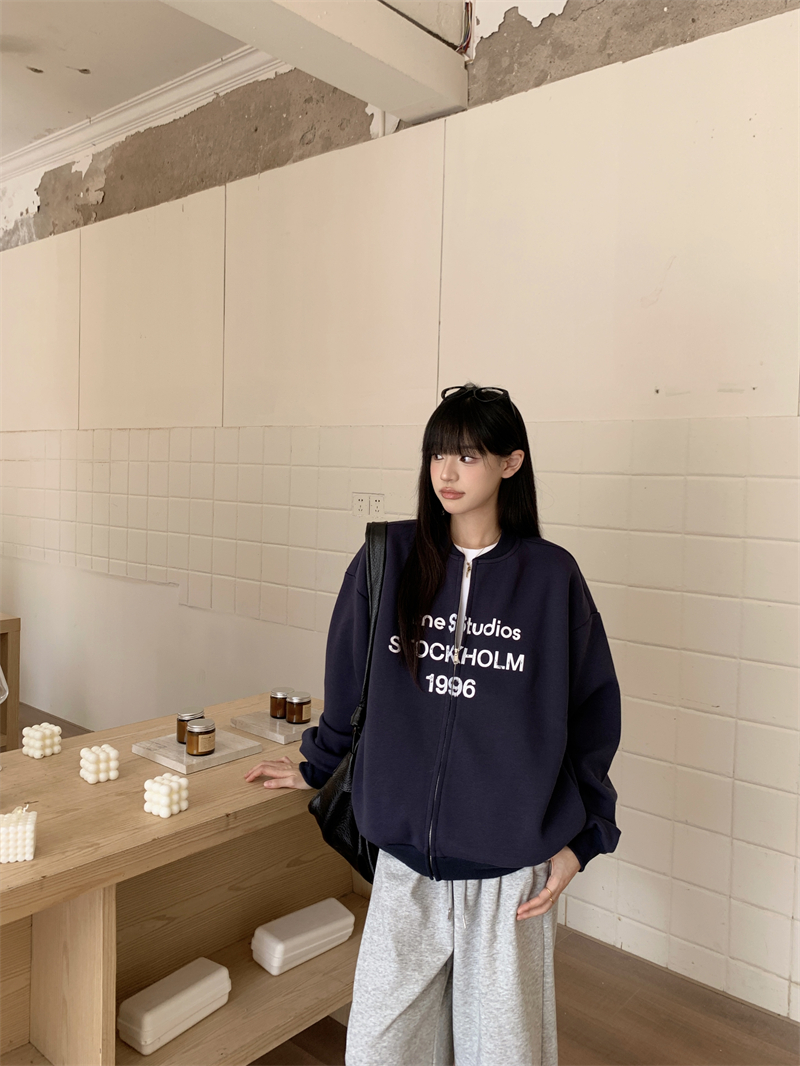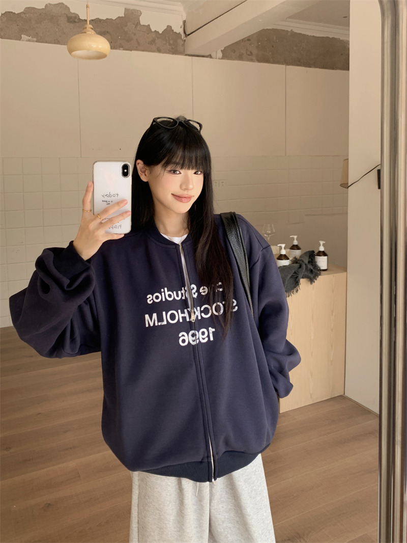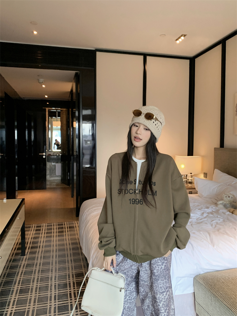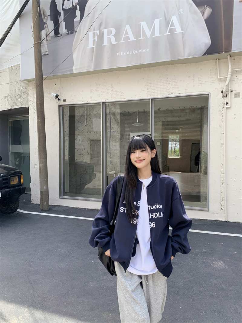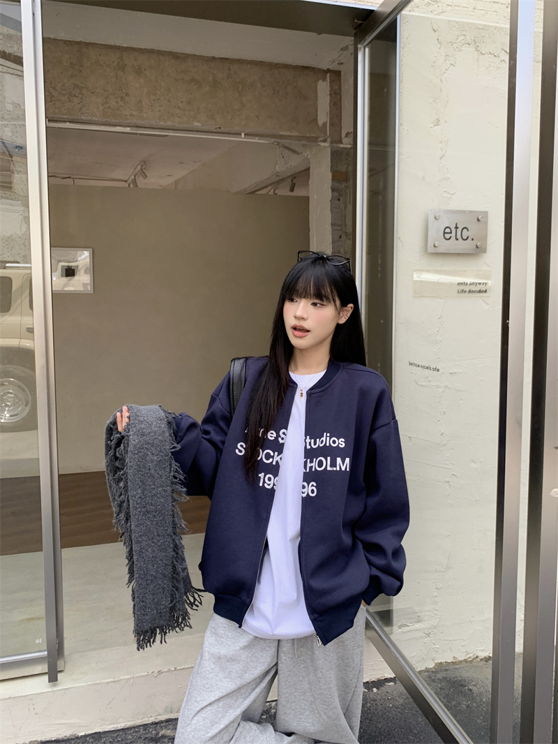 现实拍实价字母印花圆领宽松长袖外套女早秋美式宽松休闲开衫上衣