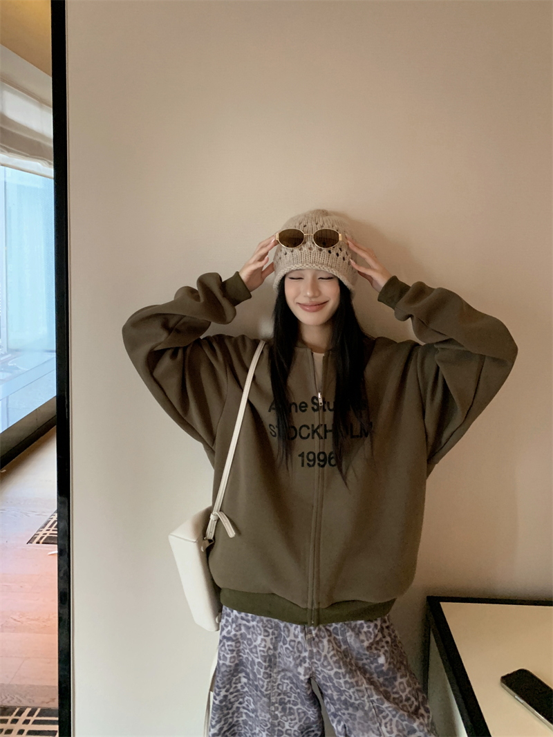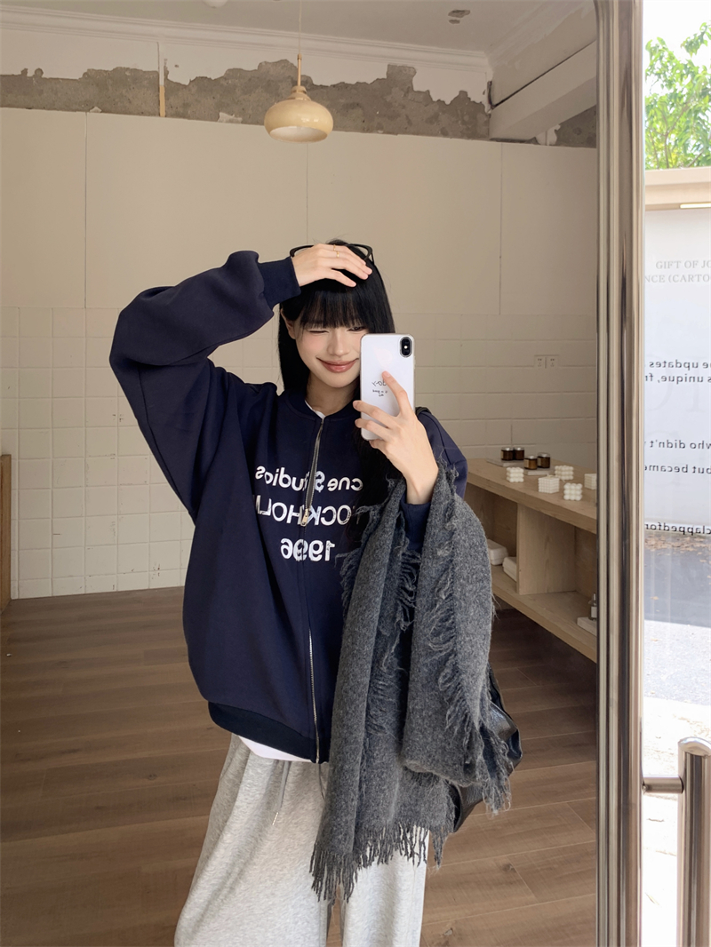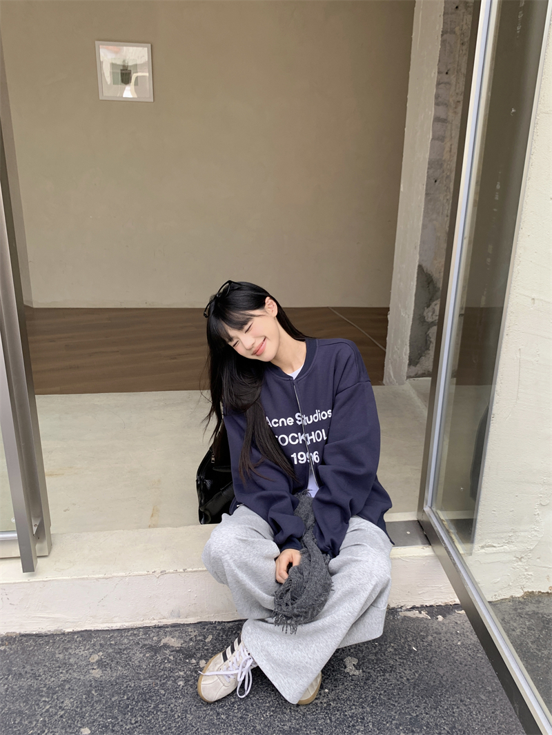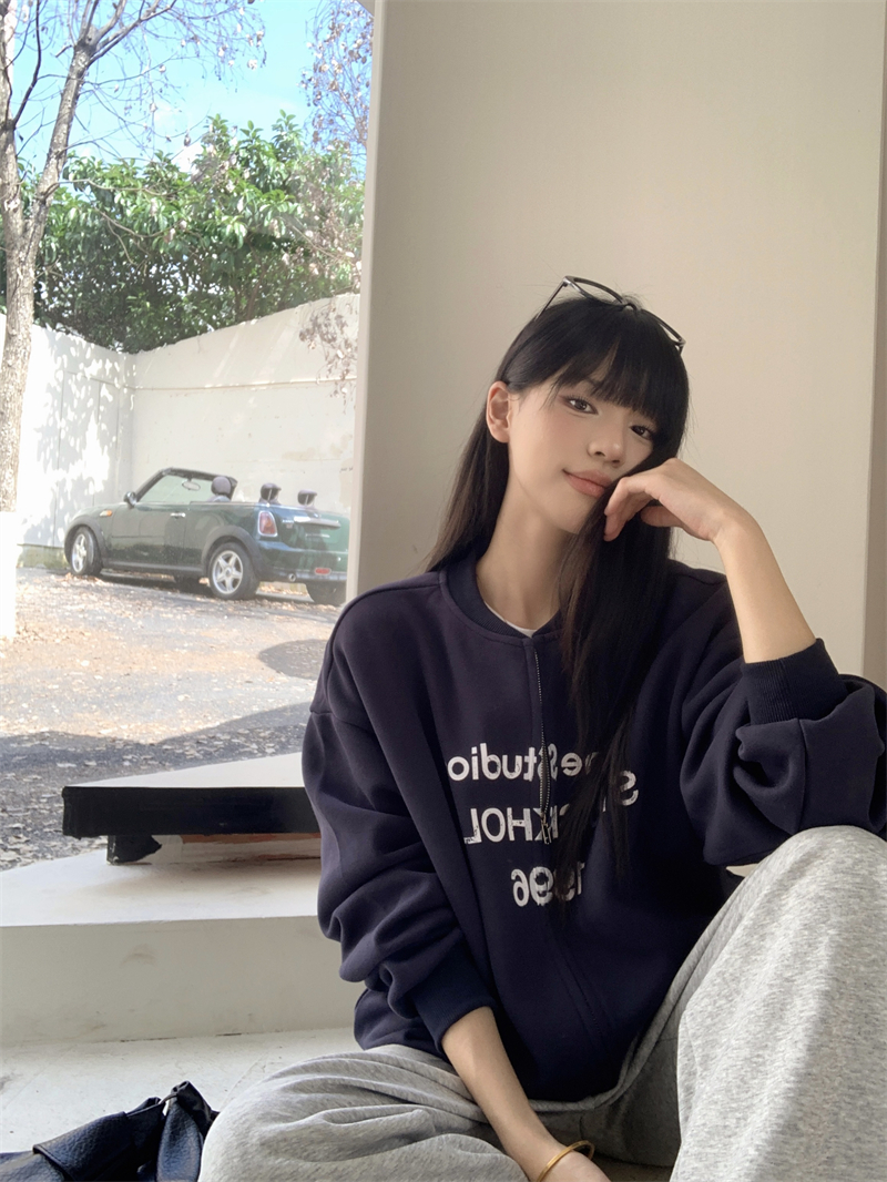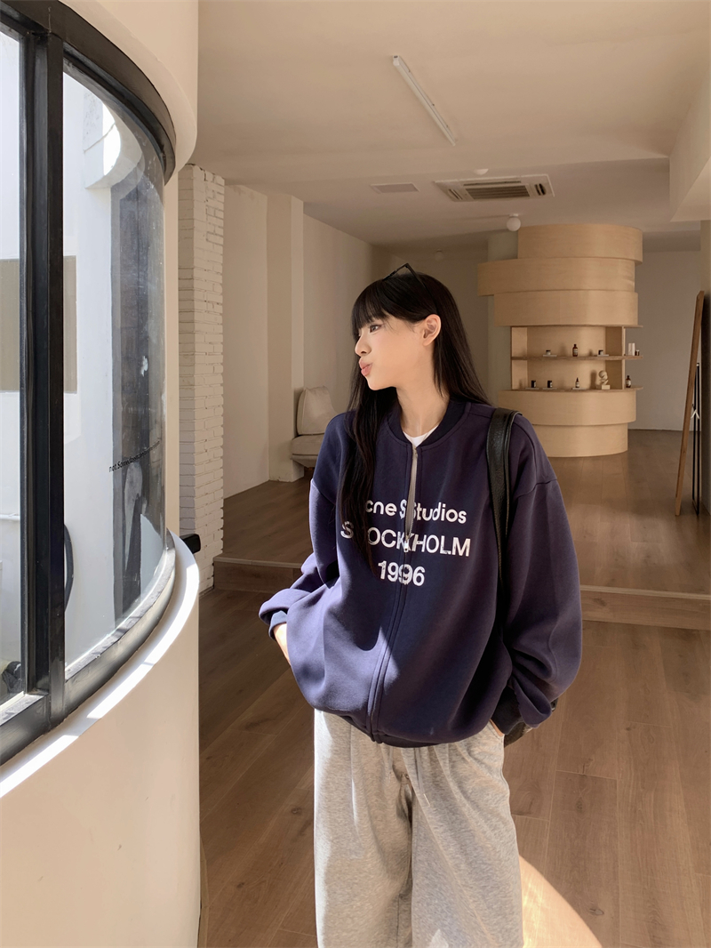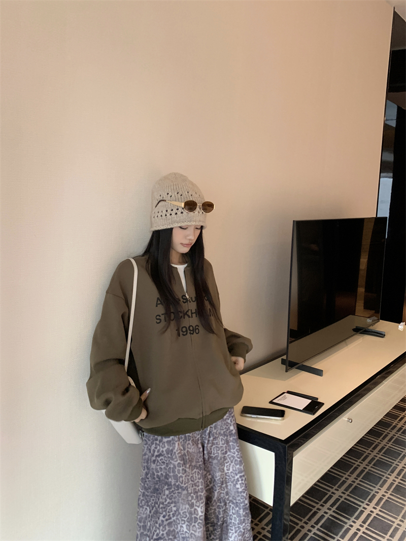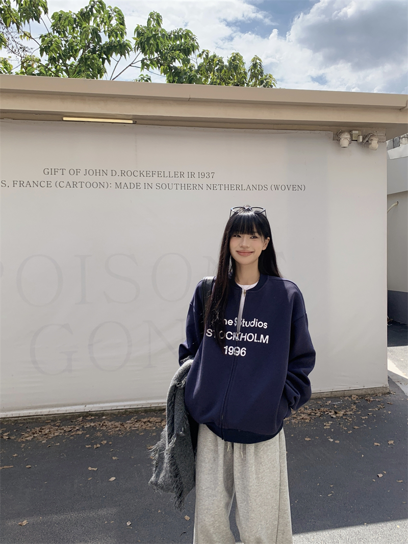 现实拍实价字母印花圆领宽松长袖外套女早秋美式宽松休闲开衫上衣