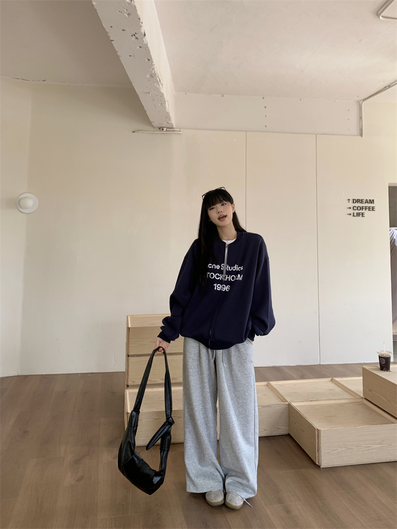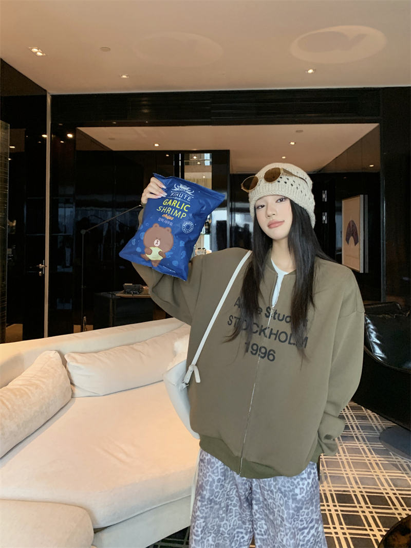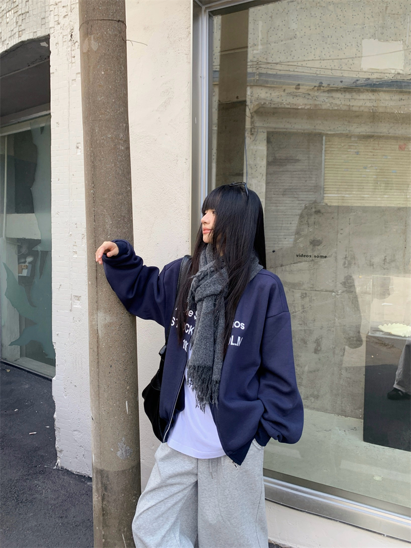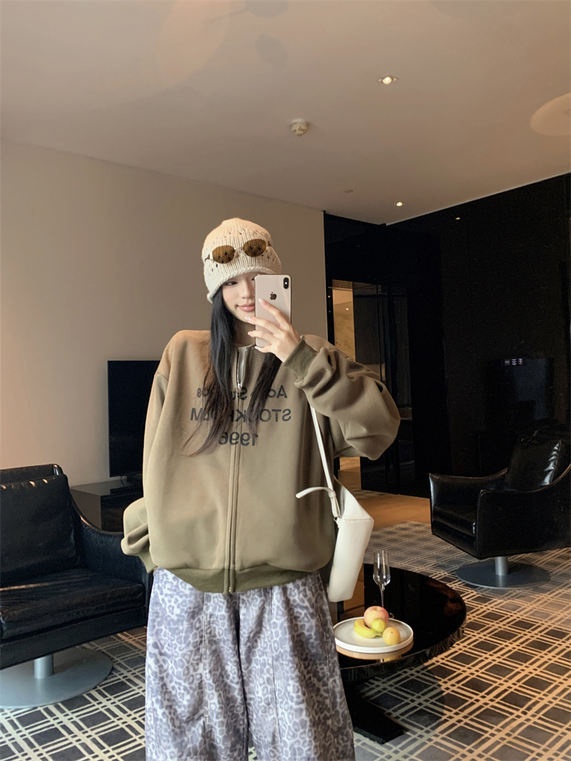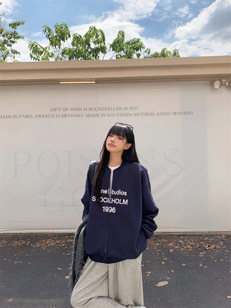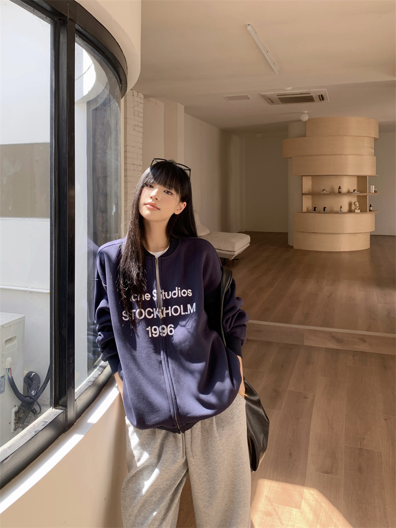 现实拍实价字母印花圆领宽松长袖外套女早秋美式宽松休闲开衫上衣