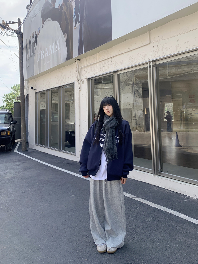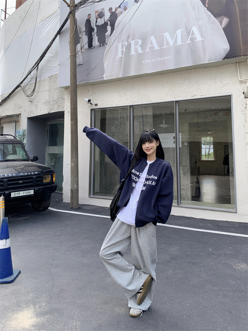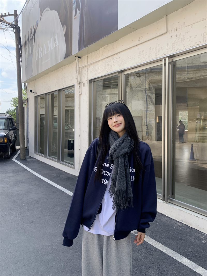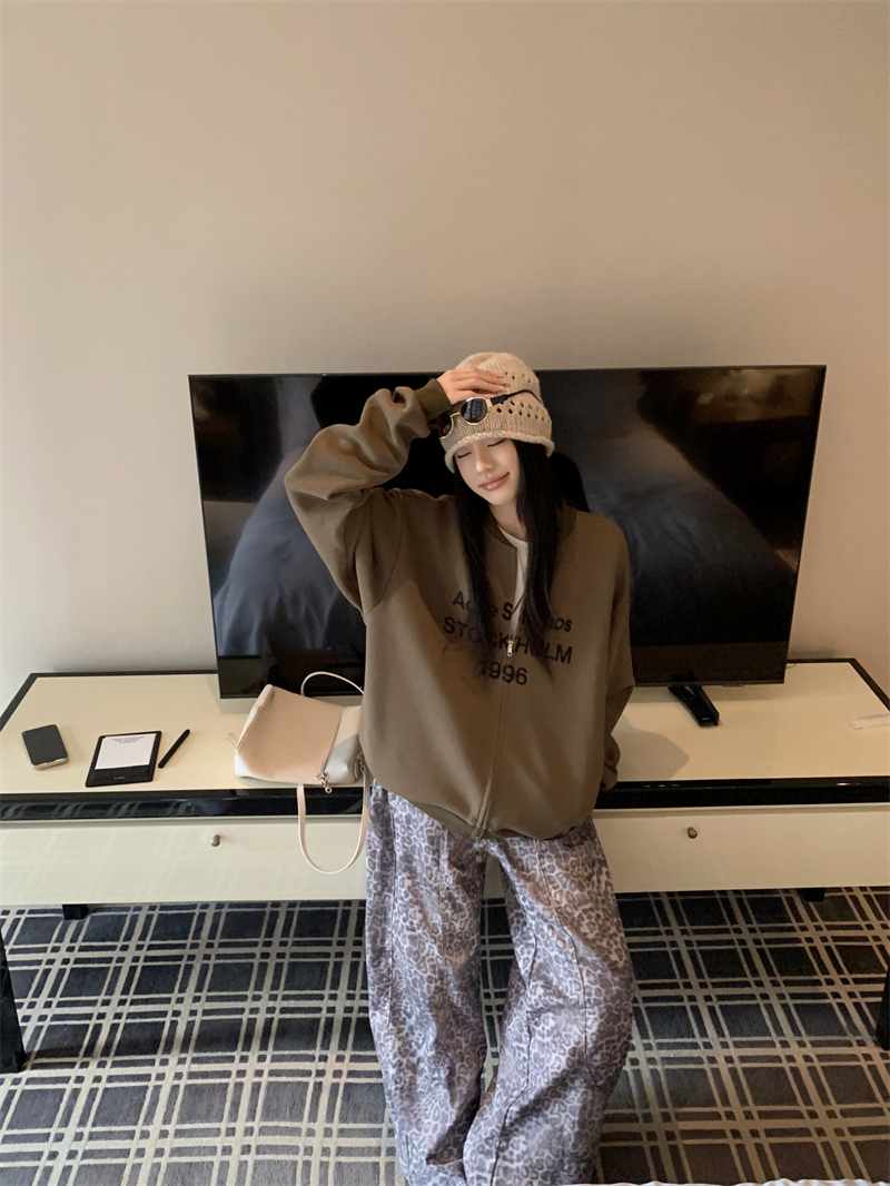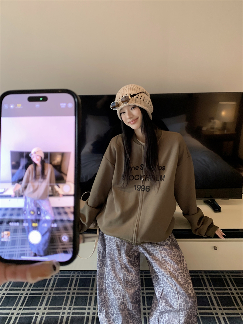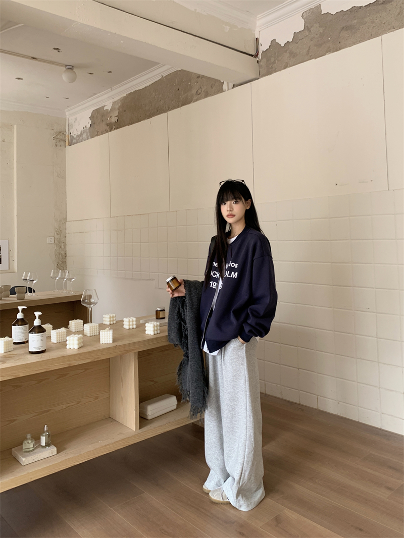 现实拍实价字母印花圆领宽松长袖外套女早秋美式宽松休闲开衫上衣