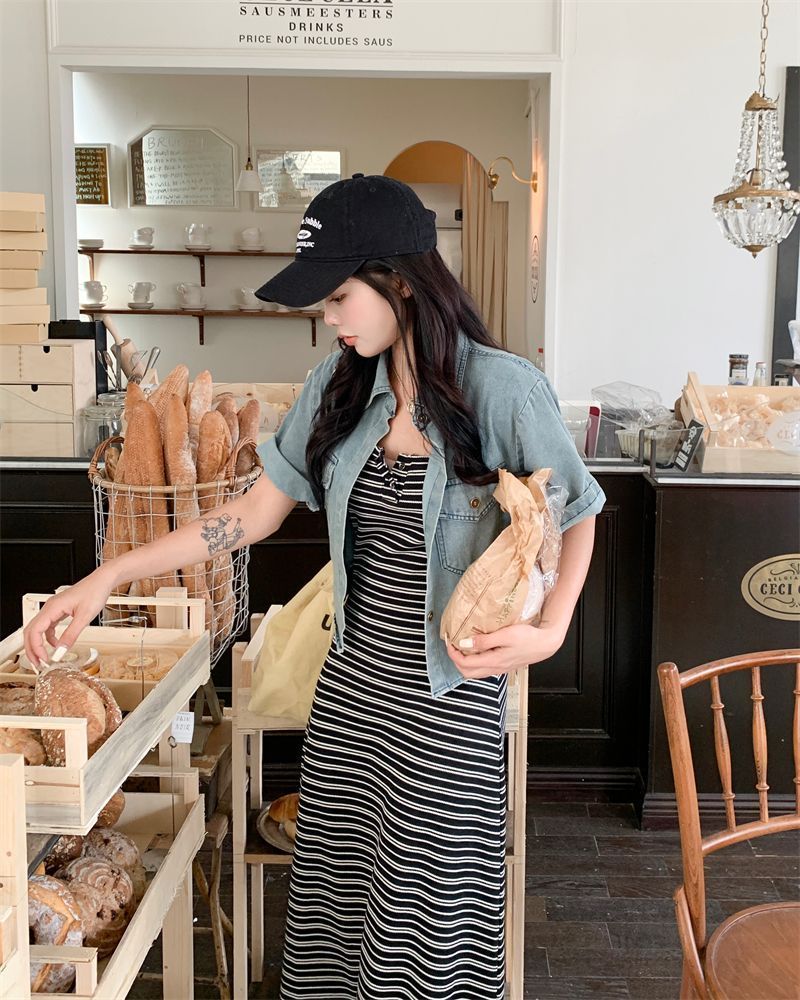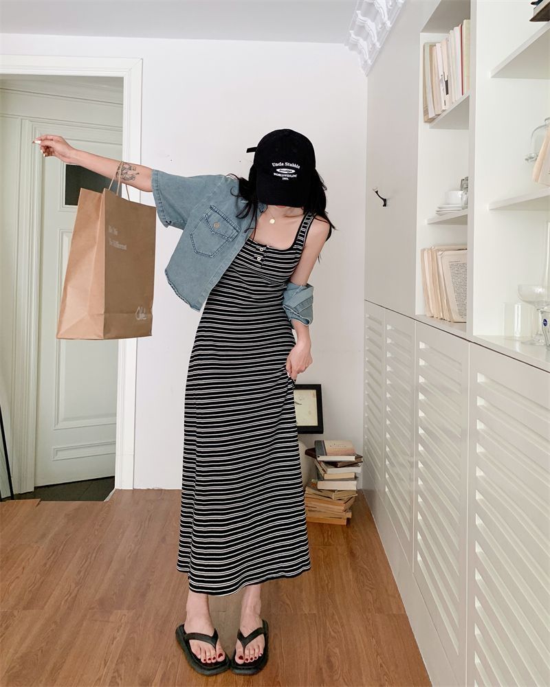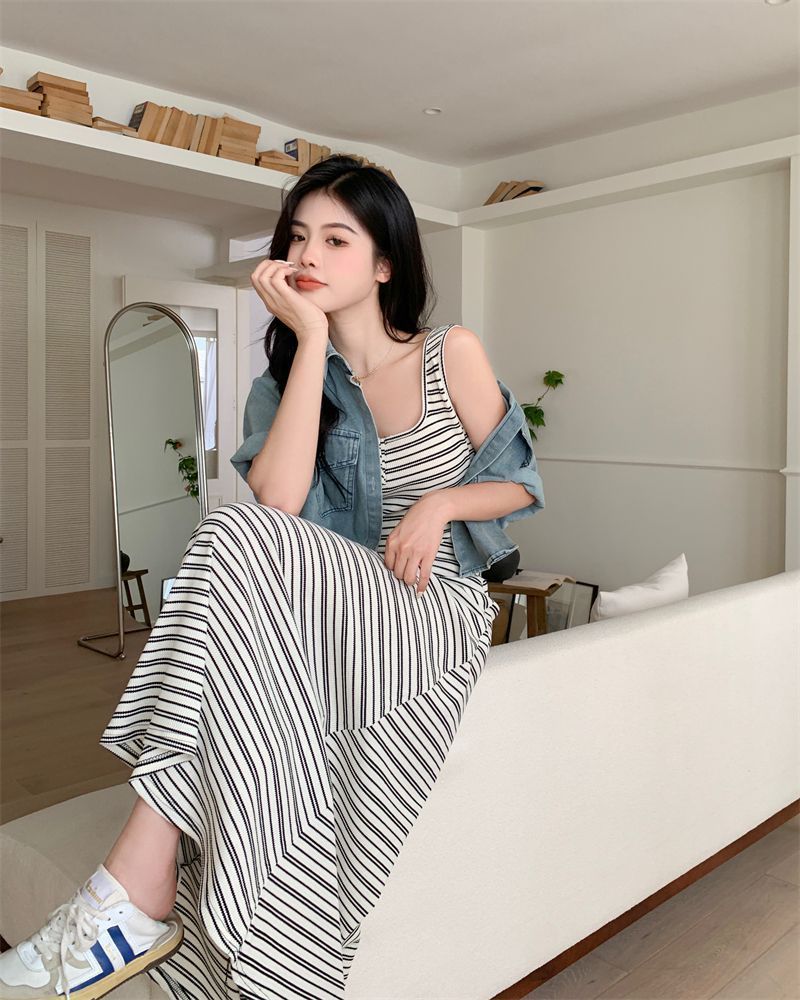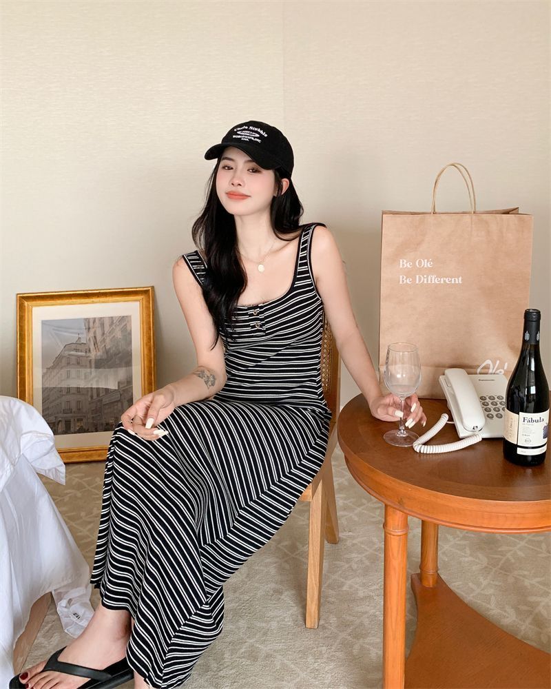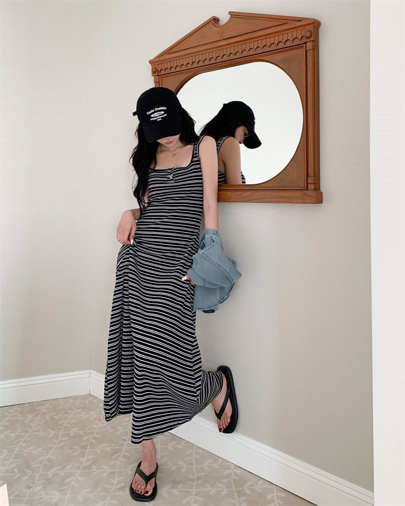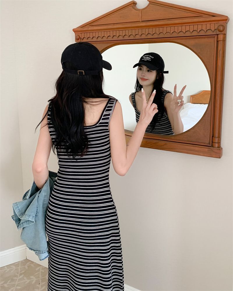 2026新款韩系条纹针织背心连衣裙女夏显瘦休闲百搭中长款吊带裙子