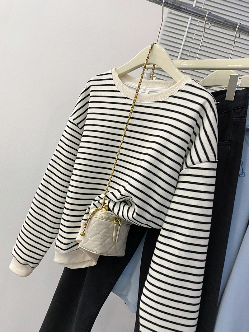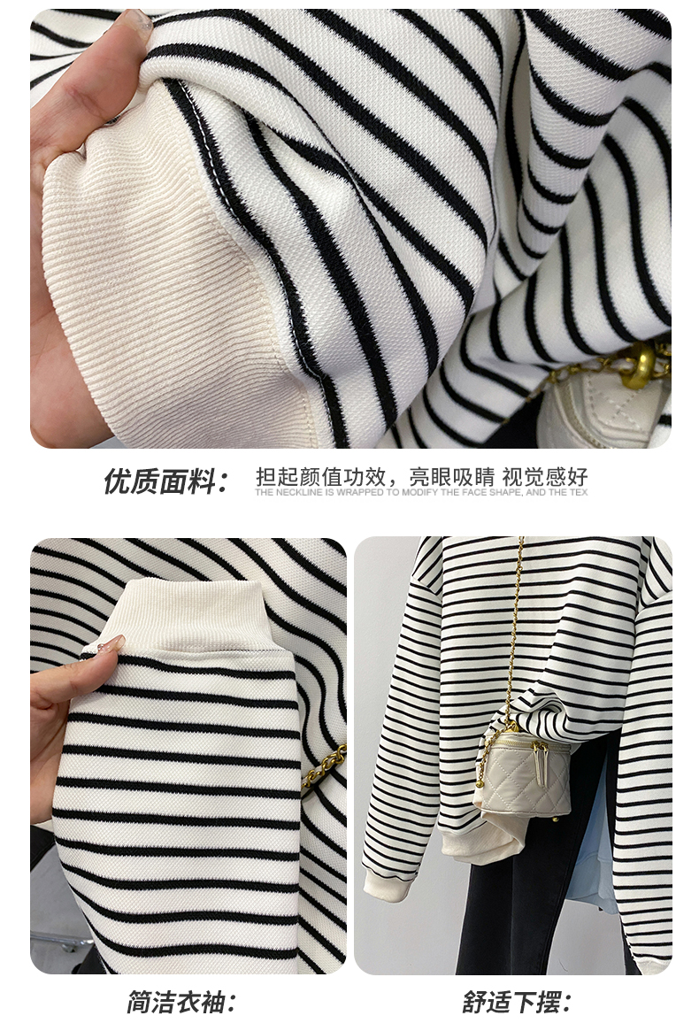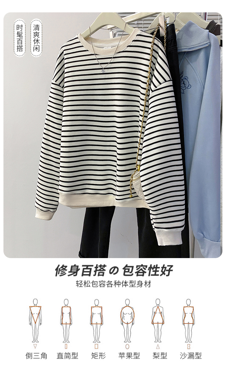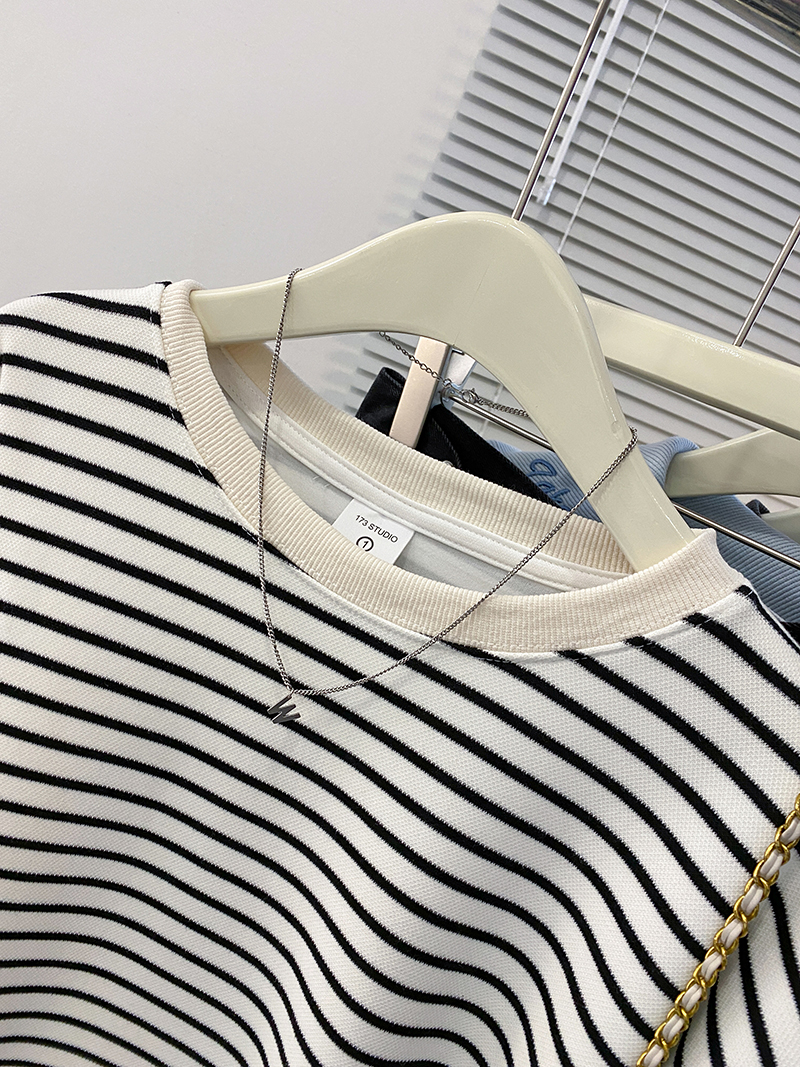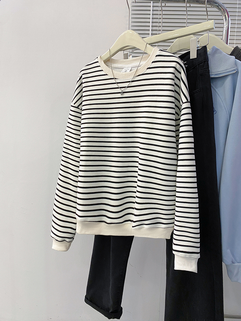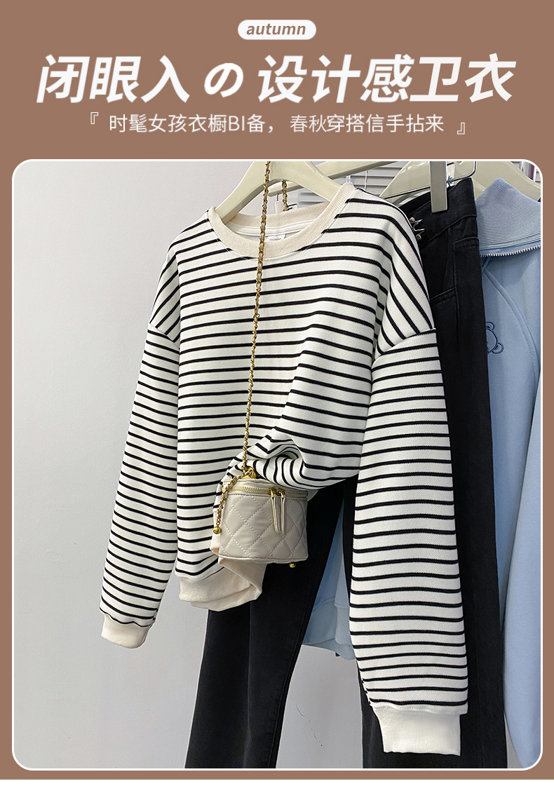 实拍珠地复合330克卫衣女2026春秋条纹潮新款薄款圆领长袖t恤上衣