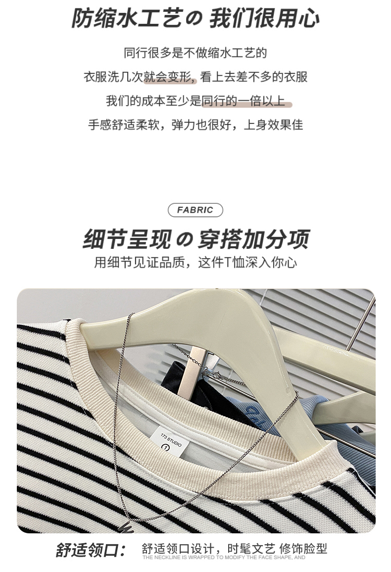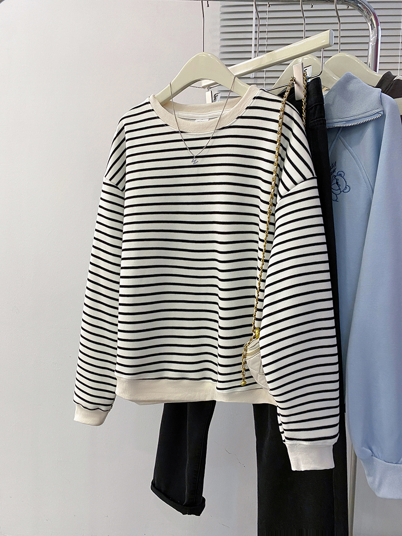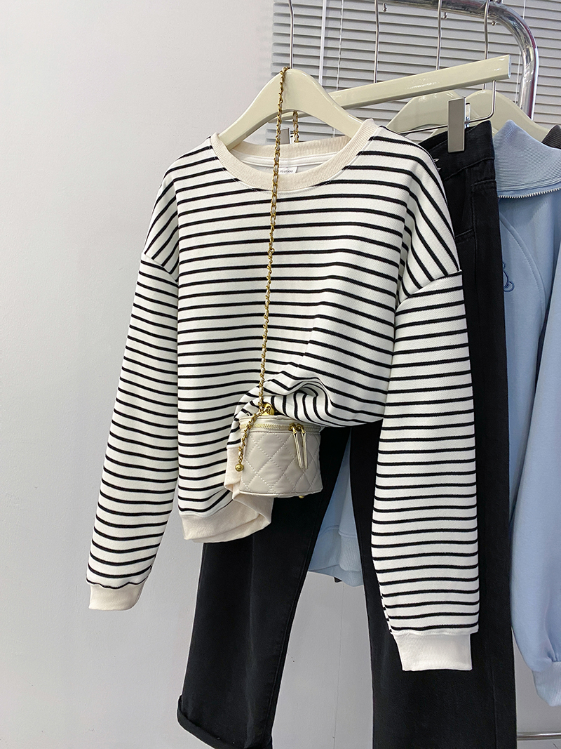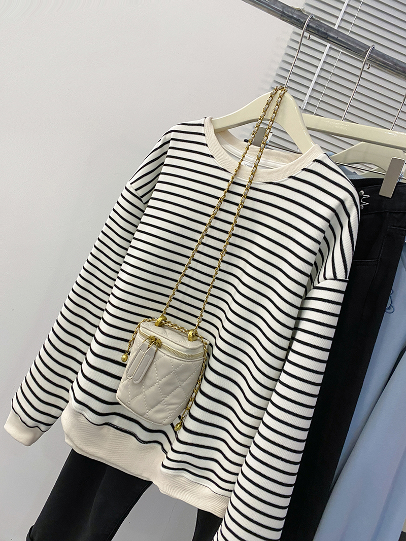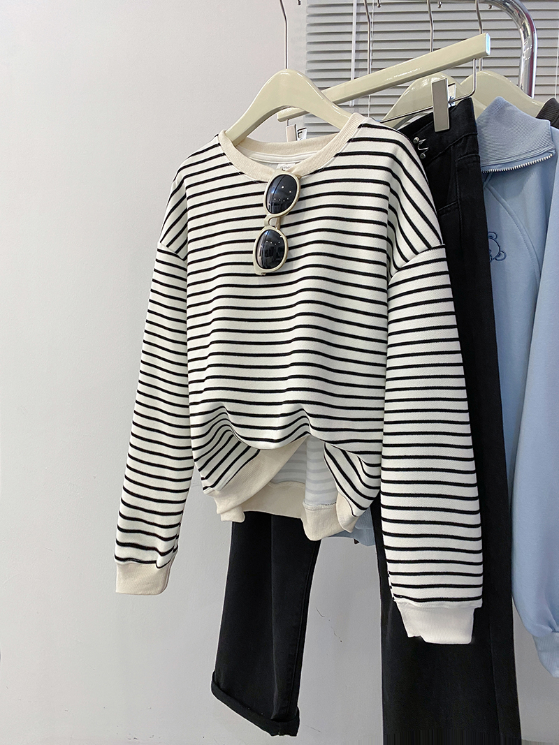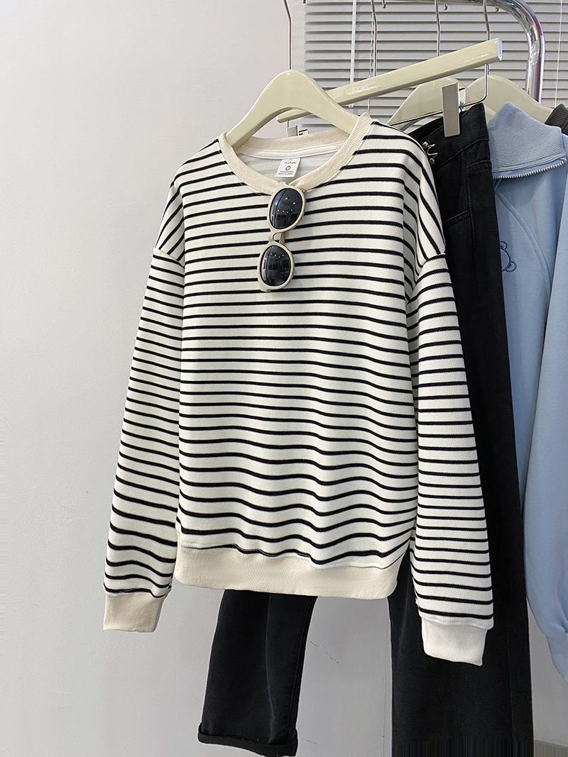 实拍珠地复合330克卫衣女2026春秋条纹潮新款薄款圆领长袖t恤上衣