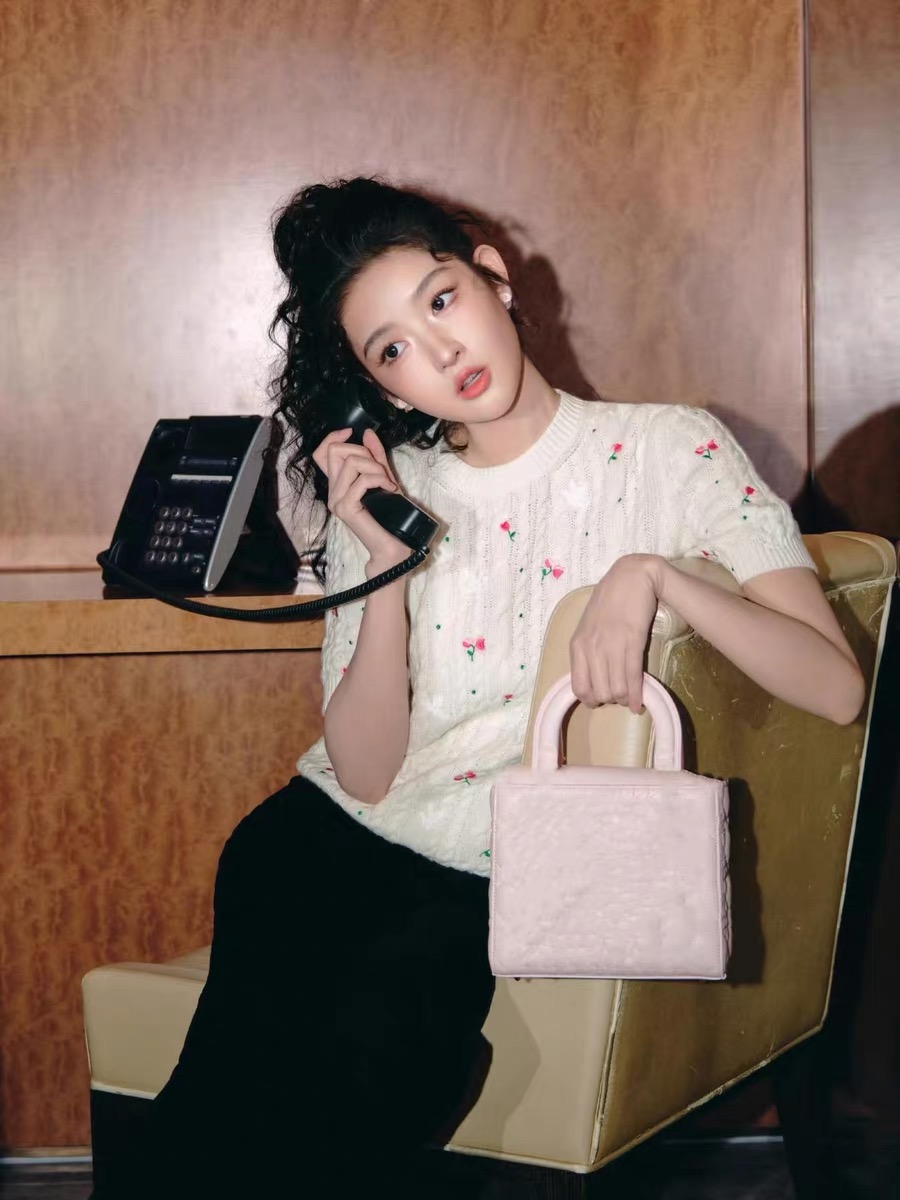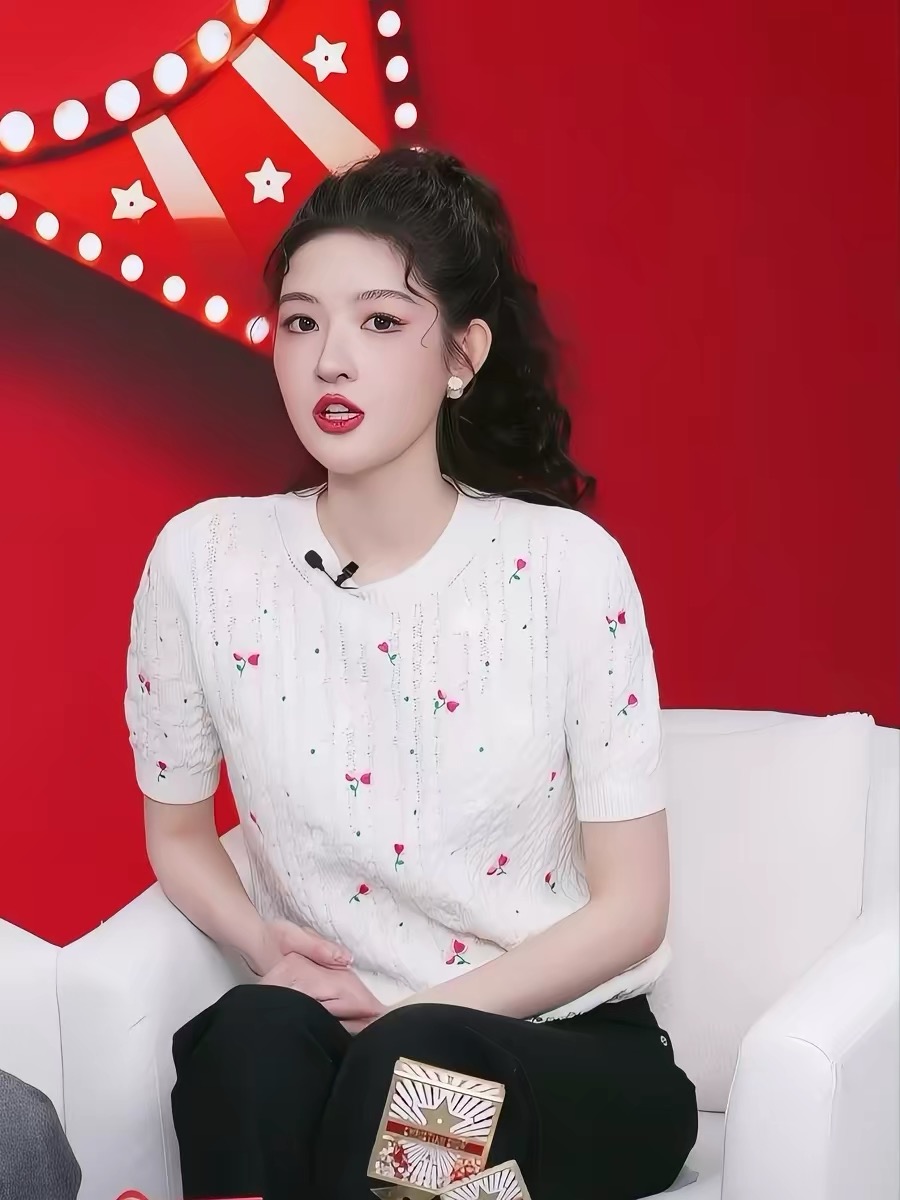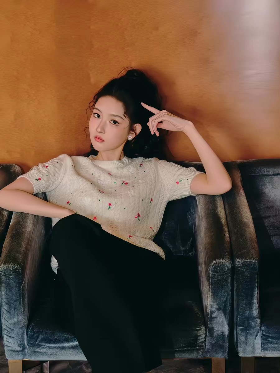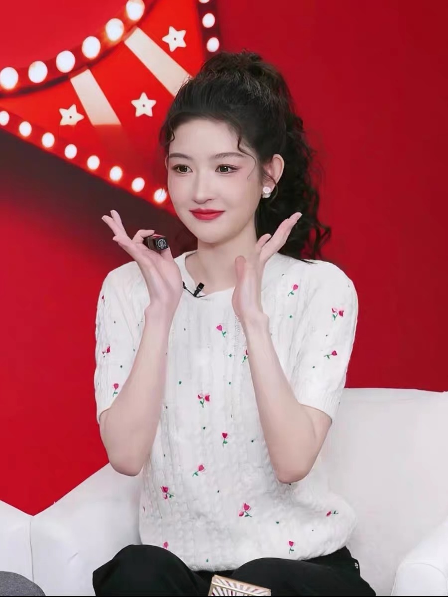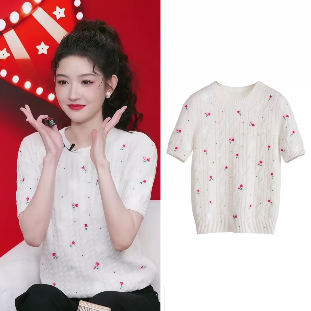王玉雯同款米白色花朵刺绣短袖针织衫女2026早春新款法式圆领毛衣