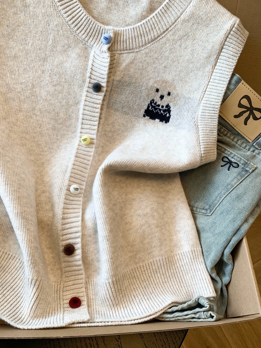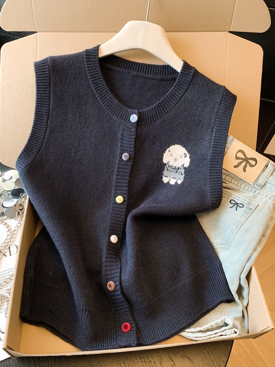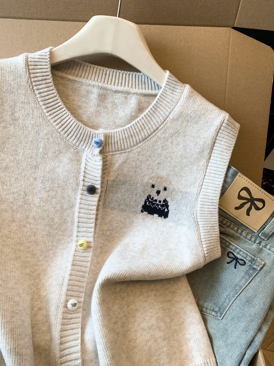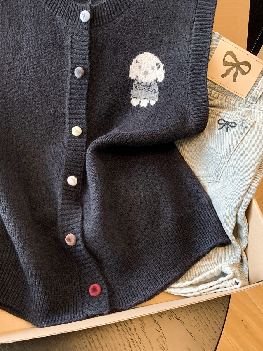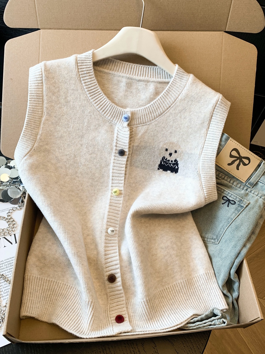 实拍复古圆领刺绣针织开衫马甲女2026春季彩扣设计感叠穿背心上衣