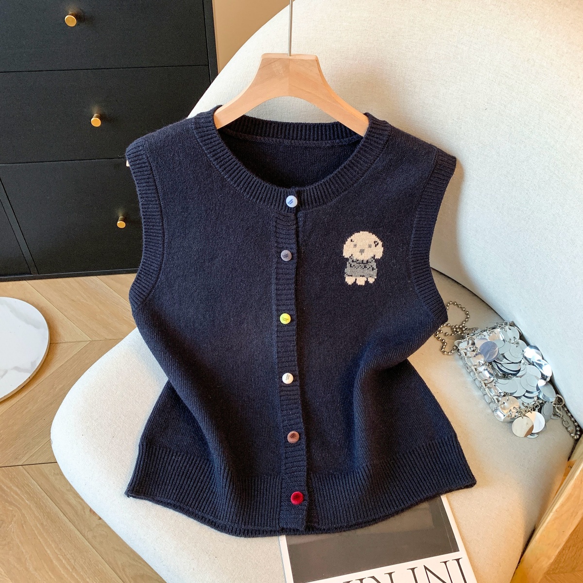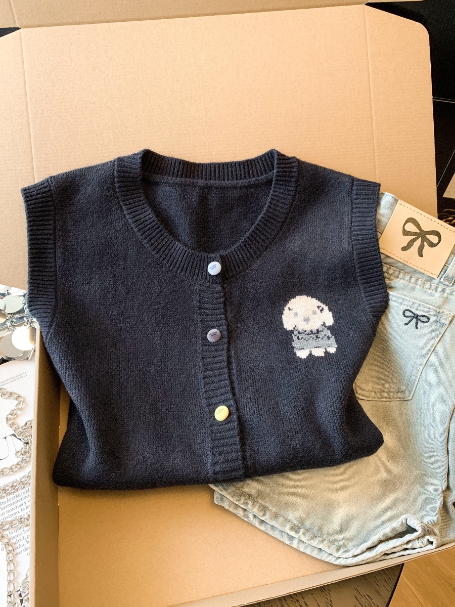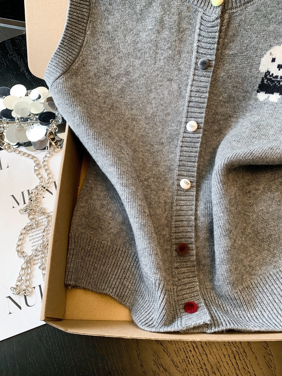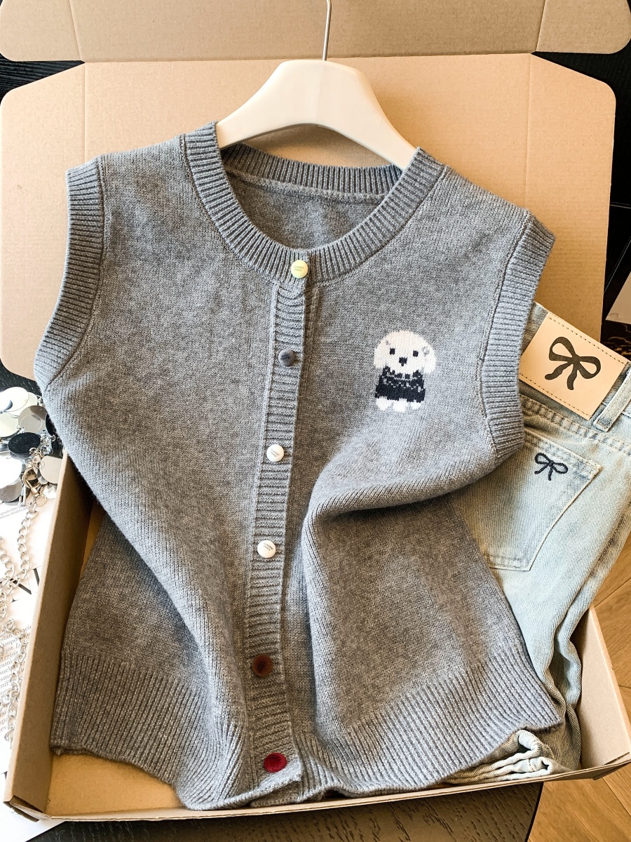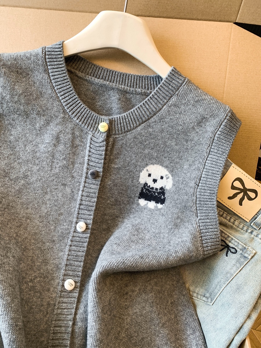 实拍复古圆领刺绣针织开衫马甲女2026春季彩扣设计感叠穿背心上衣