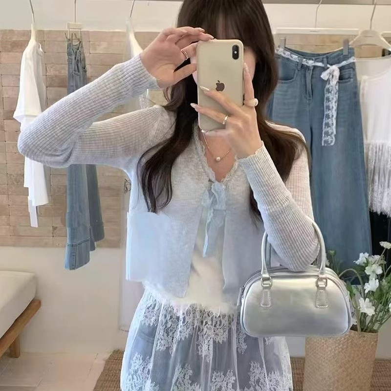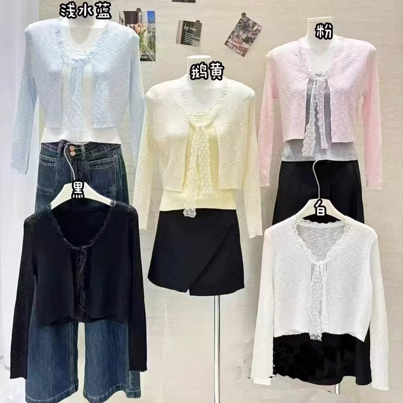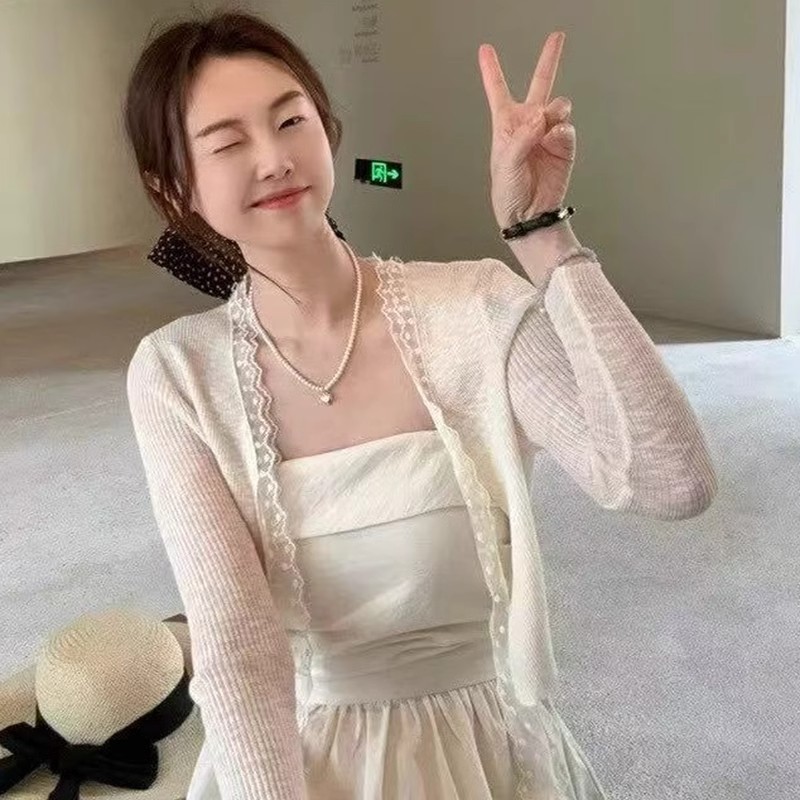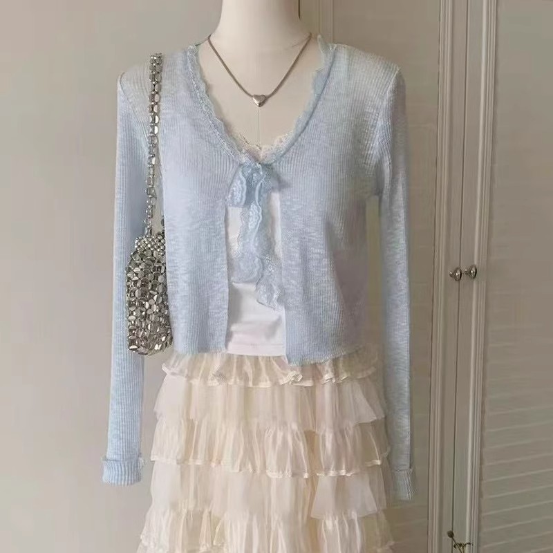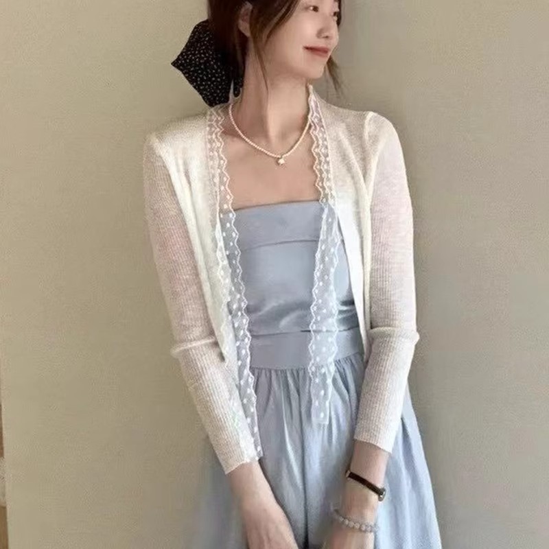 蕾丝拼接系带冰丝针织开衫女春季法式披肩外搭防晒罩衫配裙子上衣