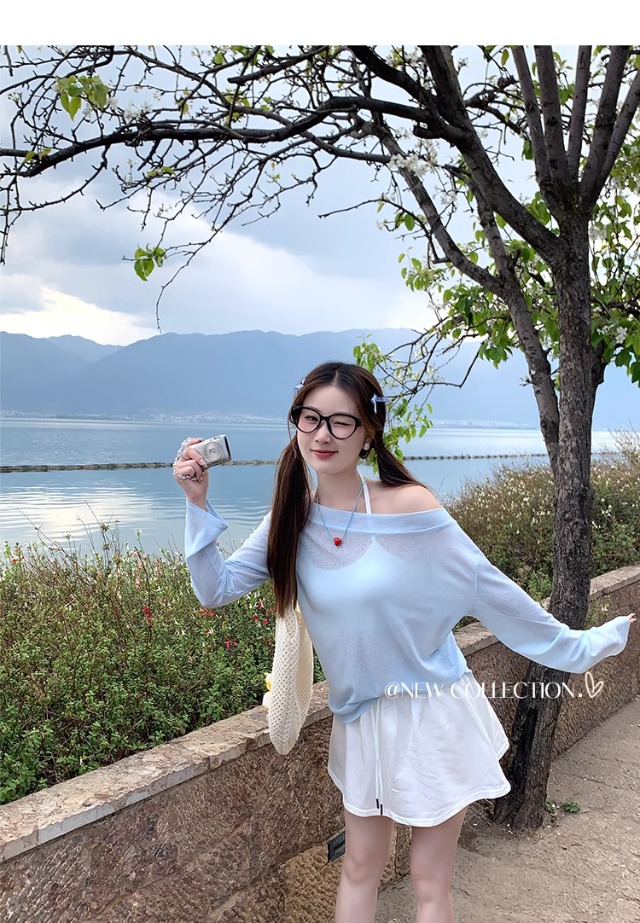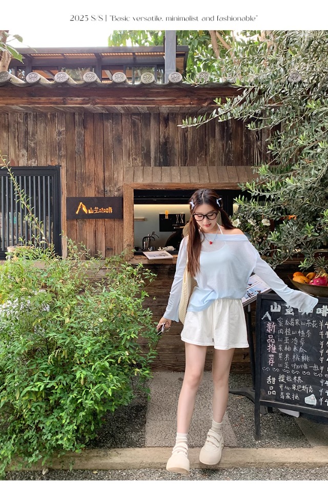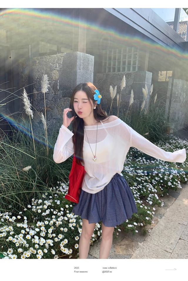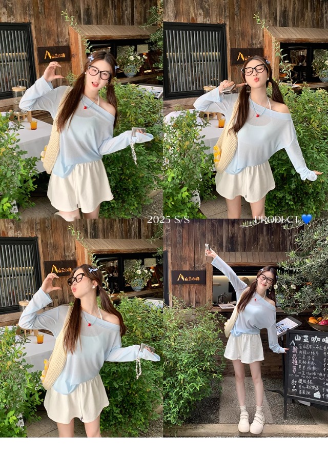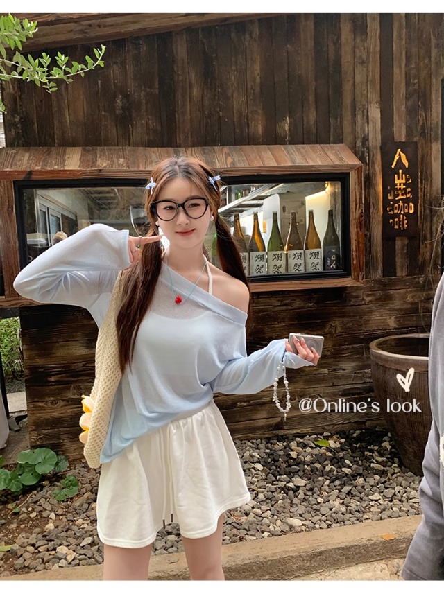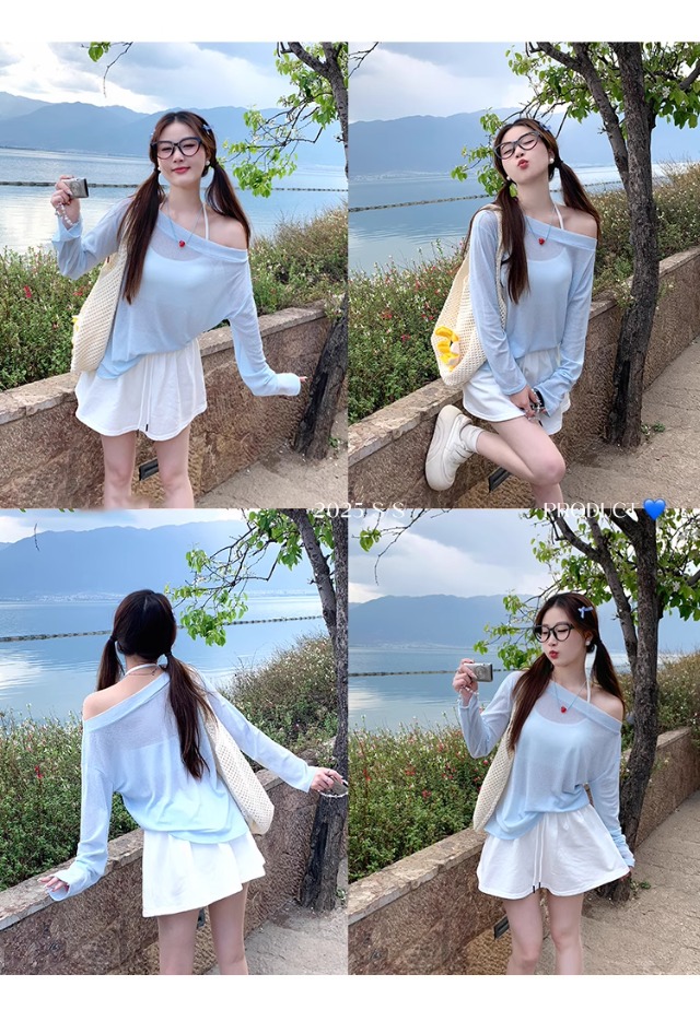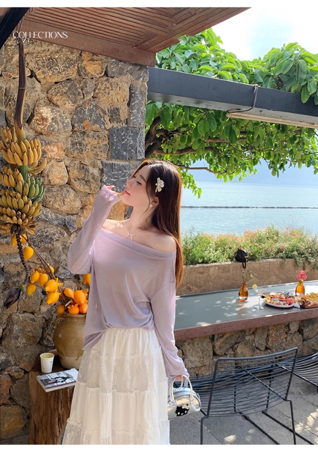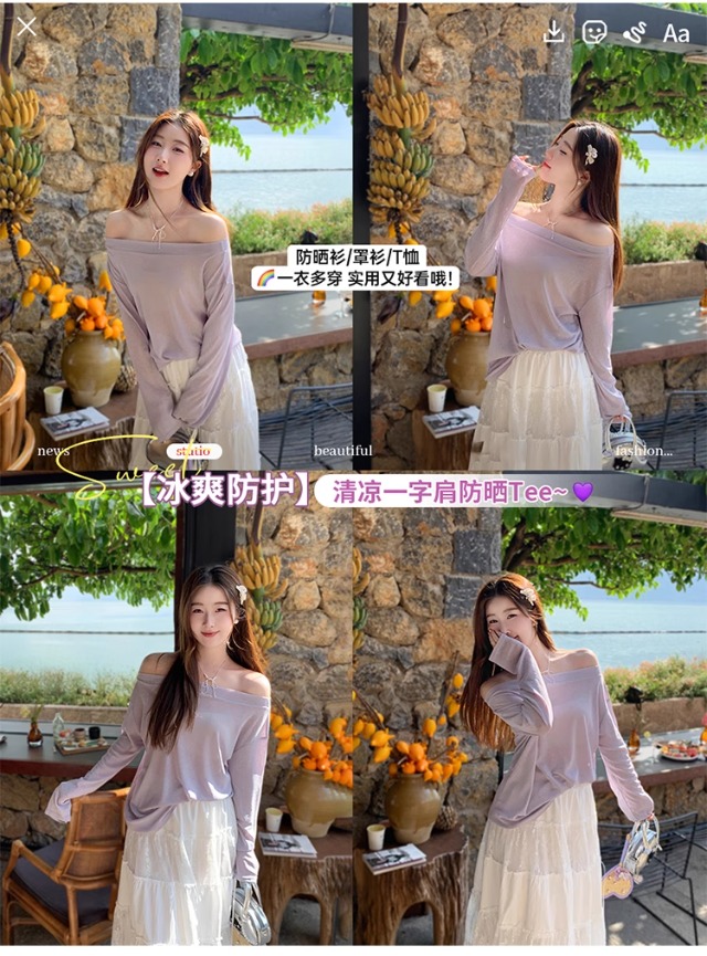 一字肩防晒罩衫女2026年夏季新款斜肩宽松显瘦慵懒风长袖t恤上衣